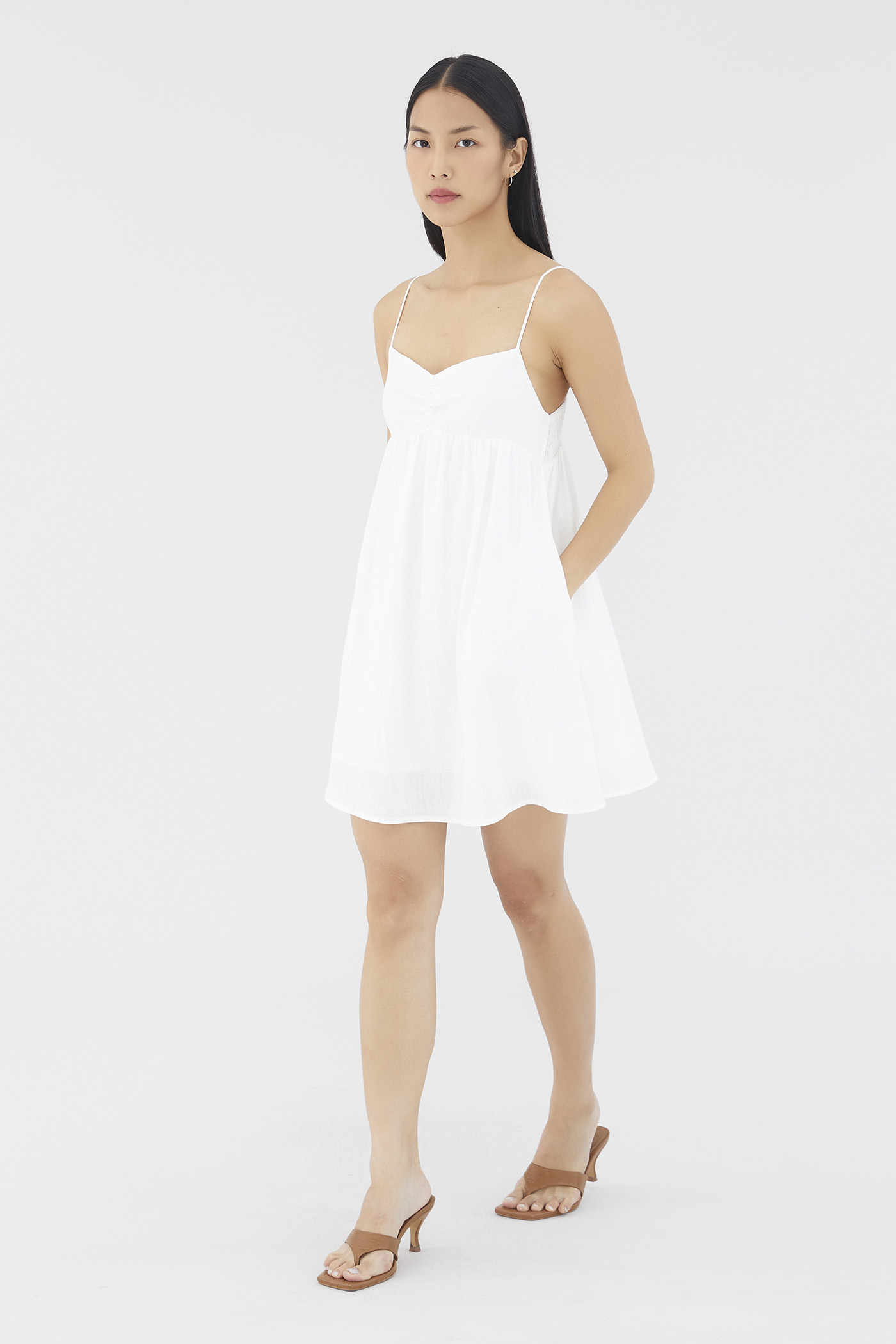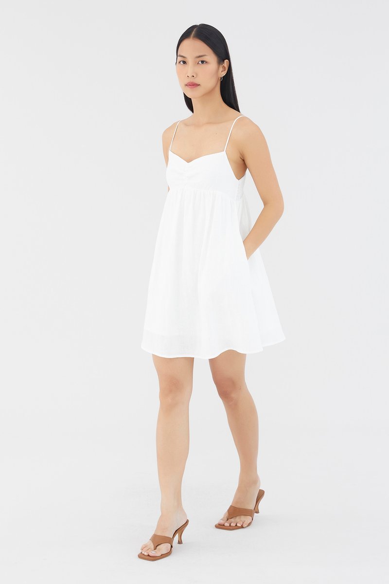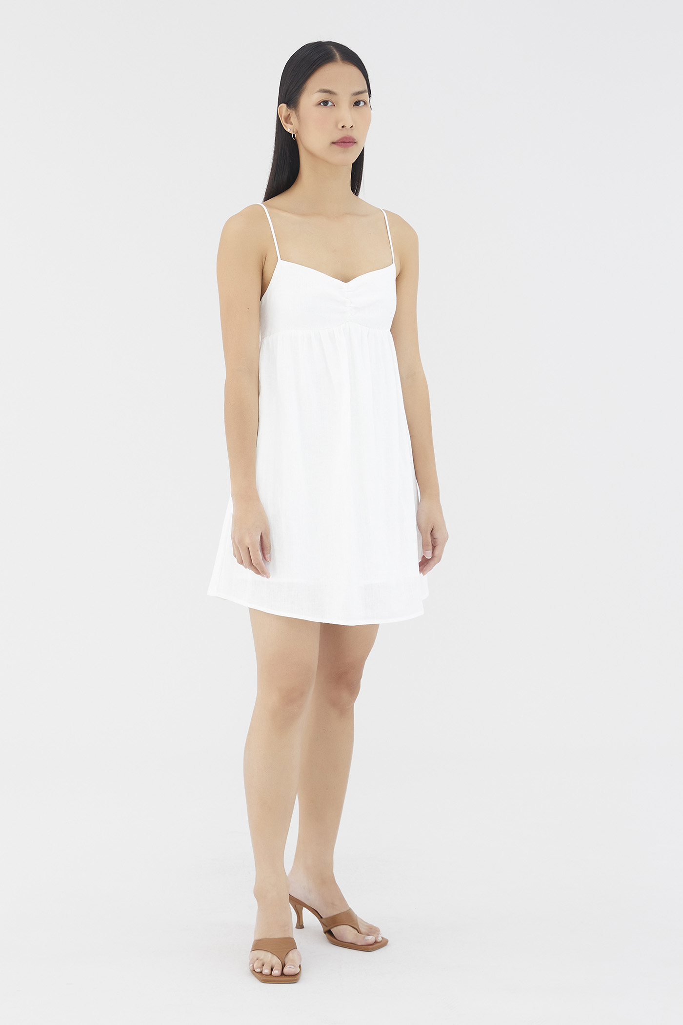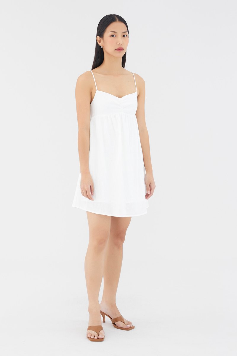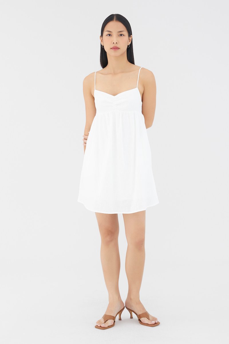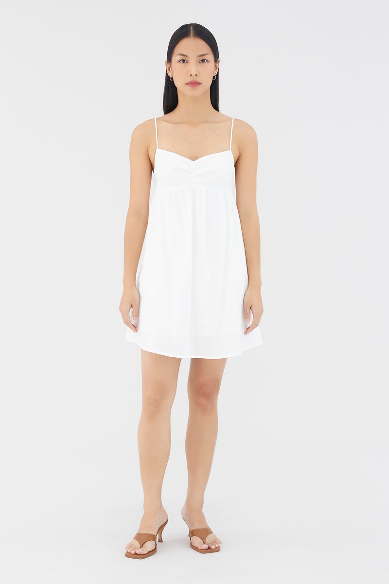 Warm weather approved. Cut from airy and lightweight 100% linen, this sleeveless mini dress features a dipped neckline, a ruched bust, slim non-adjustable shoulder straps, a smocked back and a side zip closure. Worn in an empire-waist silhouette that fits slimmer at the bust before flaring out in a relaxed skirt.