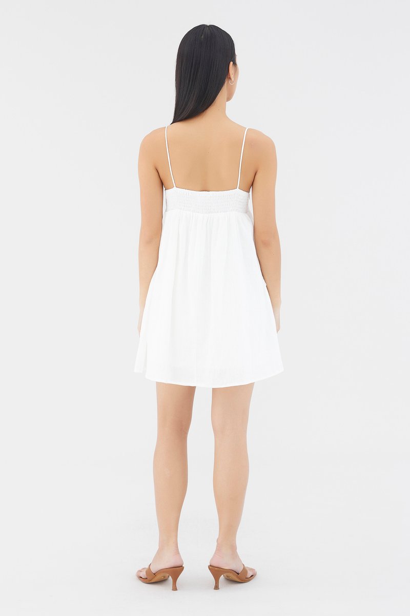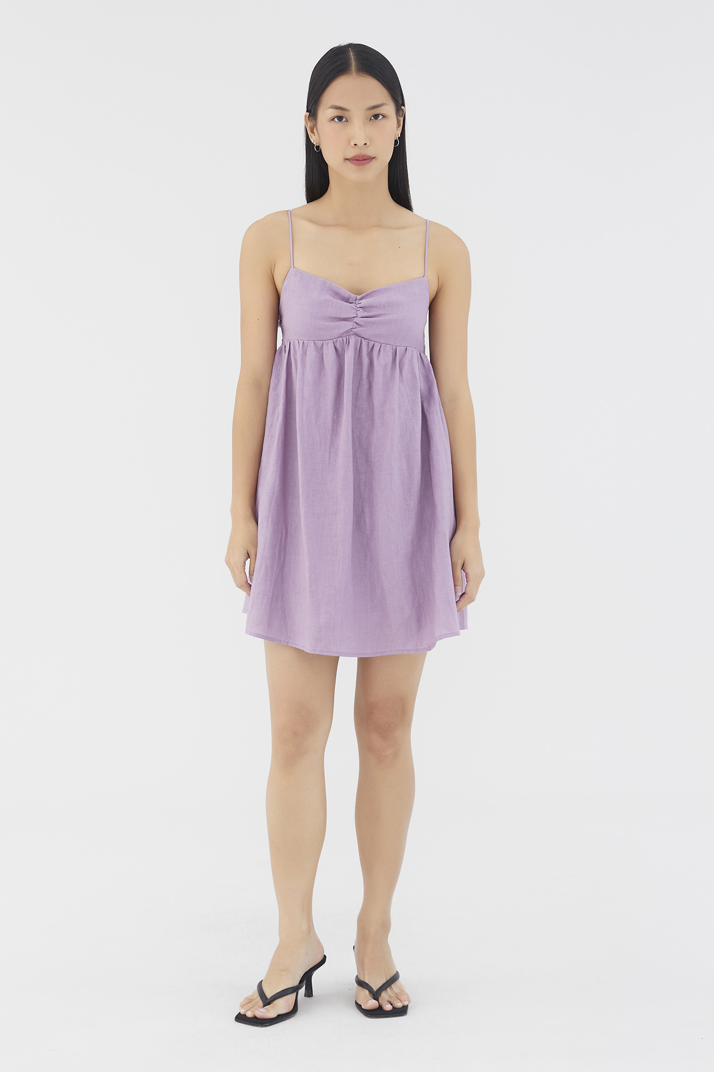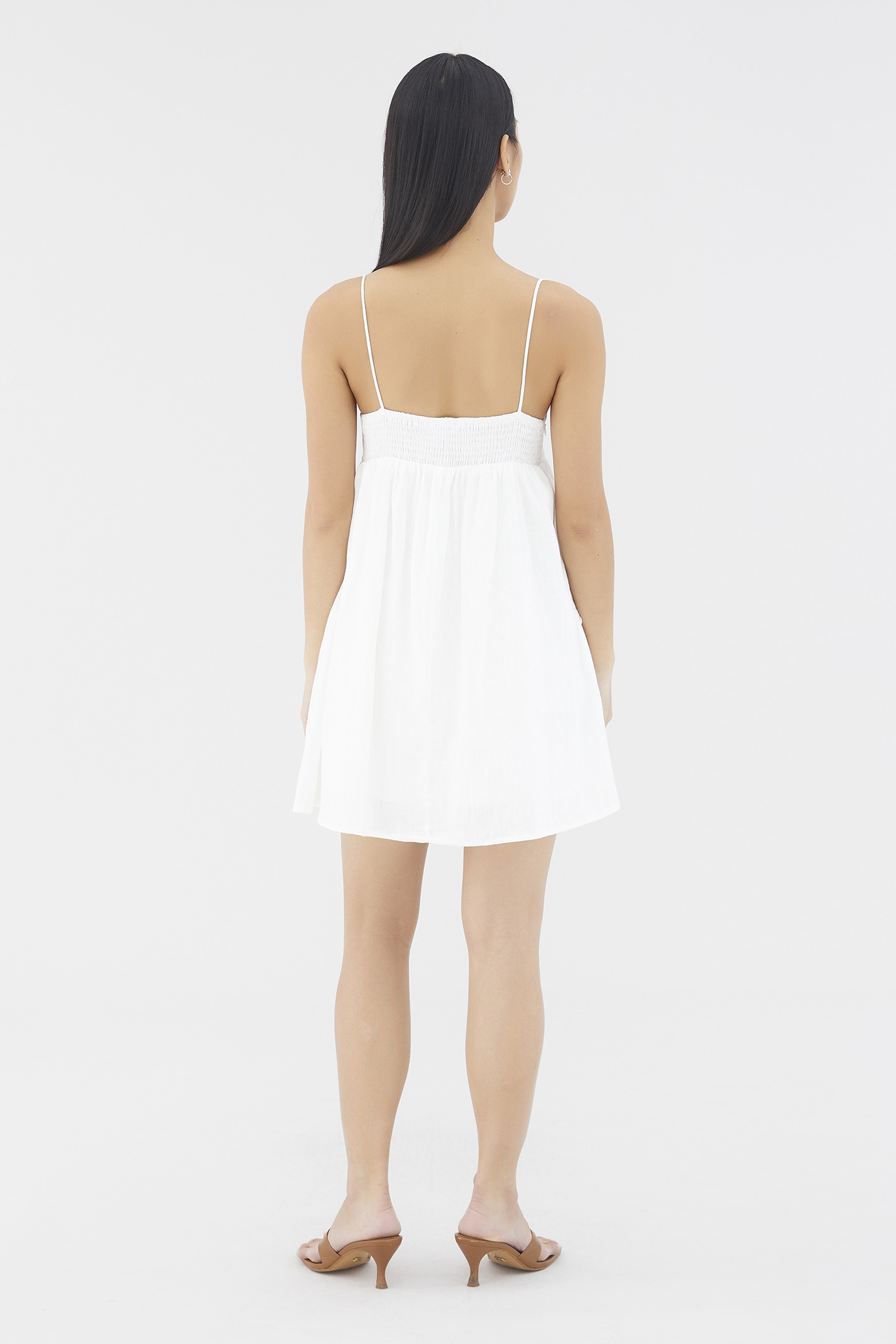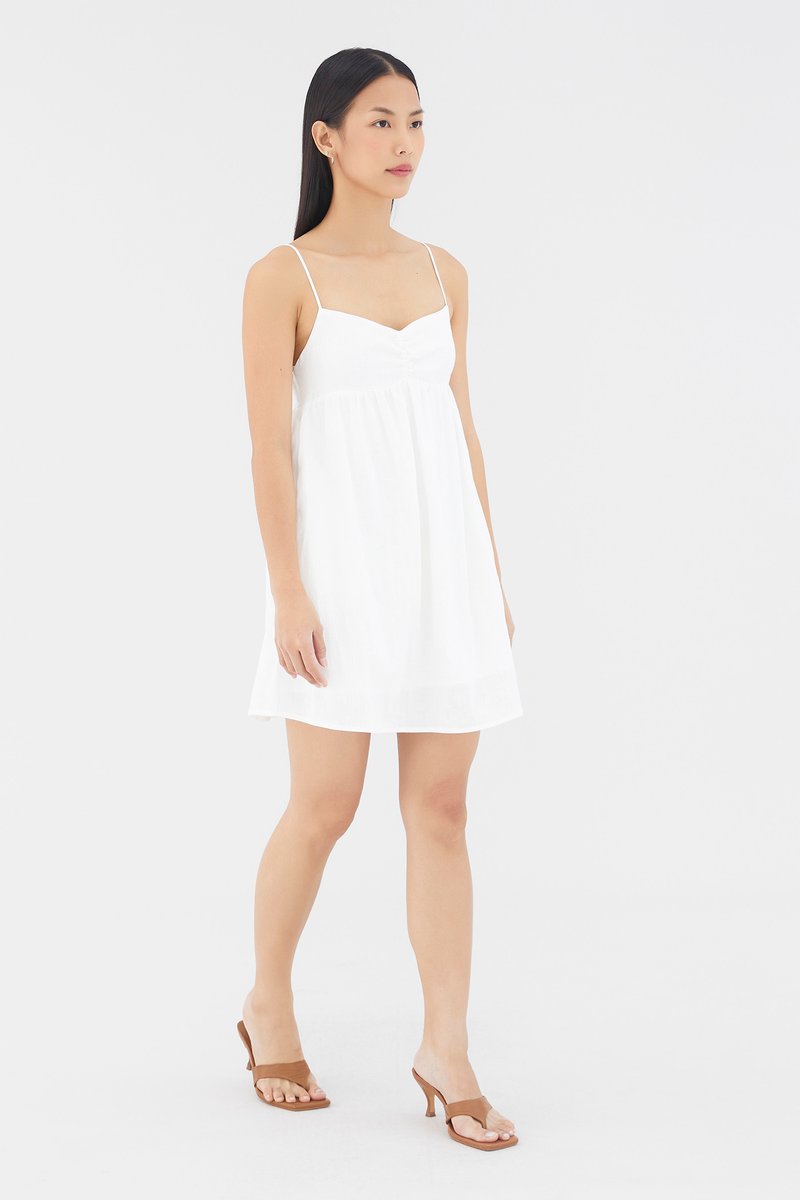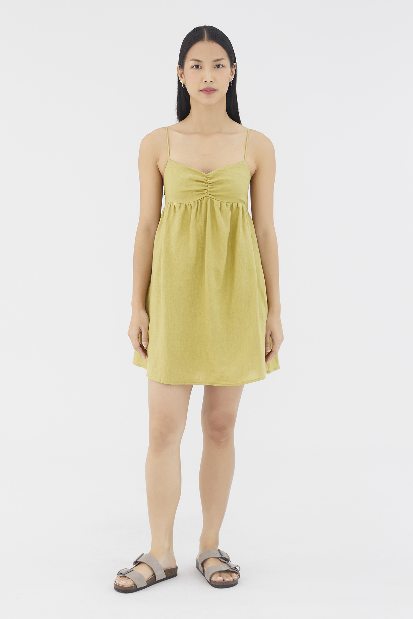 Warm weather approved. Cut from airy and lightweight 100% linen, this sleeveless mini dress features a dipped neckline, a ruched bust, slim non-adjustable shoulder straps, a smocked back and a side zip closure. Worn in an empire-waist silhouette that fits slimmer at the bust before flaring out in a relaxed skirt.