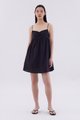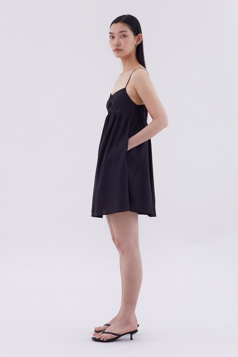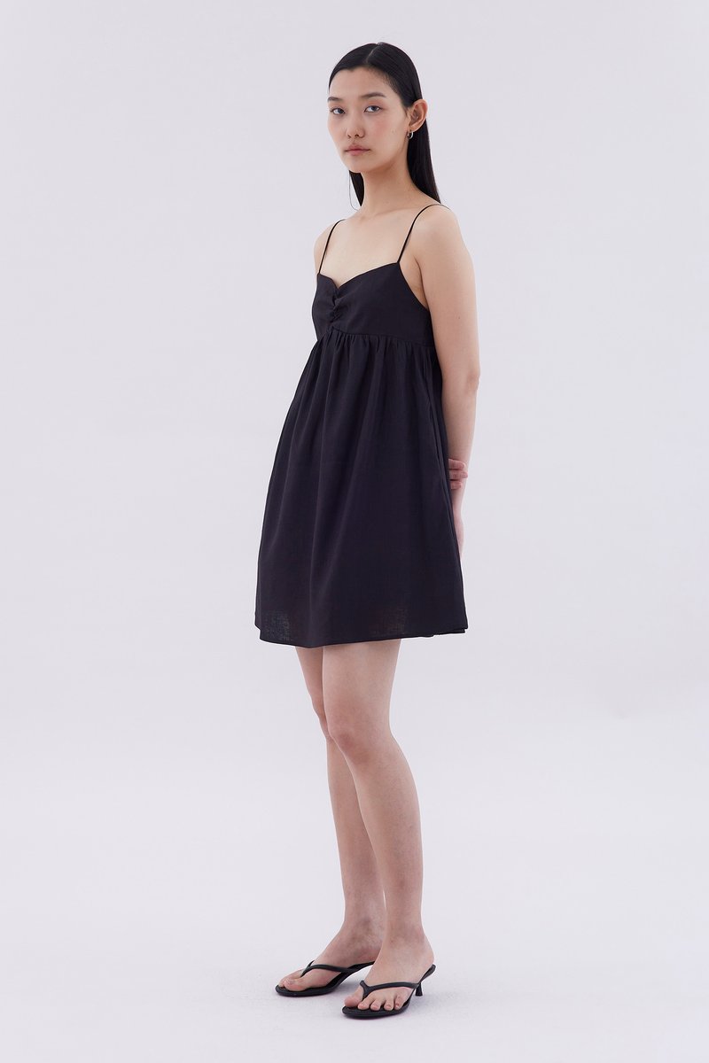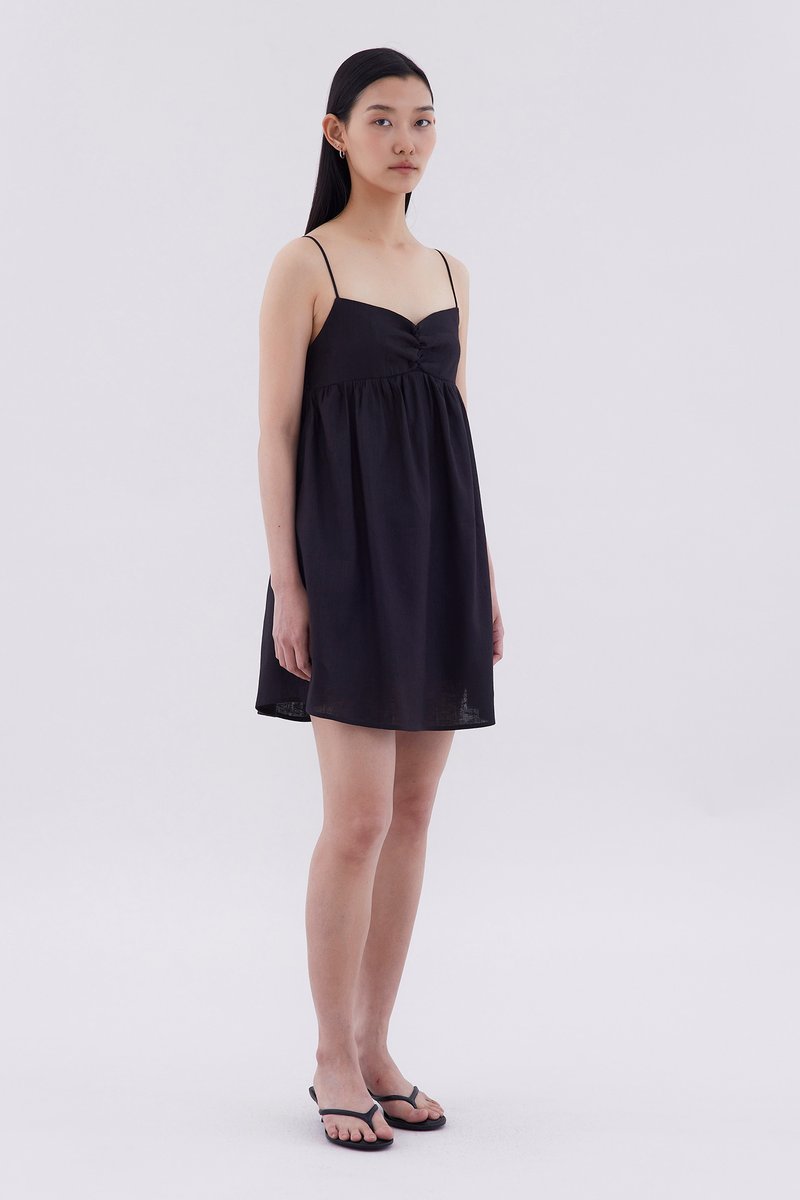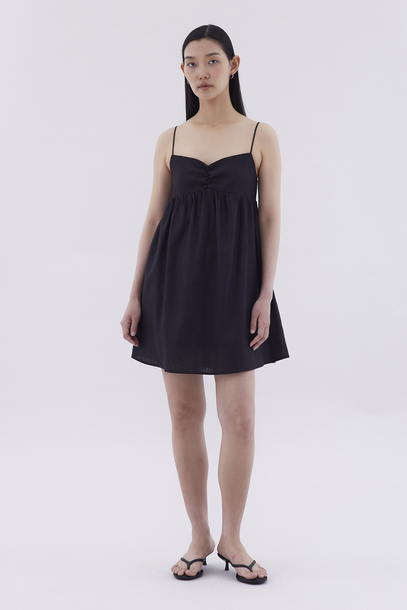 Warm weather approved. Cut from airy and lightweight 100% linen, this sleeveless mini dress features a dipped neckline, a ruched bust, slim non-adjustable shoulder straps, a smocked back and a side zip closure. Worn in an empire-waist silhouette that fits slimmer at the bust before flaring out in a relaxed skirt.
