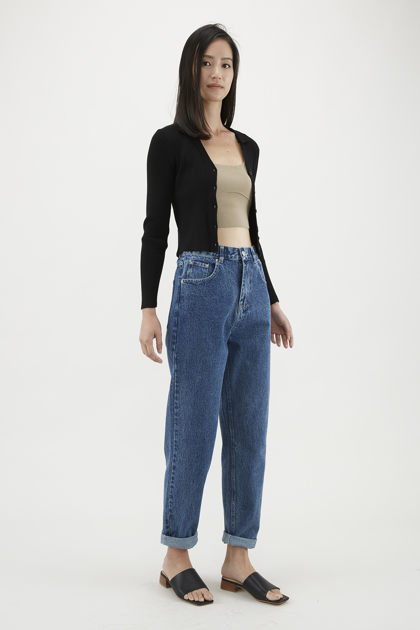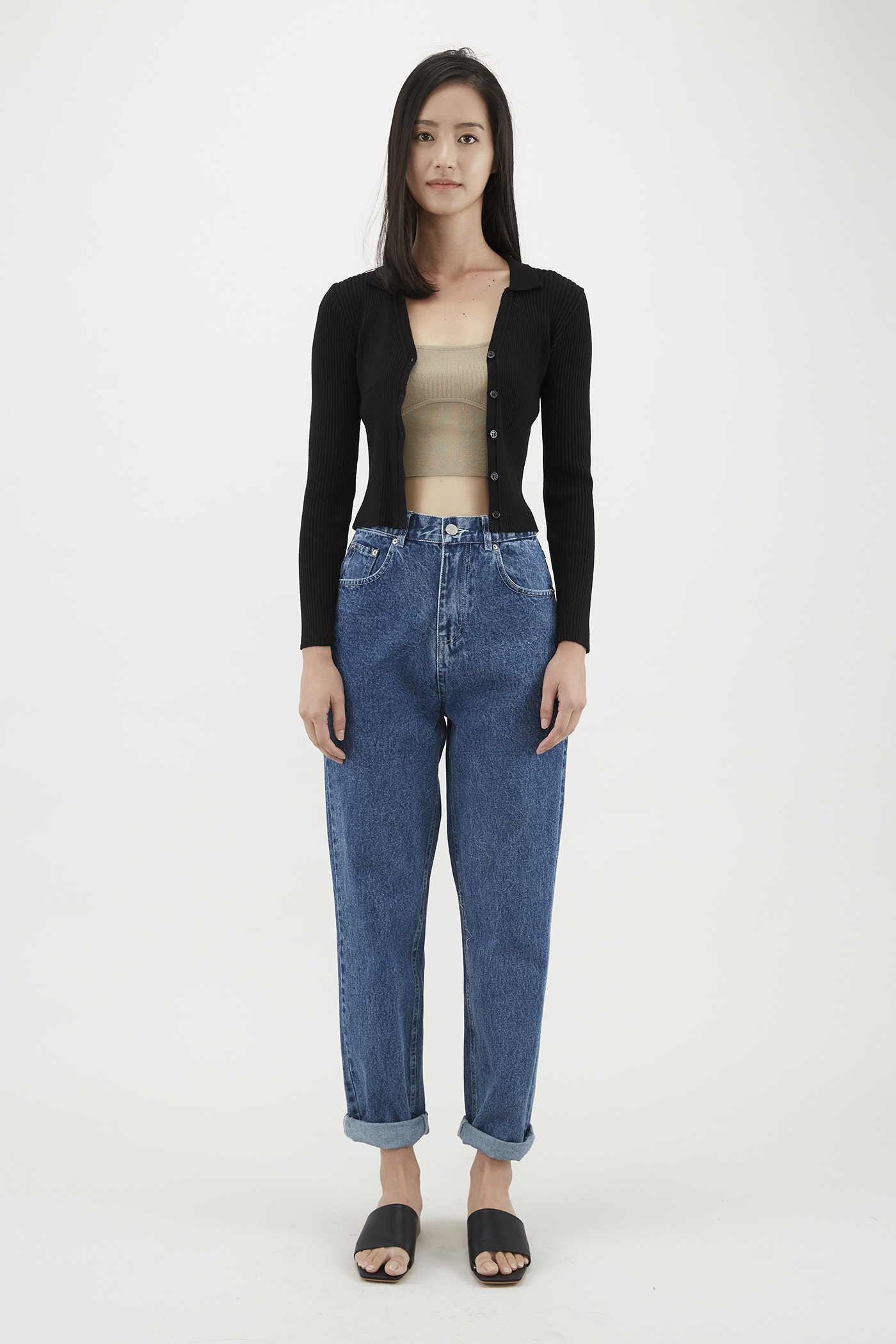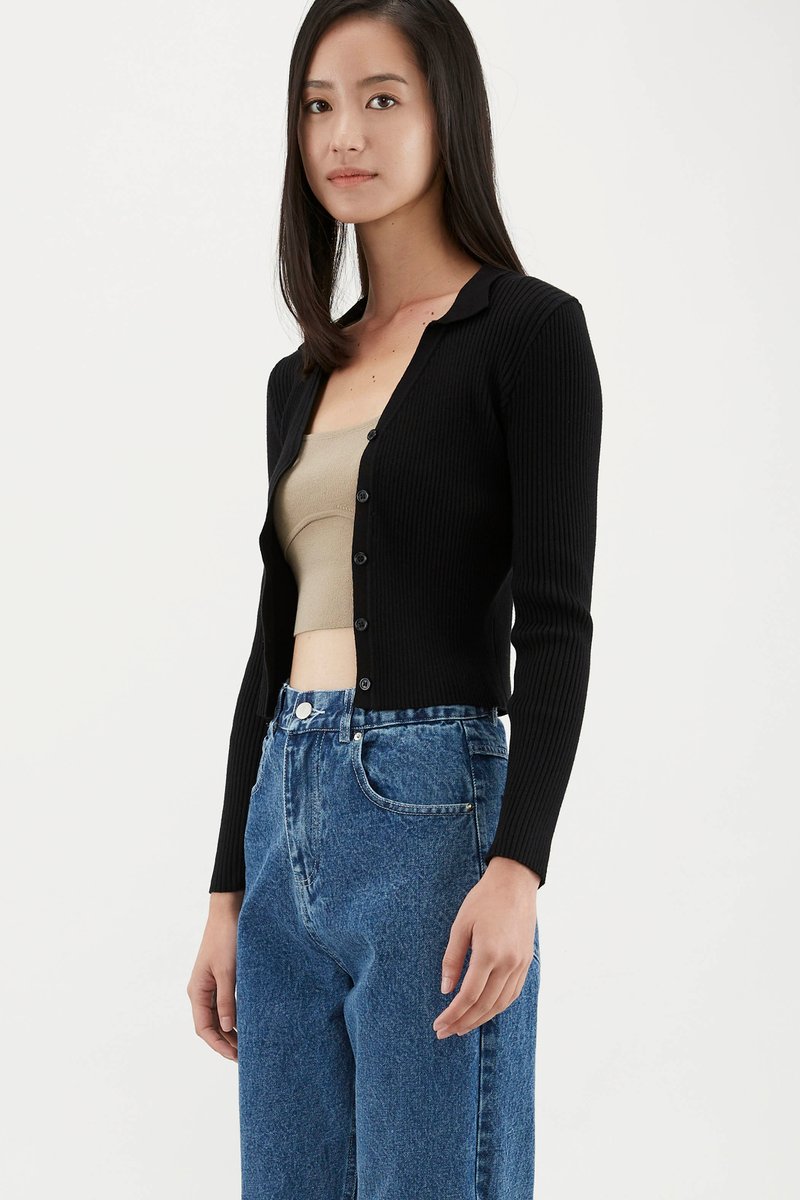 Another one for the knit essentials. Made from soft and stretchy ribbed fabric, this cardigan features slim long sleeves, a front button closure and a collared, V-neckline. Fits snug.