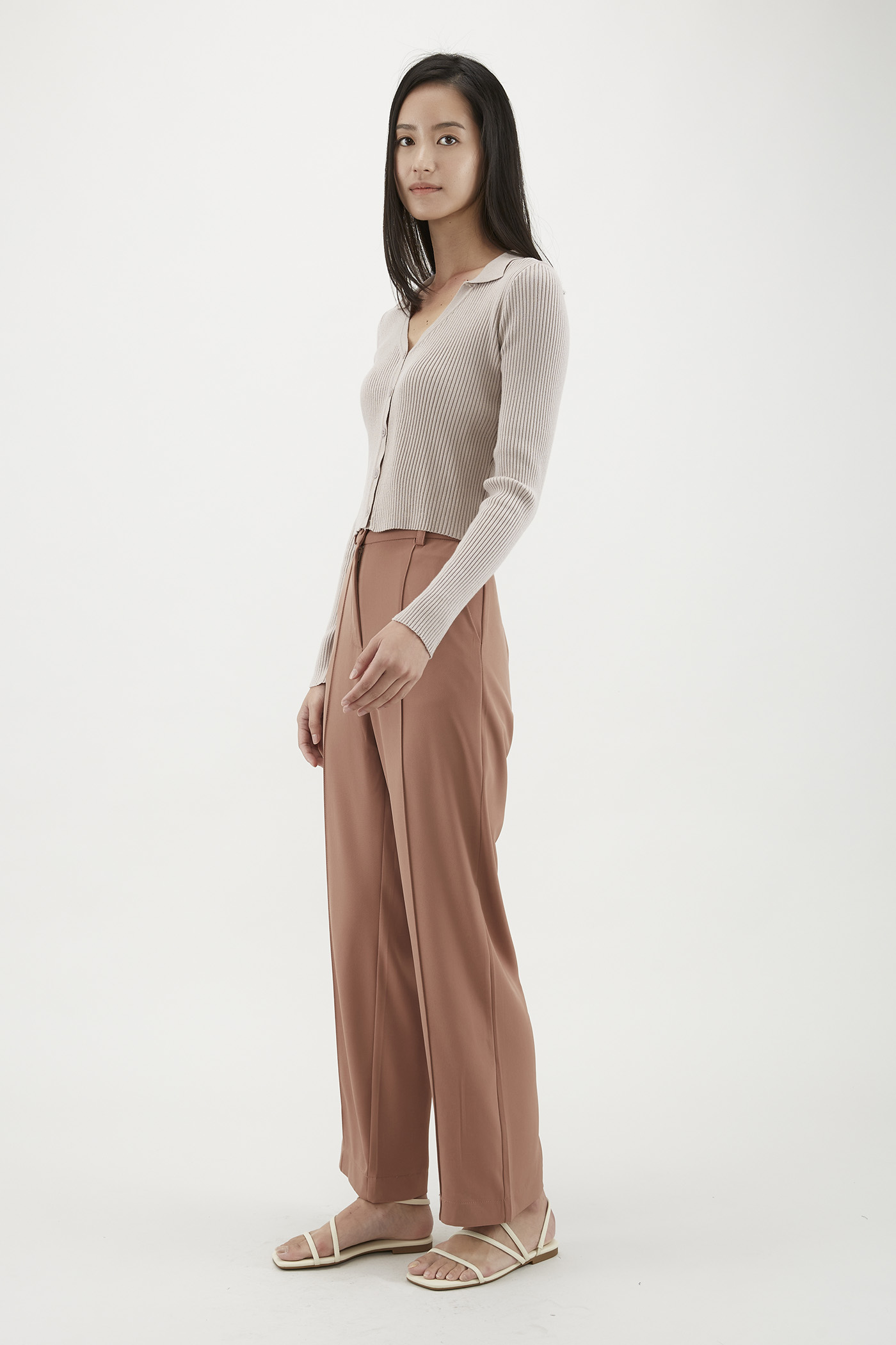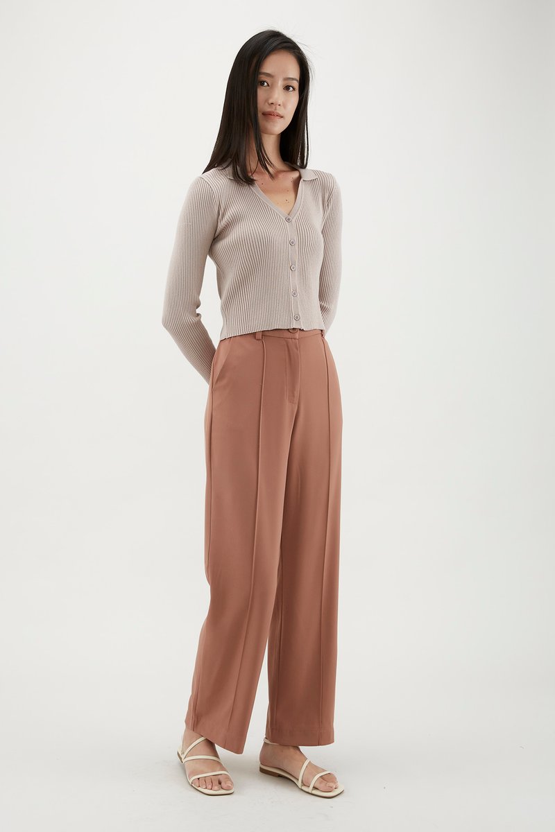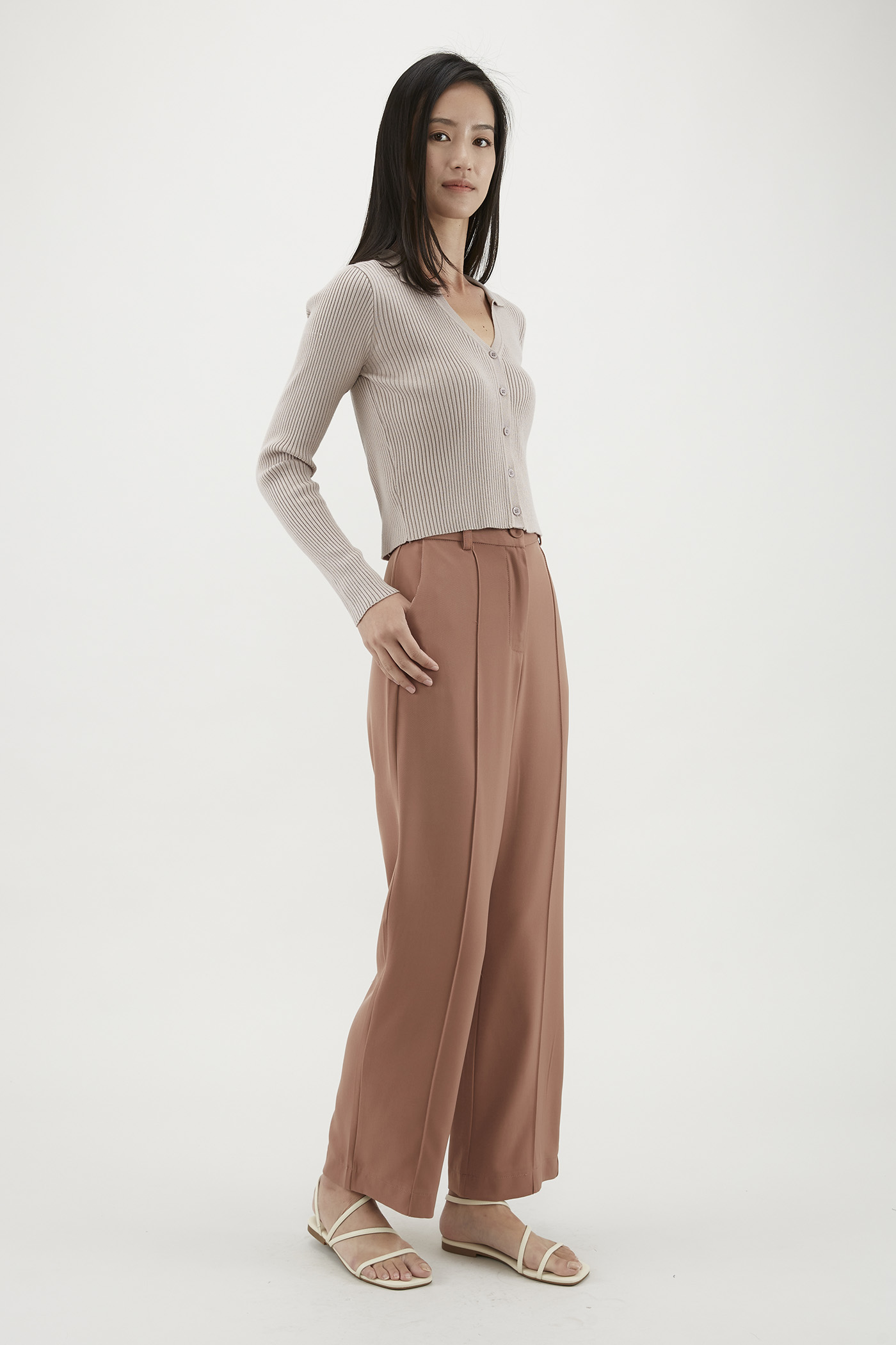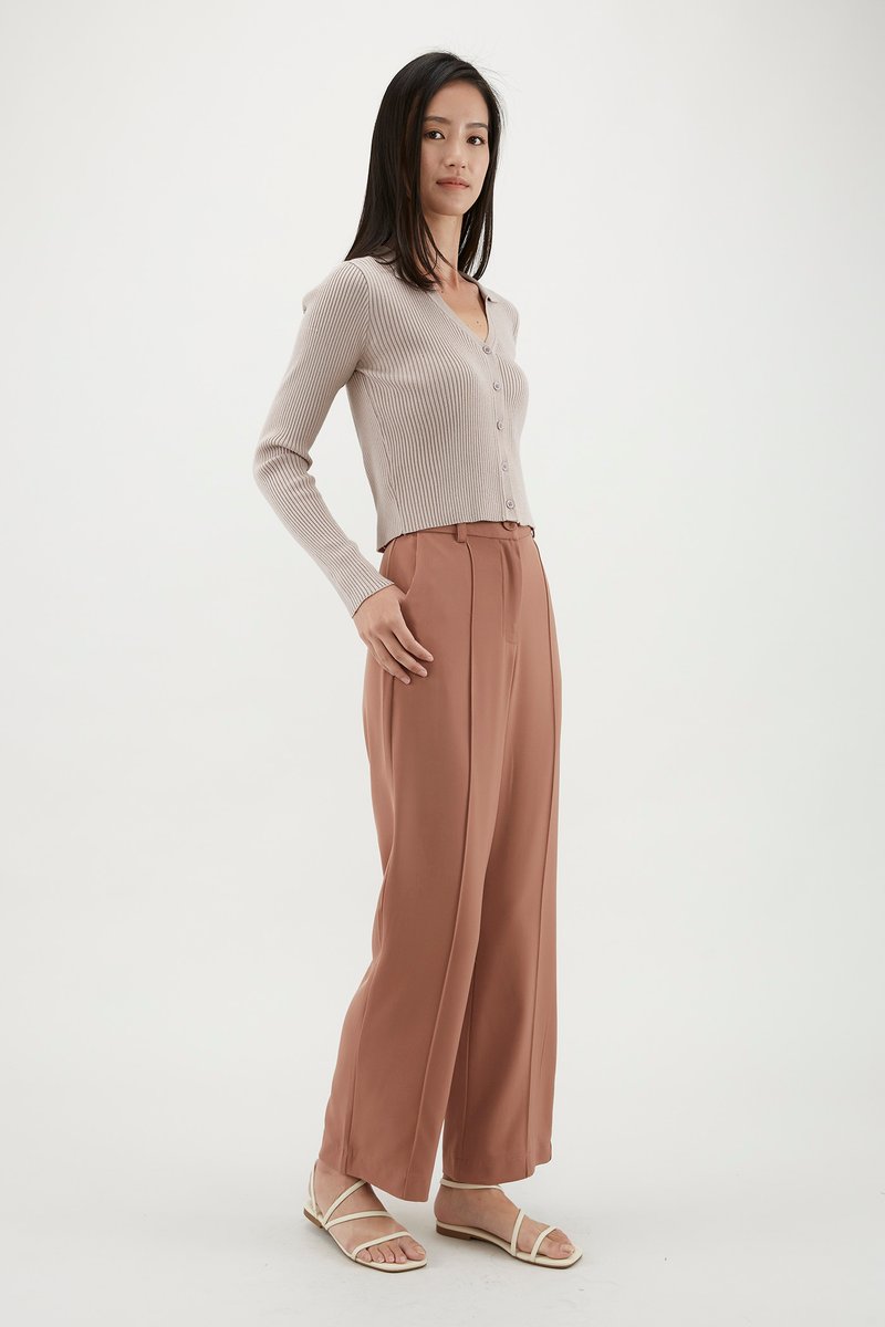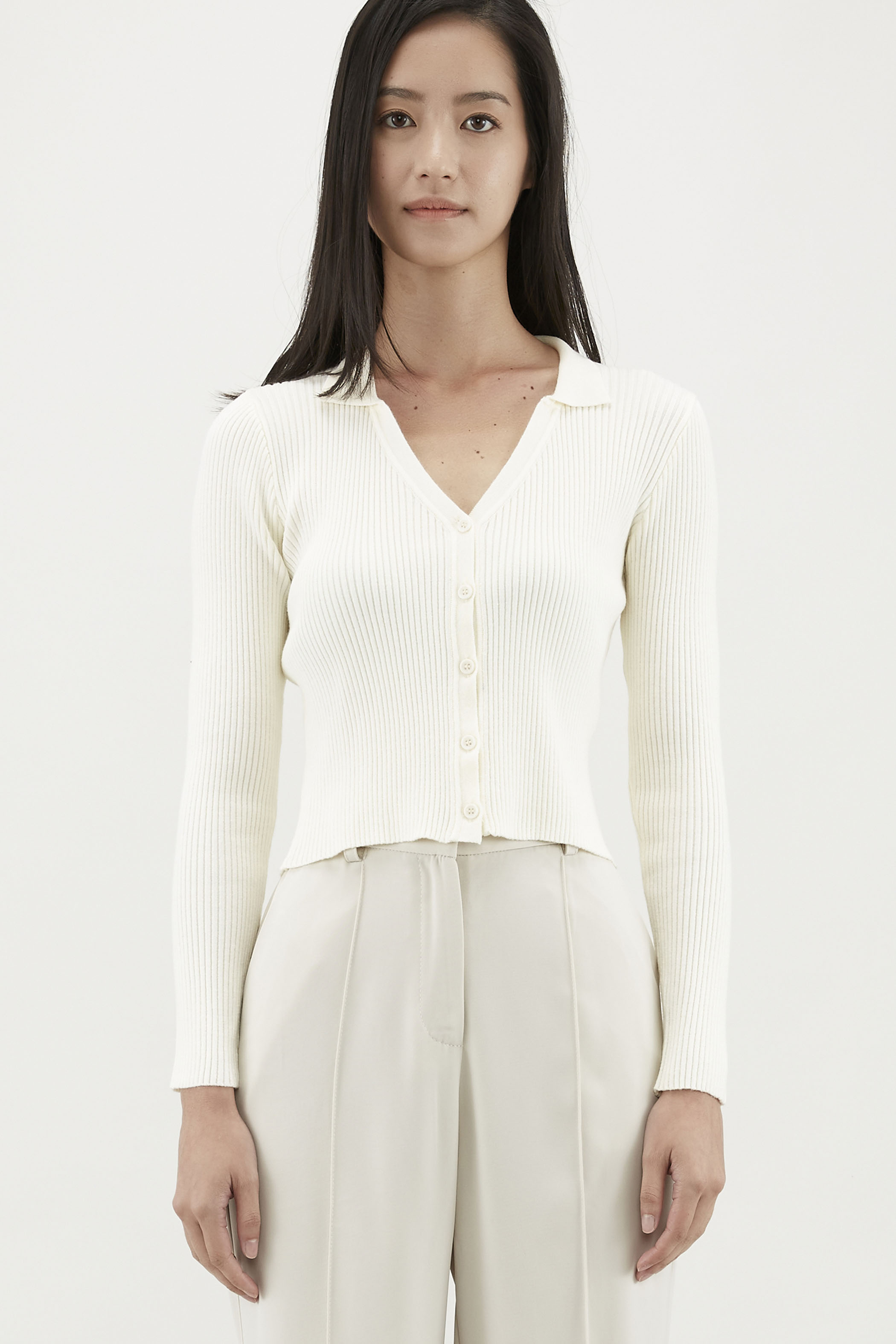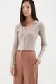 Another one for the knit essentials. Made from soft and stretchy ribbed fabric, this cardigan features slim long sleeves, a front button closure and a collared, V-neckline. Fits snug.