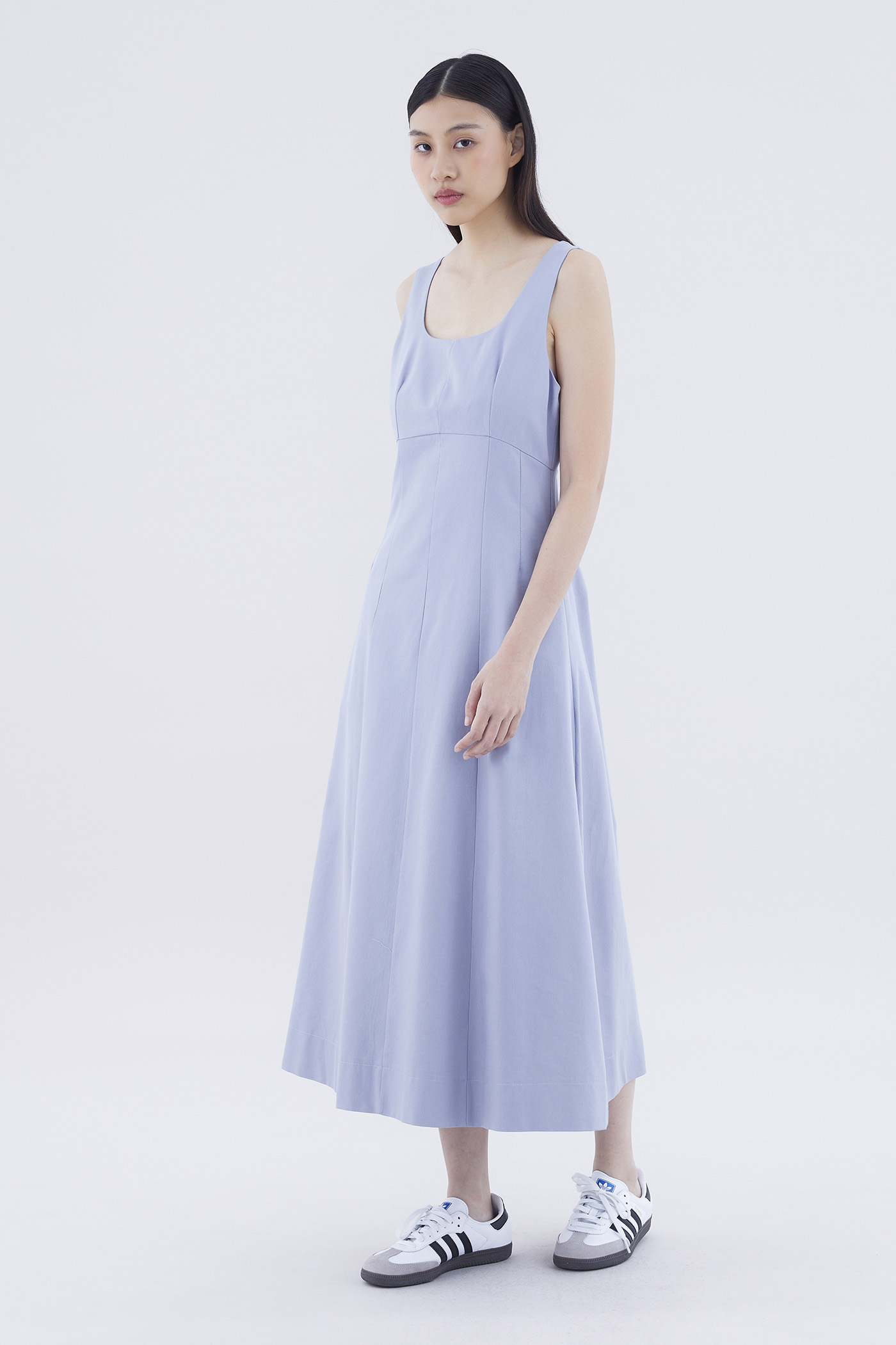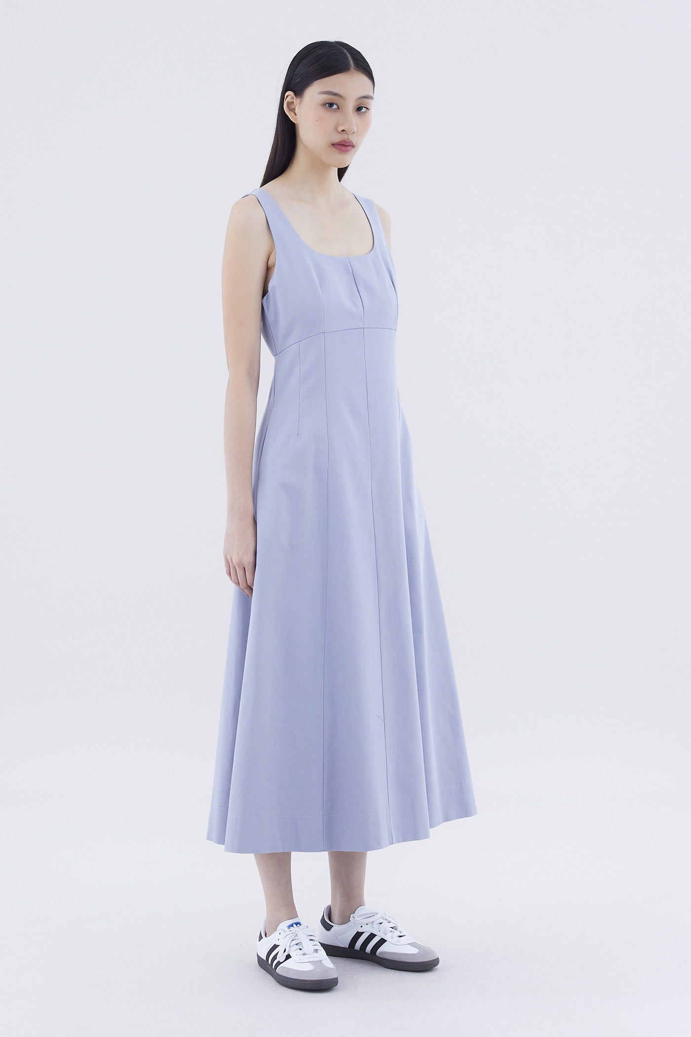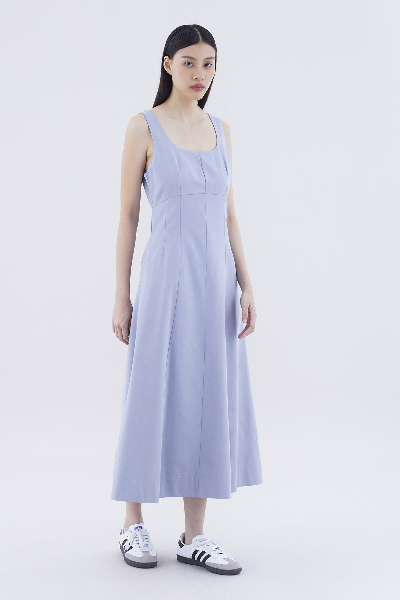 One and done. Cut from crisp and gently tailored fabric, this sleeveless maxi dress features panelling, wide shoulder straps, an angular neckline and a subtle empire-waist silhouette. Fits slim with a back zip closure.