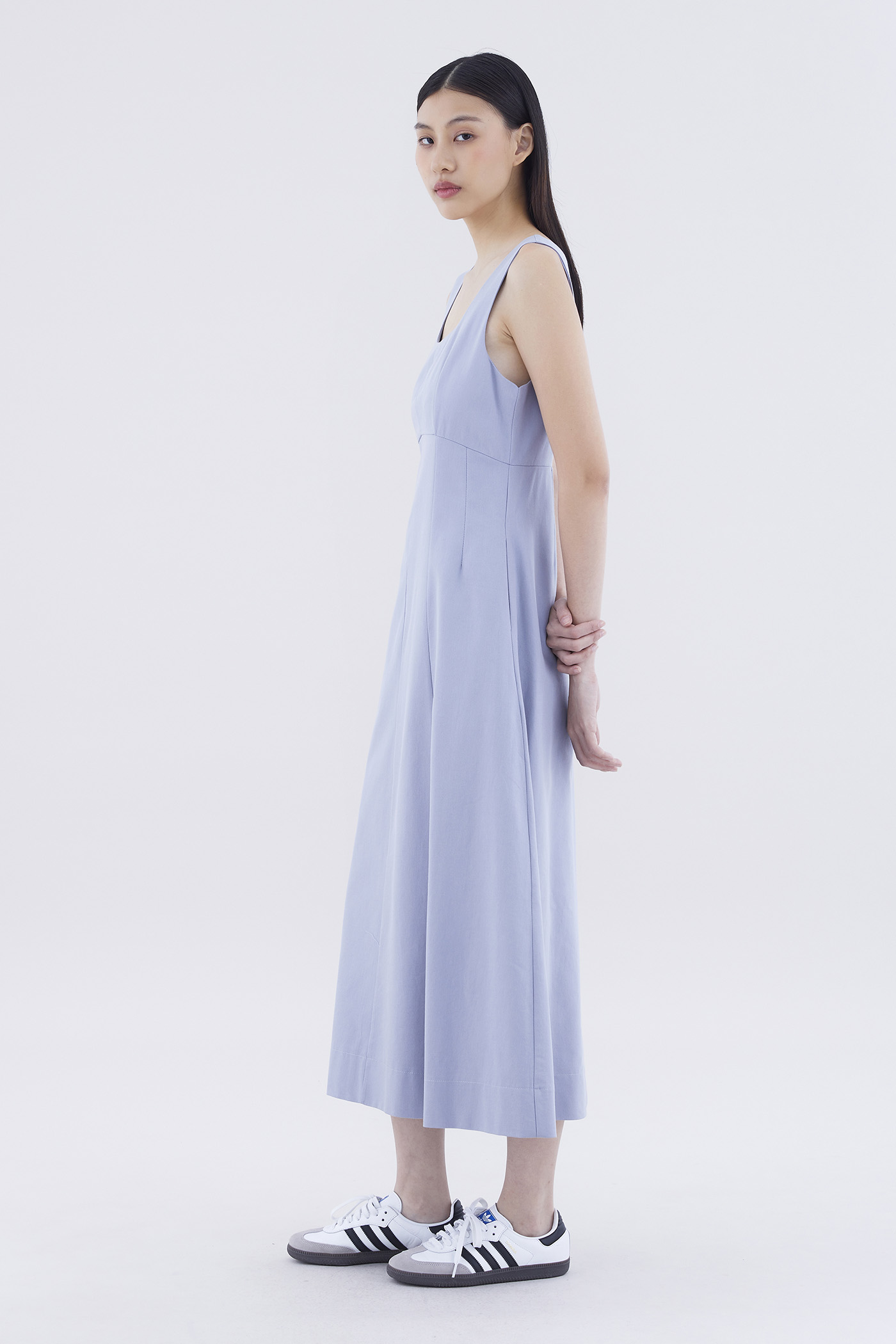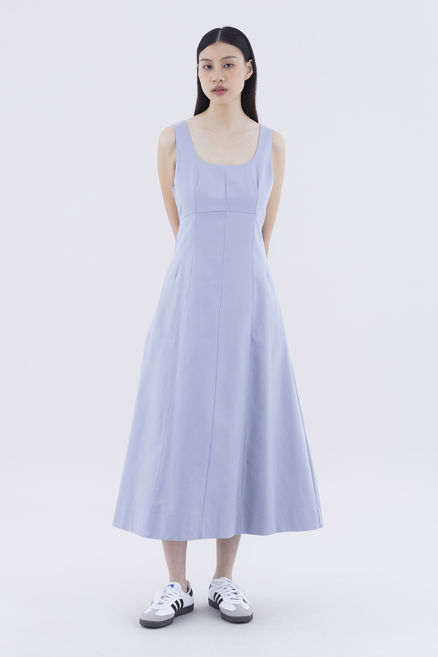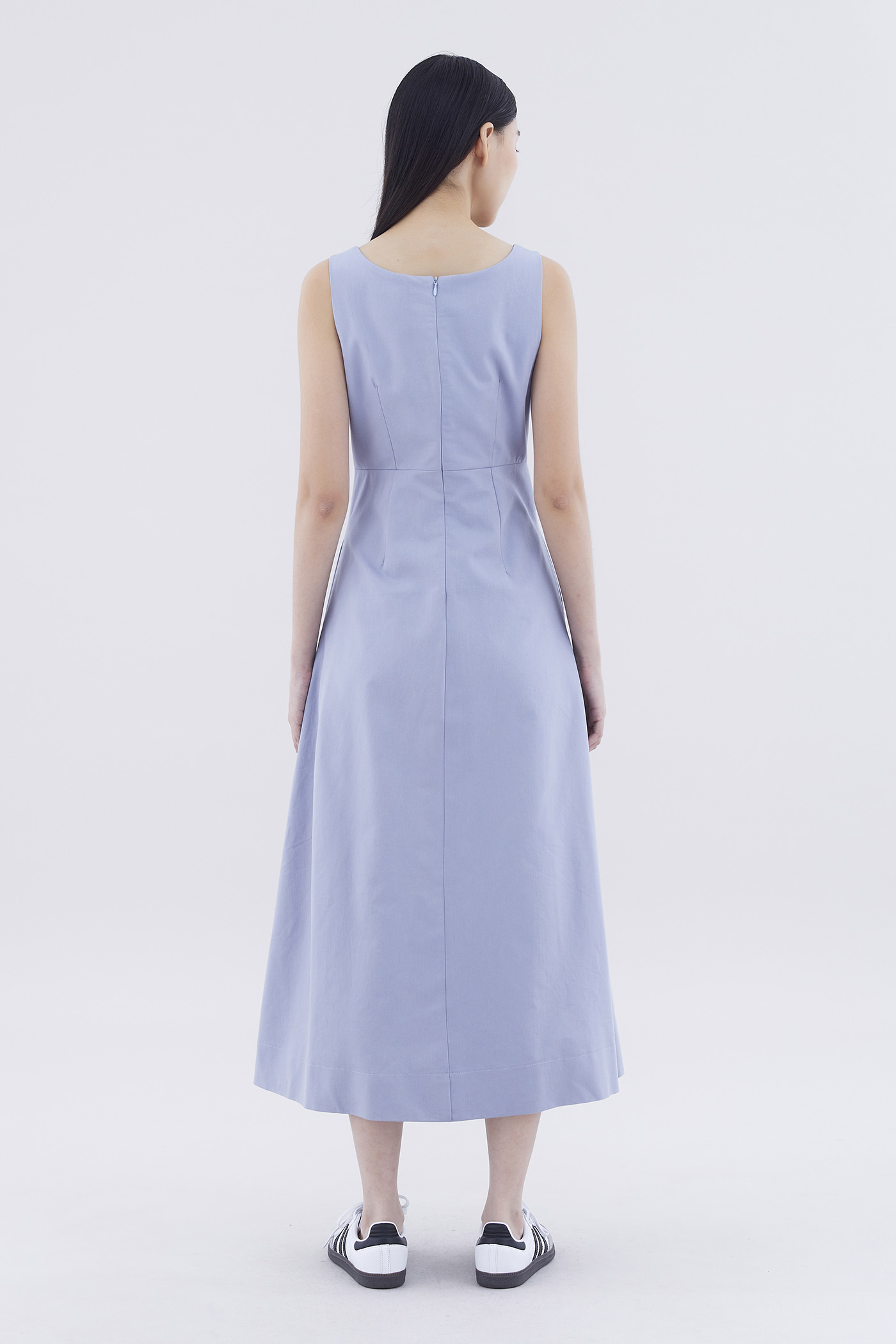 One and done. Cut from crisp and gently tailored fabric, this sleeveless maxi dress features panelling, wide shoulder straps, an angular neckline and a subtle empire-waist silhouette. Fits slim with a back zip closure.