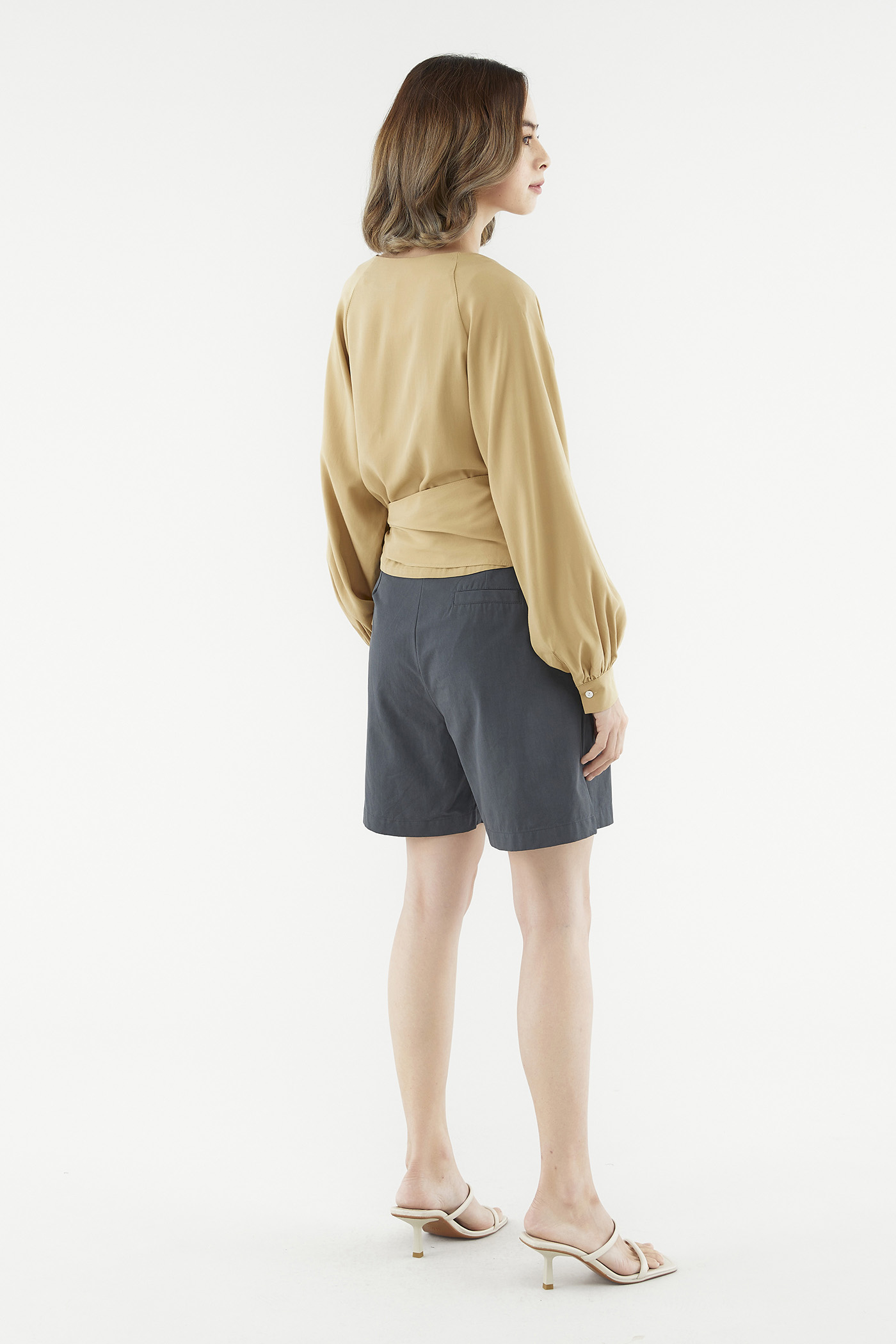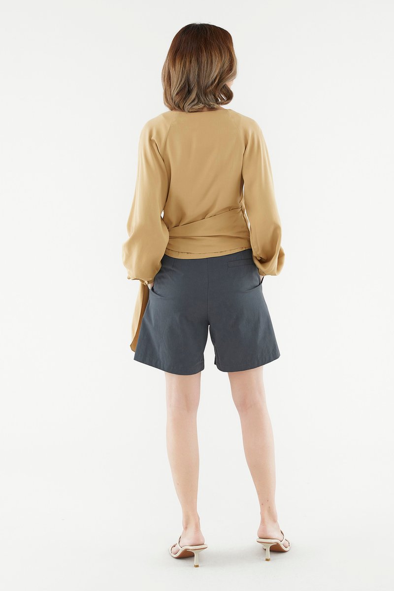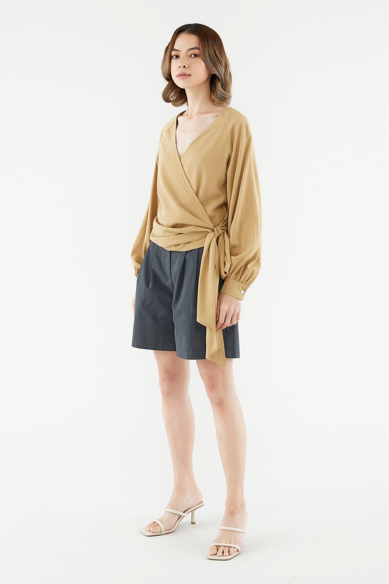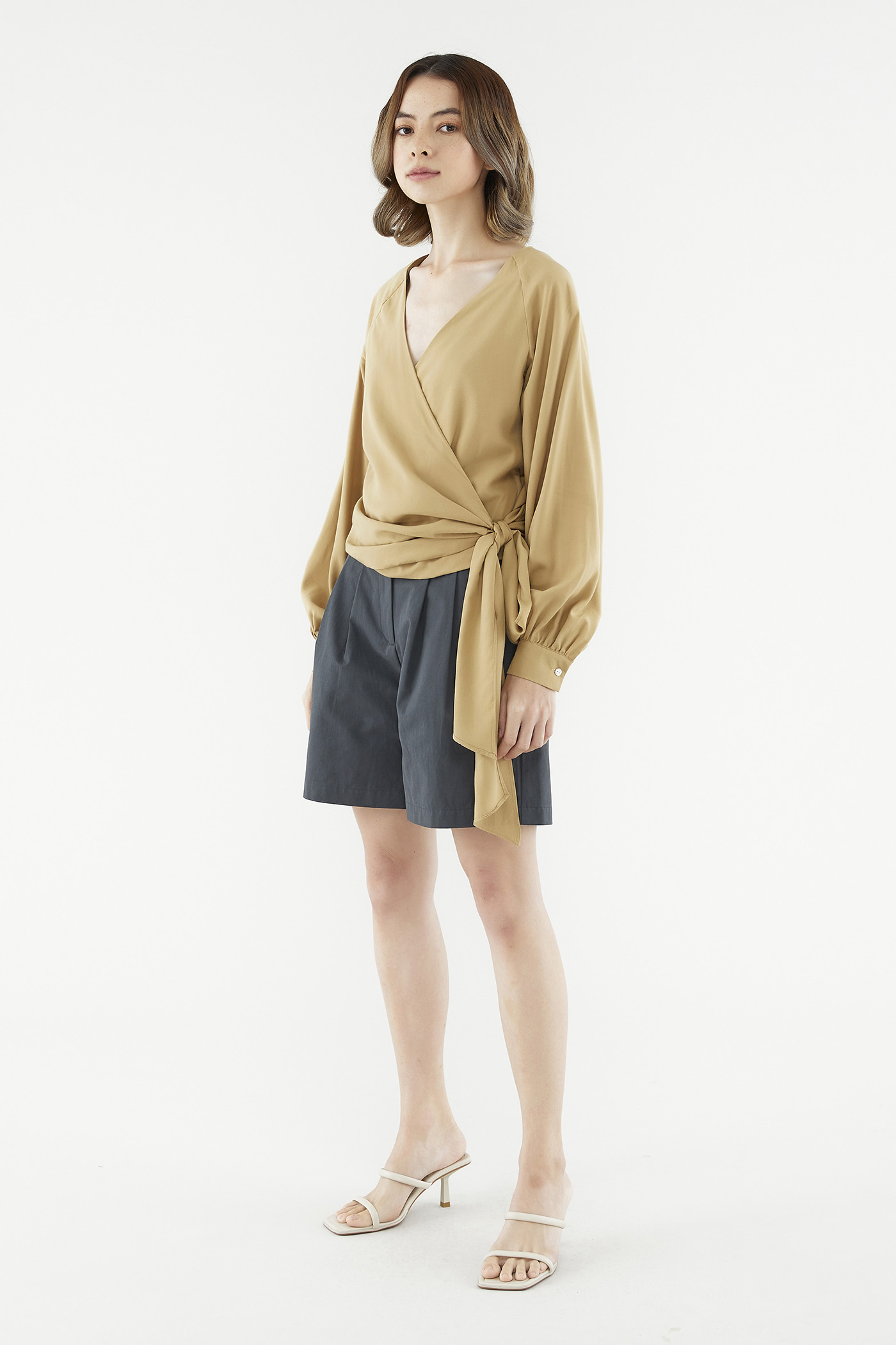Wrapped and polished. Made from soft and lightweight fabric, this V-neck top features a fully lined bodice, long cuffed sleeves and a wrap front with a self-tie closure. Worn in a slim fit.