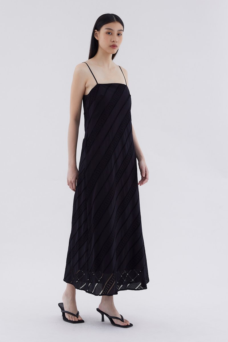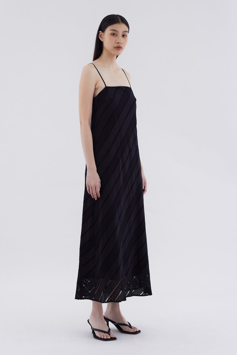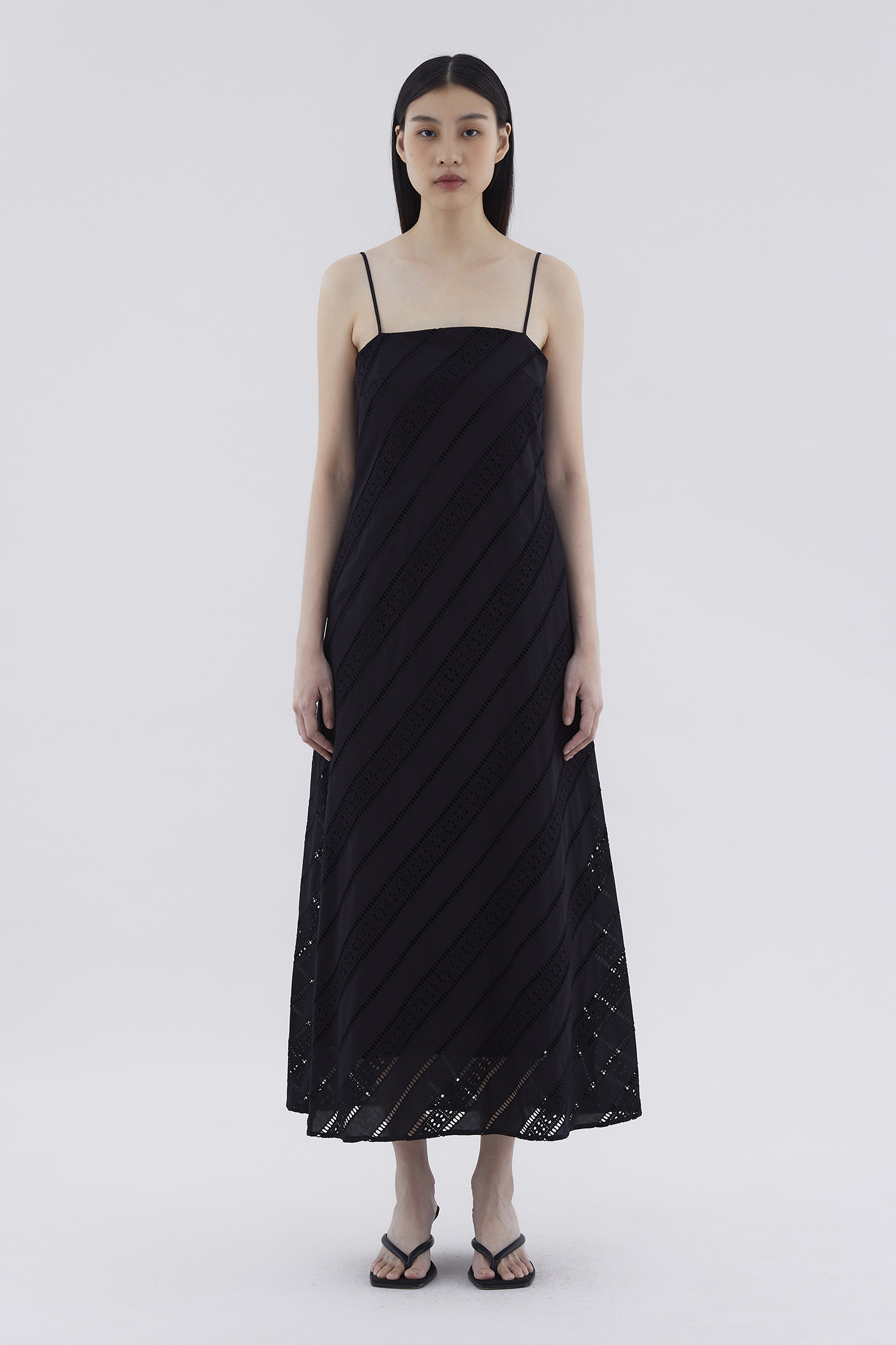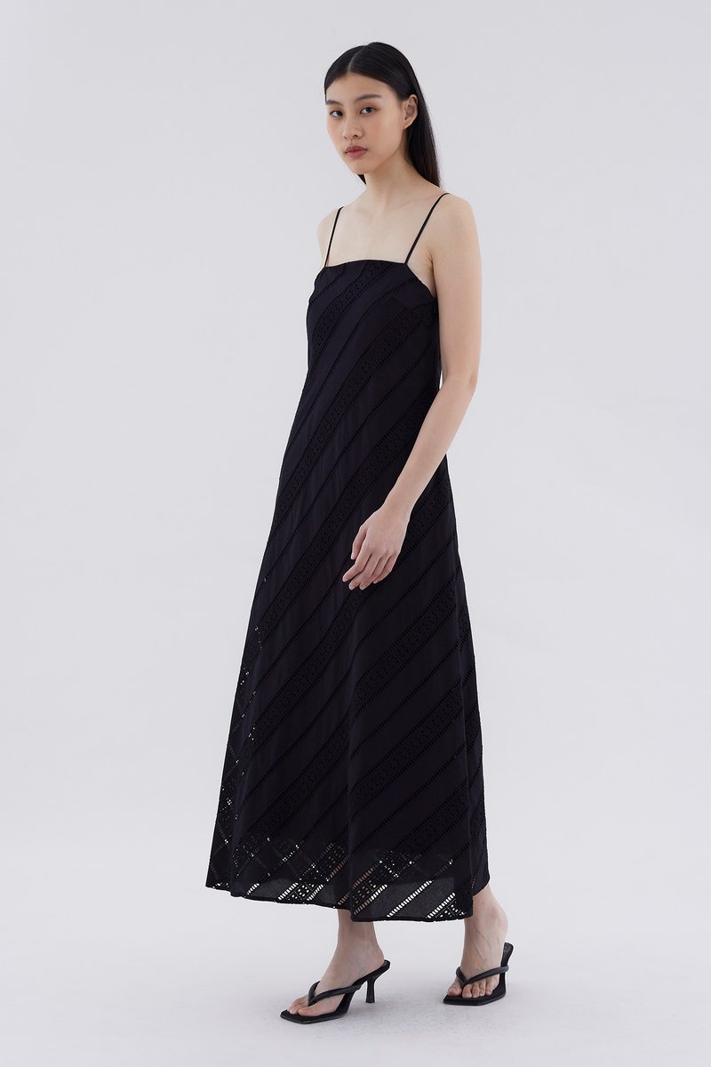 Subtle. Cut from softly structured broderie cotton, this sleeveless maxi dress features slim non-adjustable shoulder straps, a straight neckline and a side zip closure. Worn in a relaxed fit.