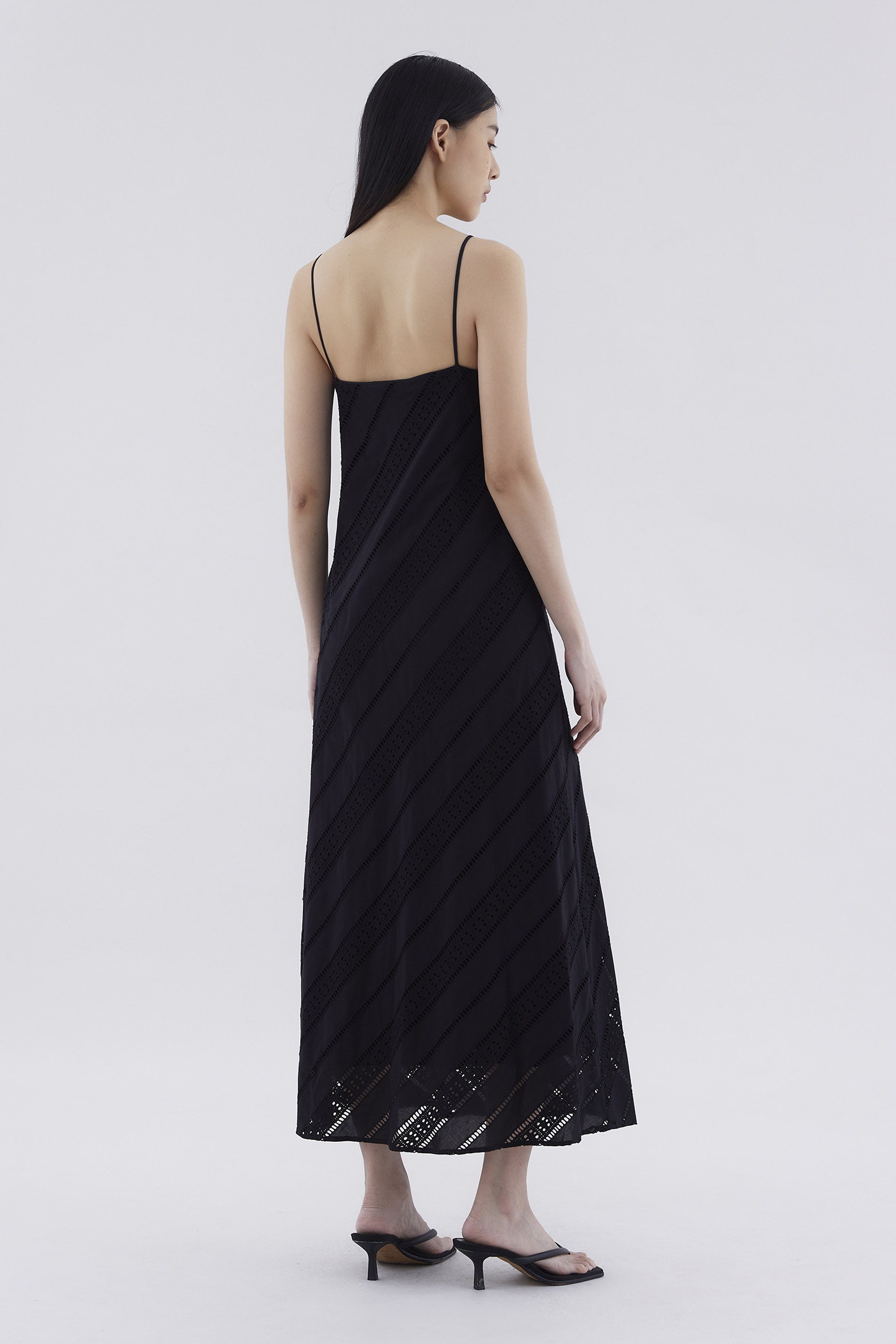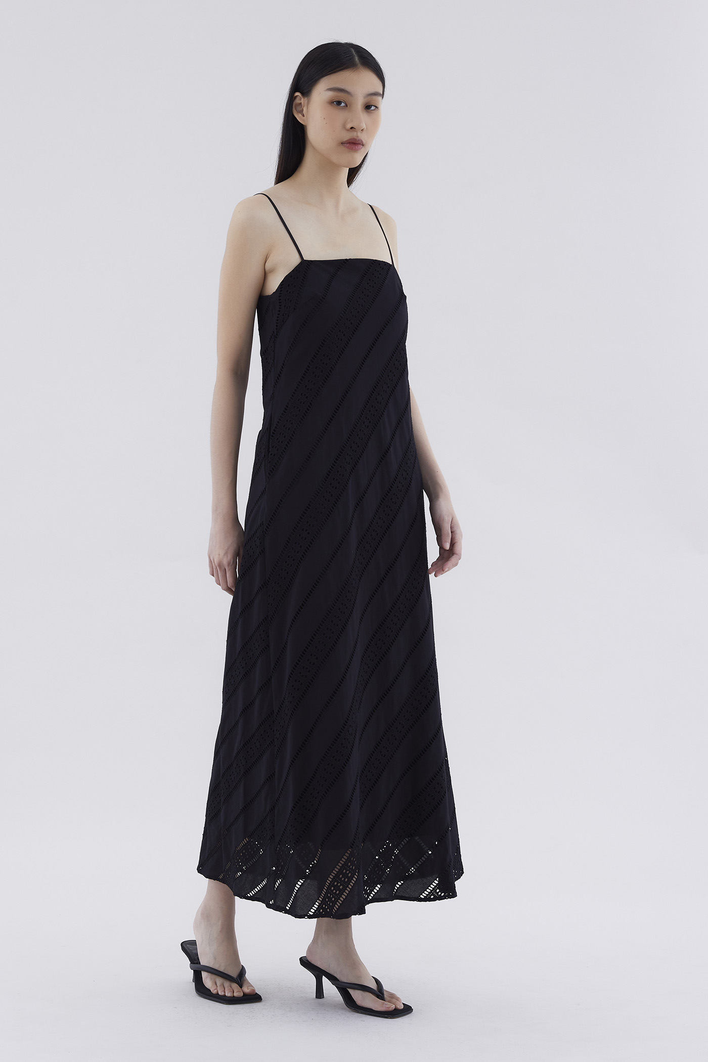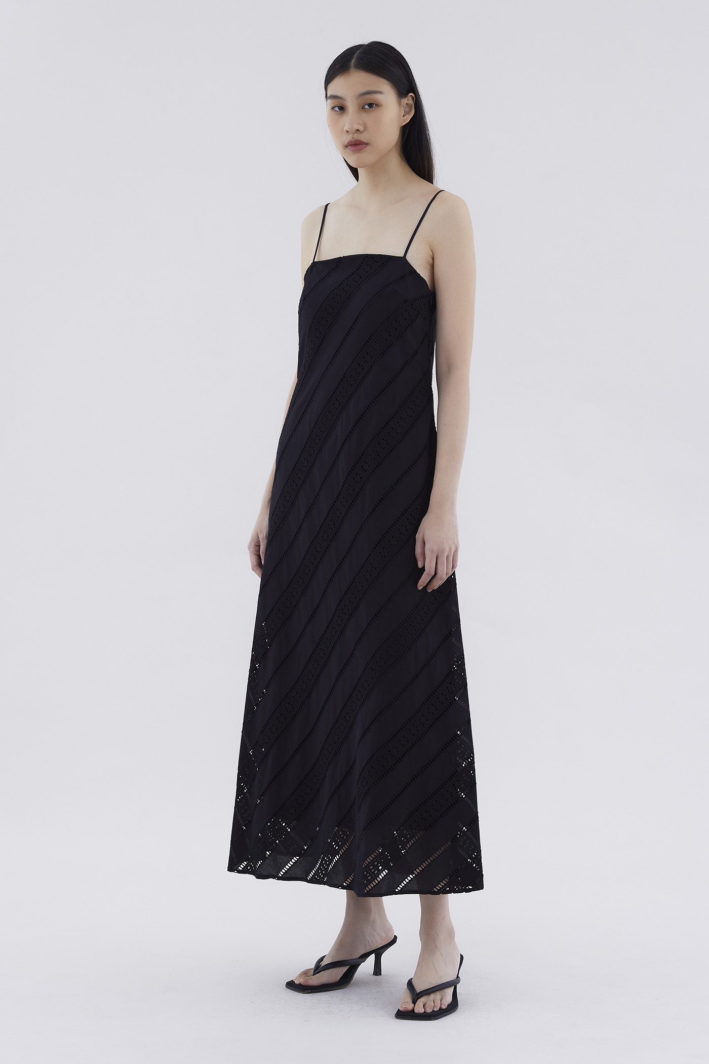 Subtle. Cut from softly structured broderie cotton, this sleeveless maxi dress features slim non-adjustable shoulder straps, a straight neckline and a side zip closure. Worn in a relaxed fit.