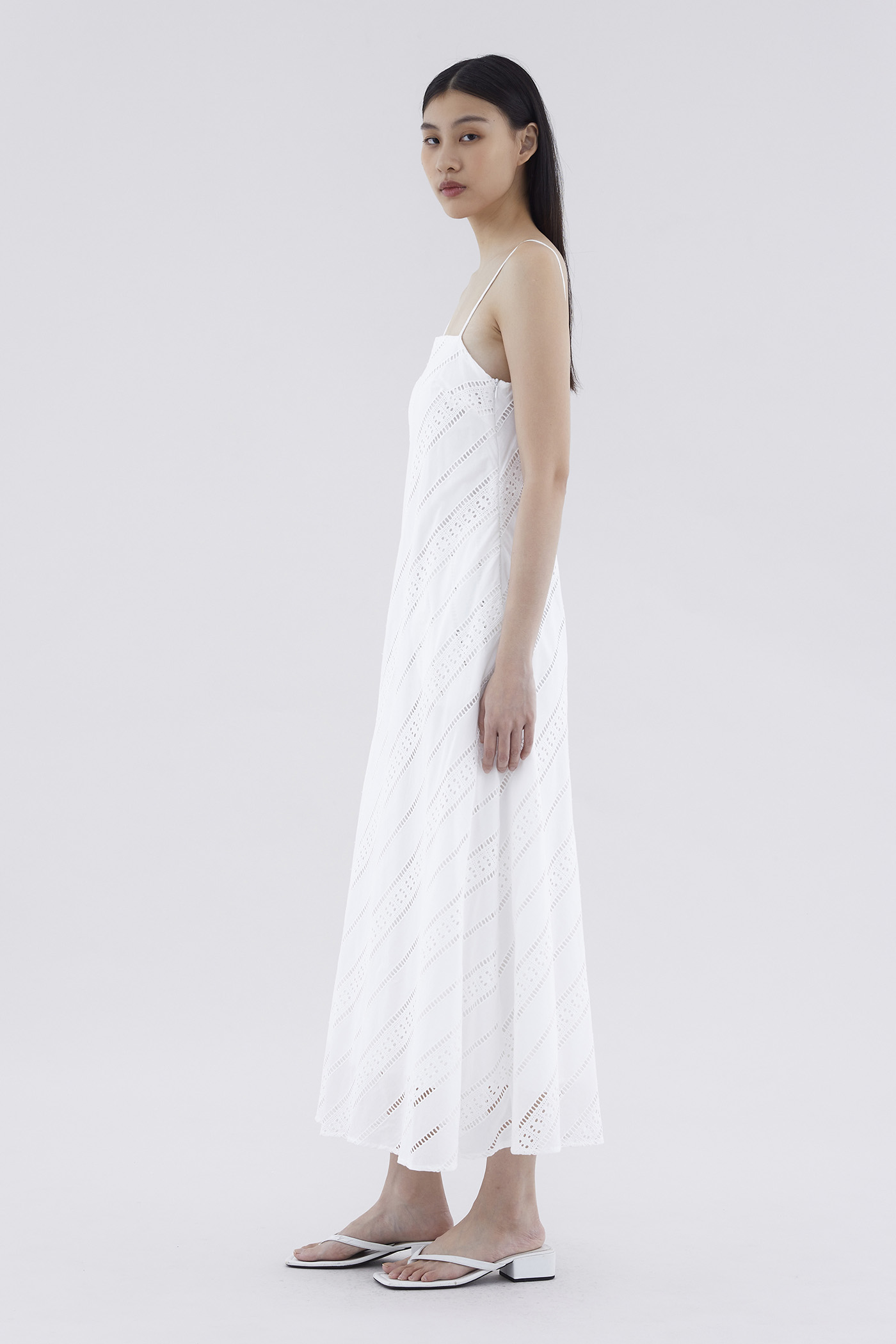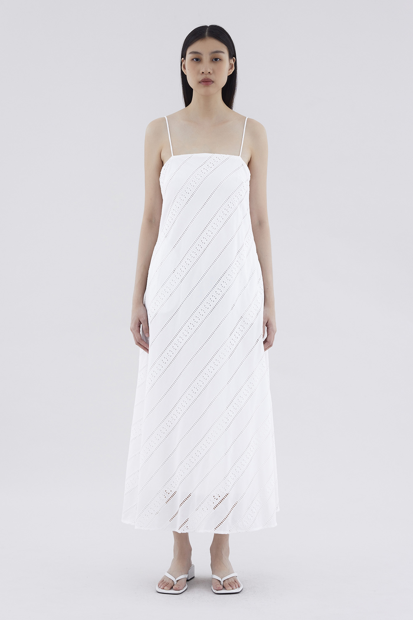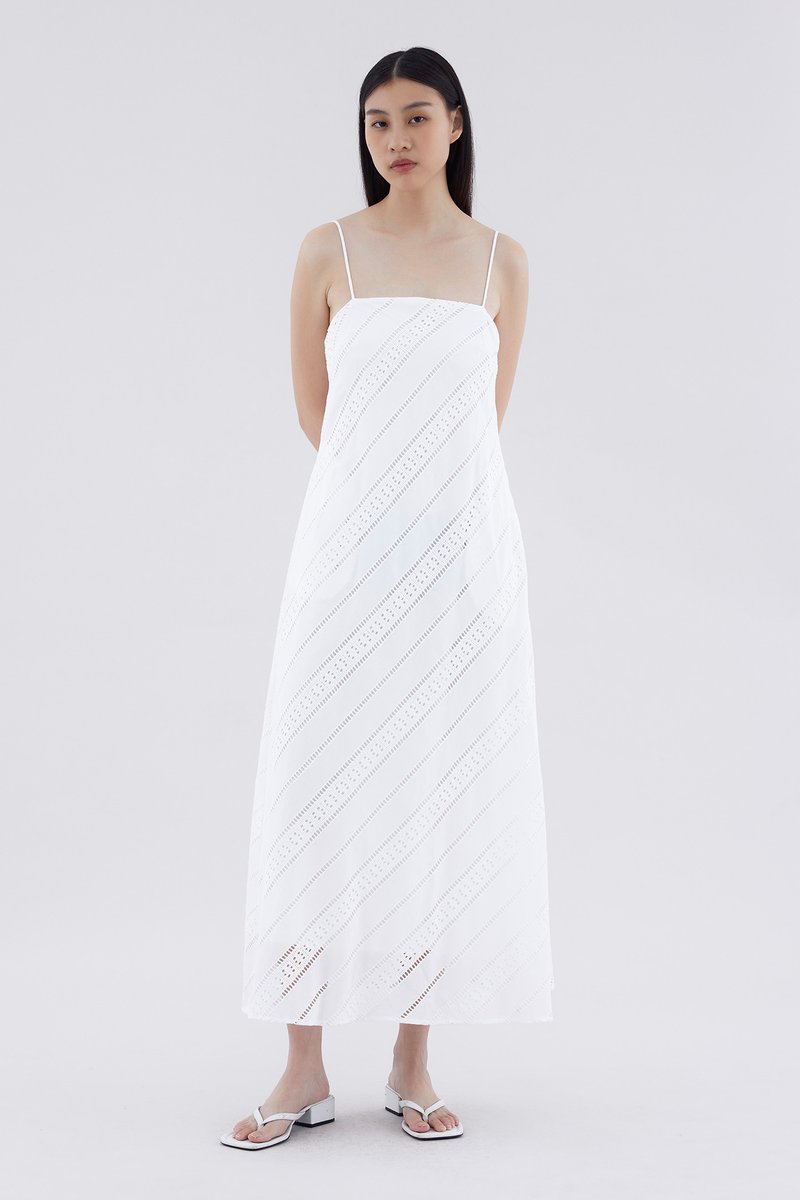 Subtle. Cut from softly structured broderie cotton, this sleeveless maxi dress features slim non-adjustable shoulder straps, a straight neckline and a side zip closure. Worn in a relaxed fit.