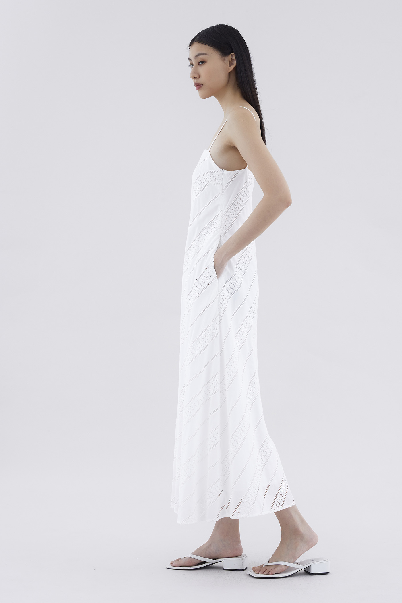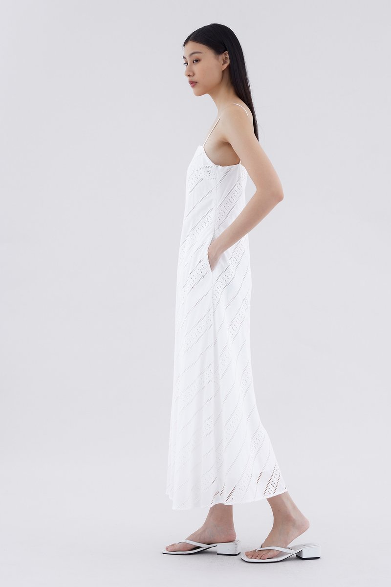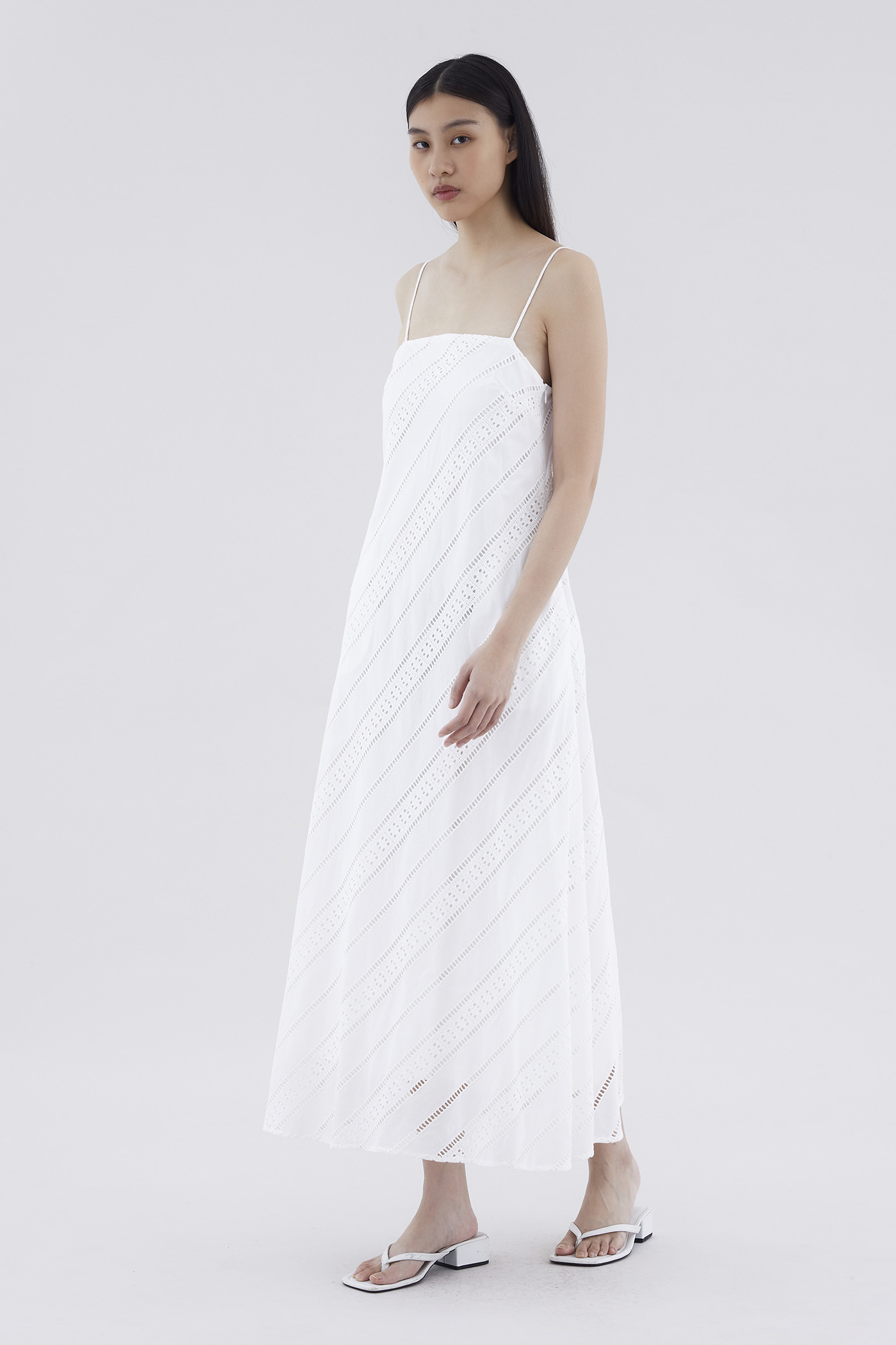 Subtle. Cut from softly structured broderie cotton, this sleeveless maxi dress features slim non-adjustable shoulder straps, a straight neckline and a side zip closure. Worn in a relaxed fit.