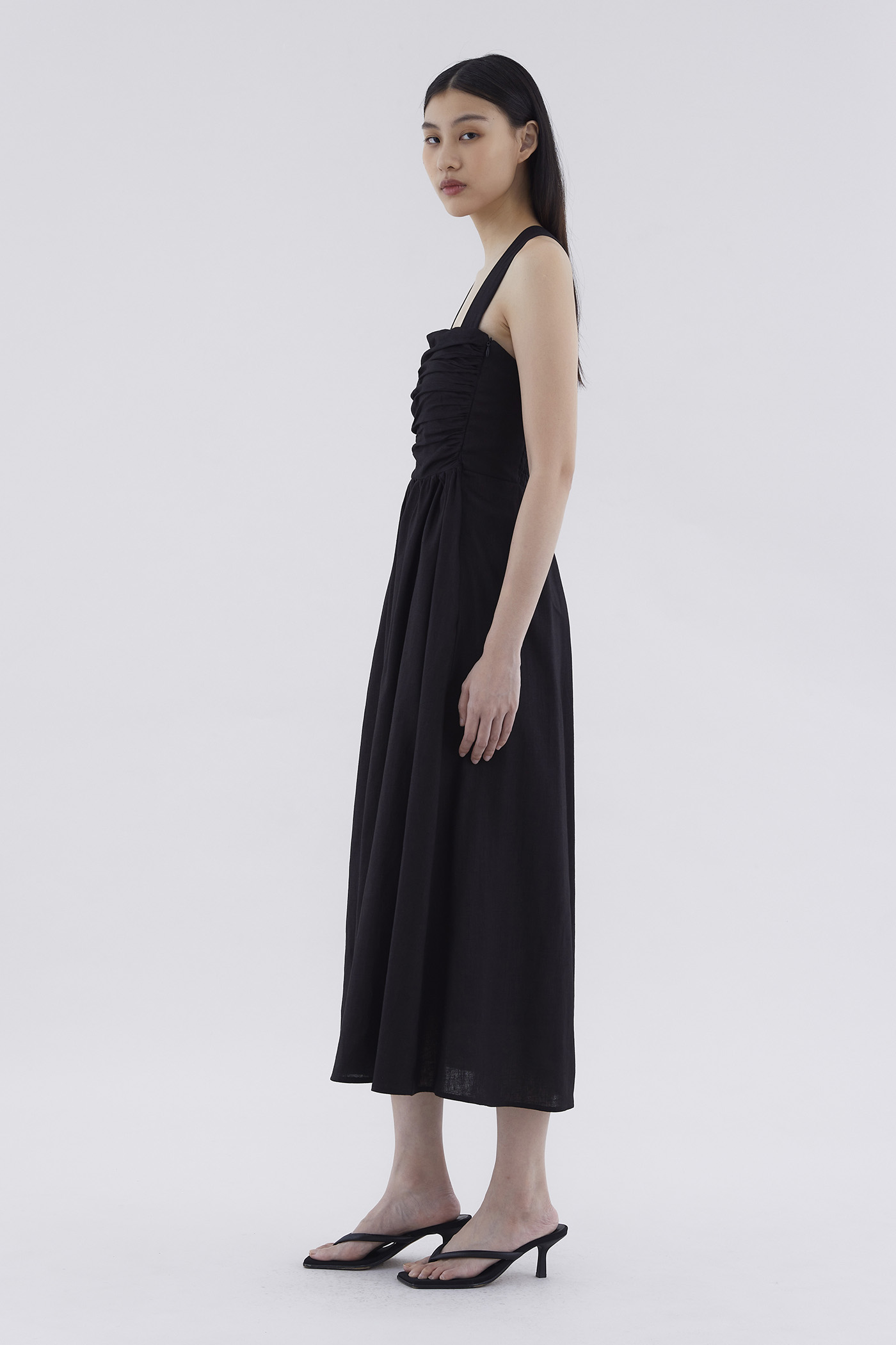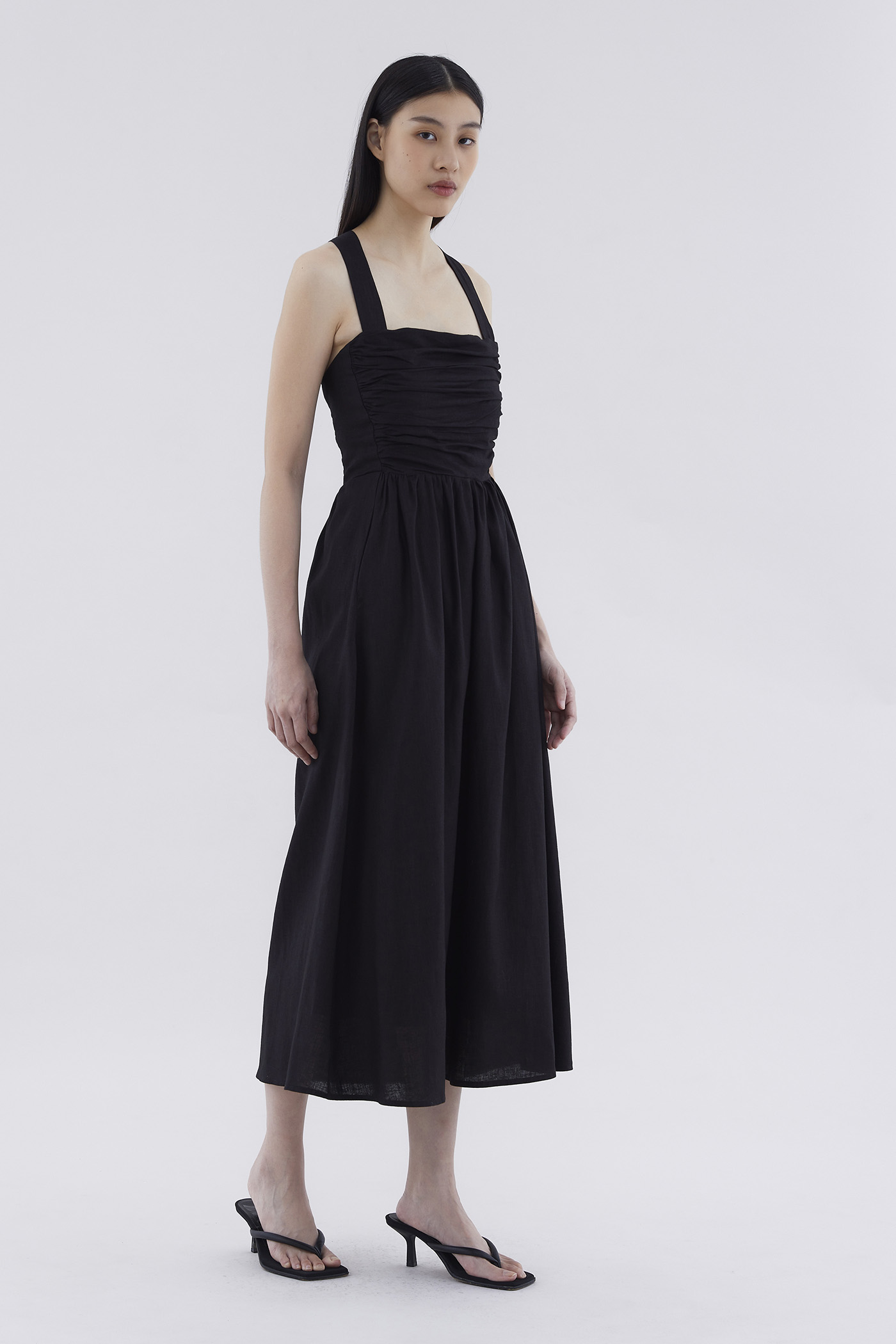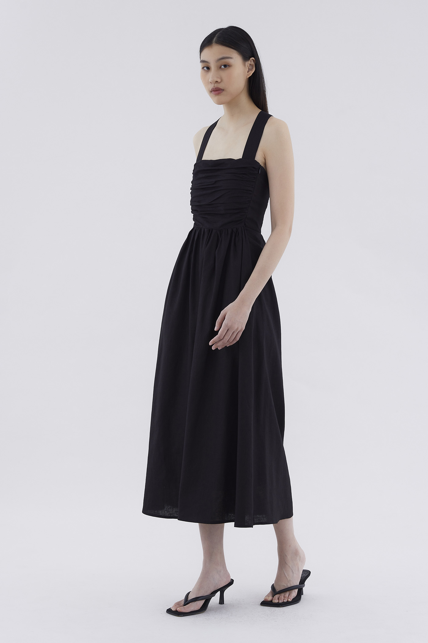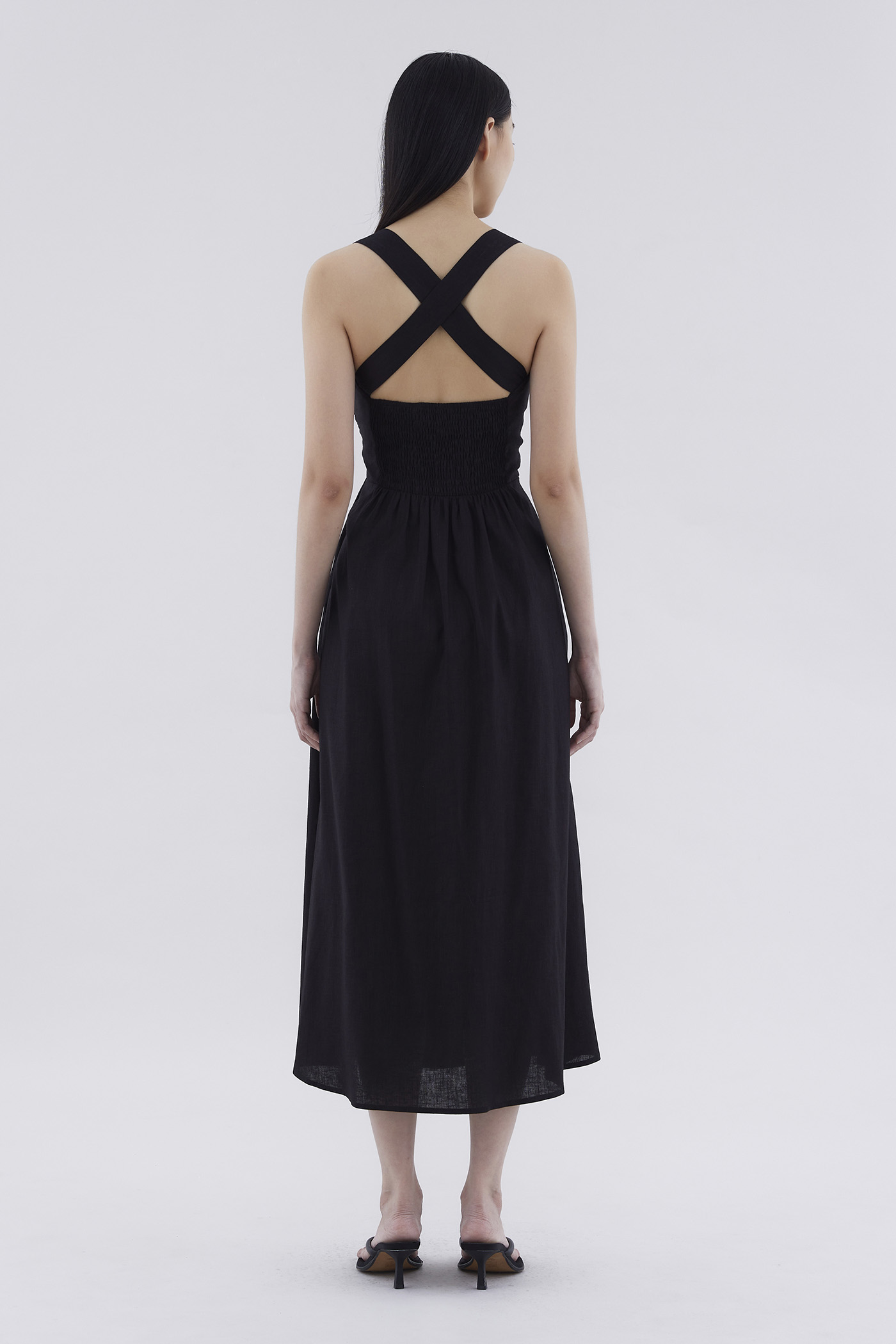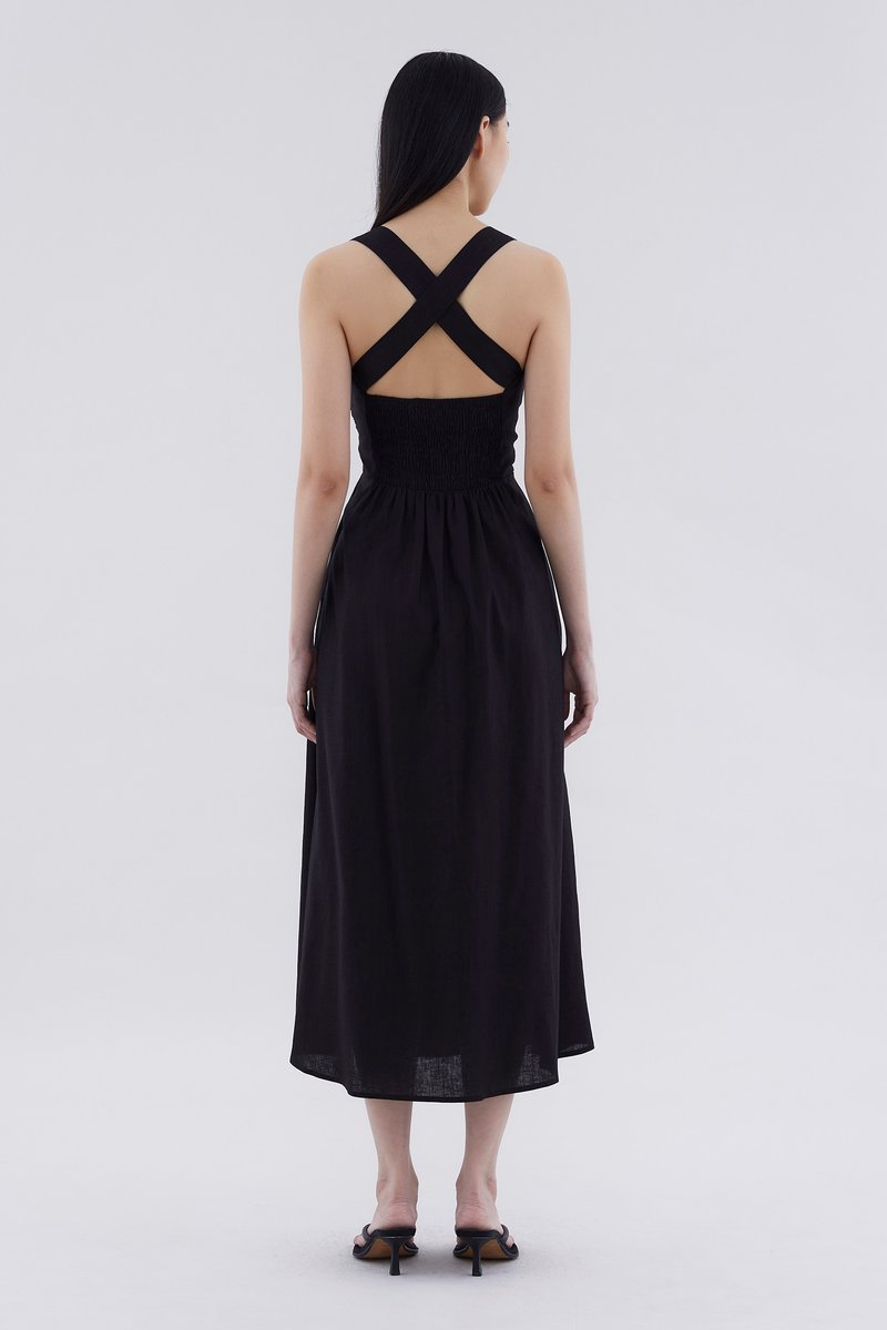 Feels like summer. Cut from airy and gently tailored 100% linen, this sleeveless maxi dress features a square neckline, ruched front, side zip closure and smocked back with crossover straps. Worn in an A-line silhouette that fits slimmer through the bodice before flowing out in a relaxed skirt.