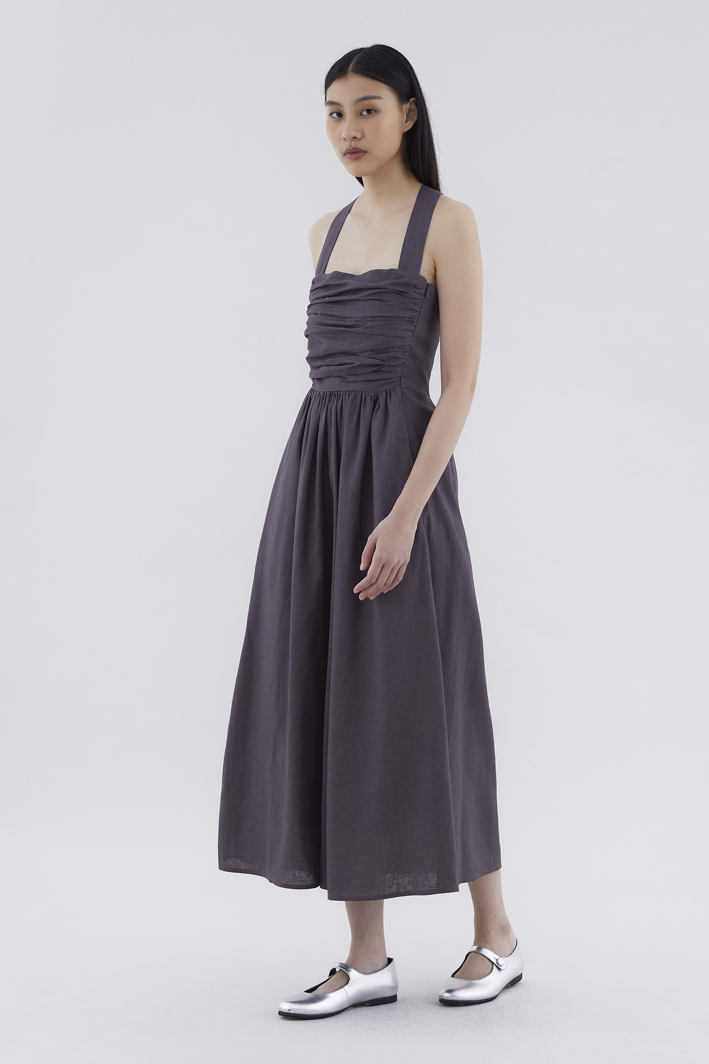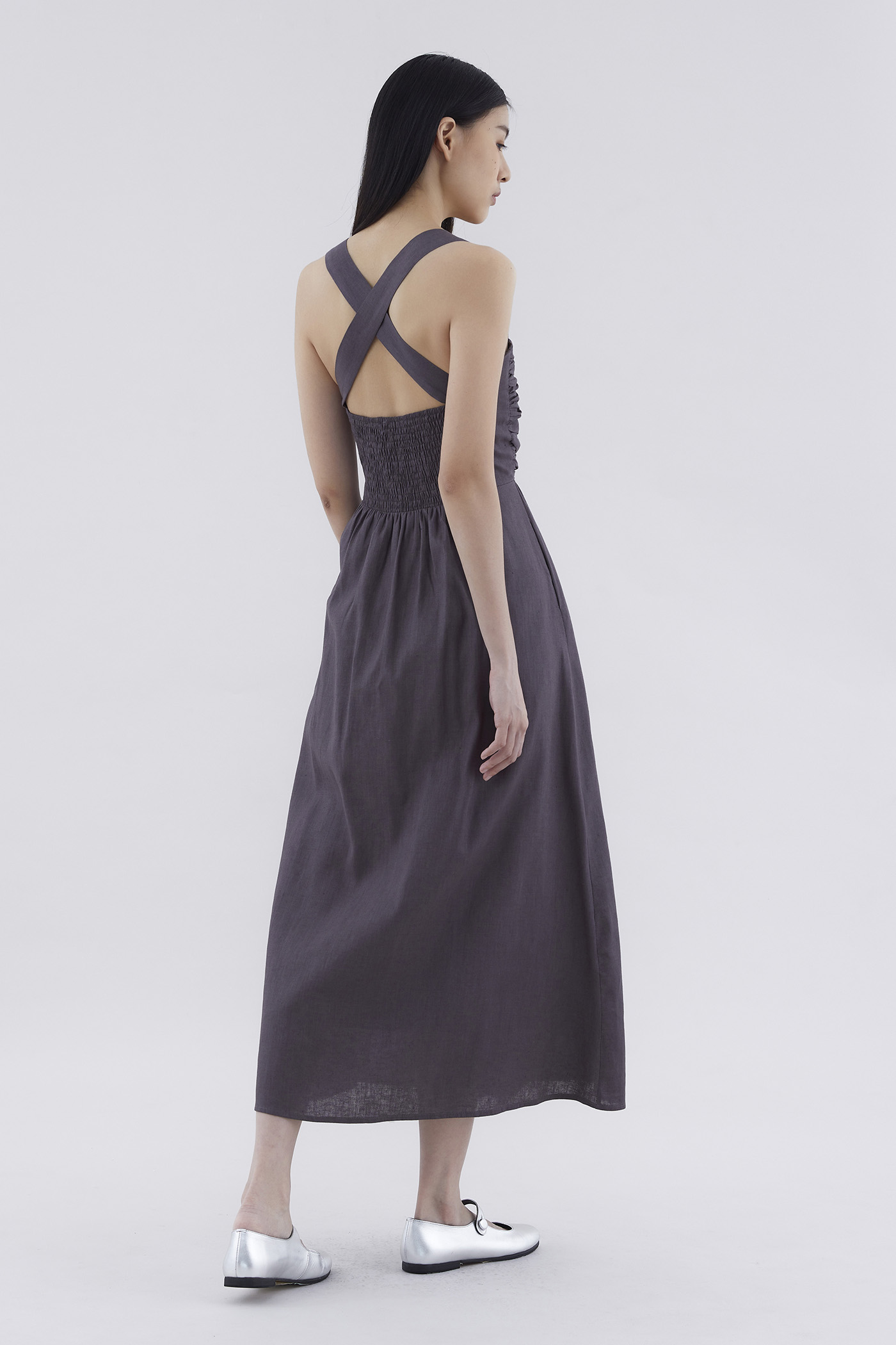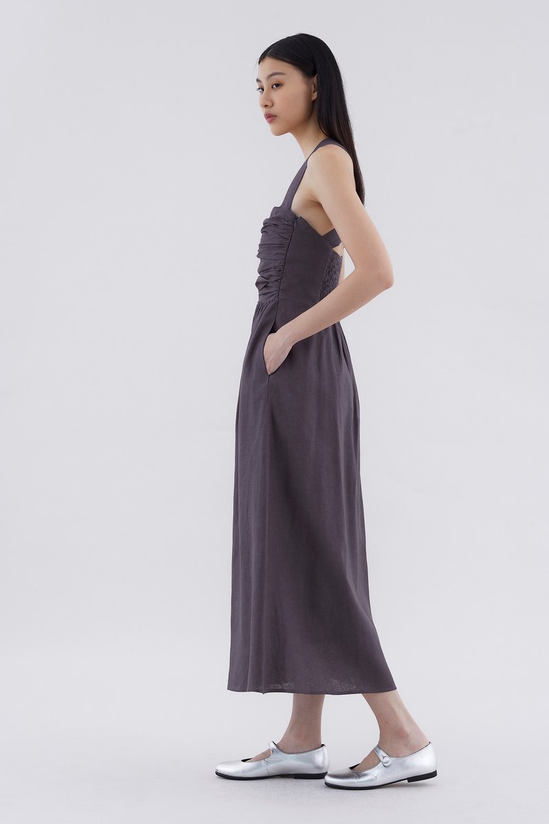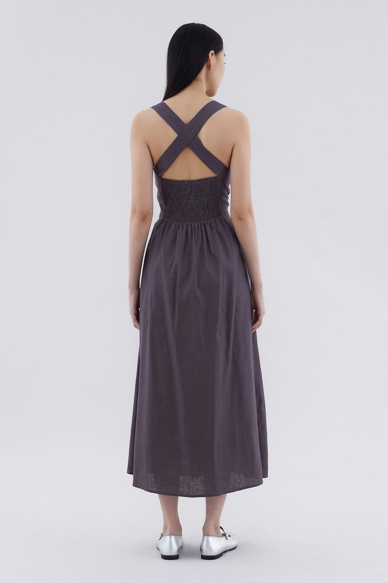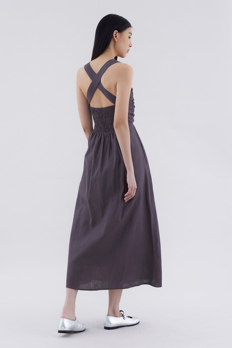 Feels like summer. Cut from airy and gently tailored 100% linen, this sleeveless maxi dress features a square neckline, ruched front, side zip closure and smocked back with crossover straps. Worn in an A-line silhouette that fits slimmer through the bodice before flowing out in a relaxed skirt.