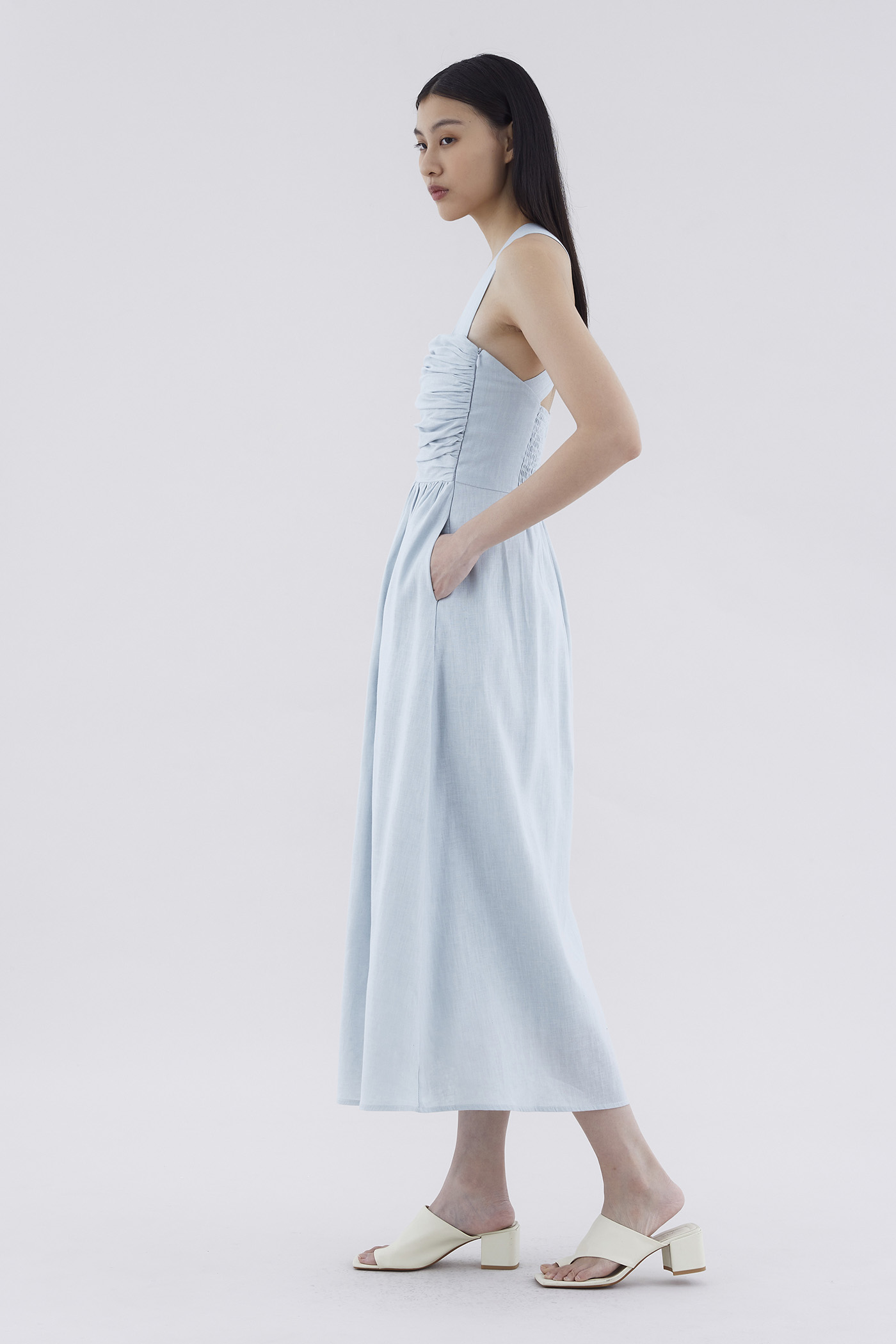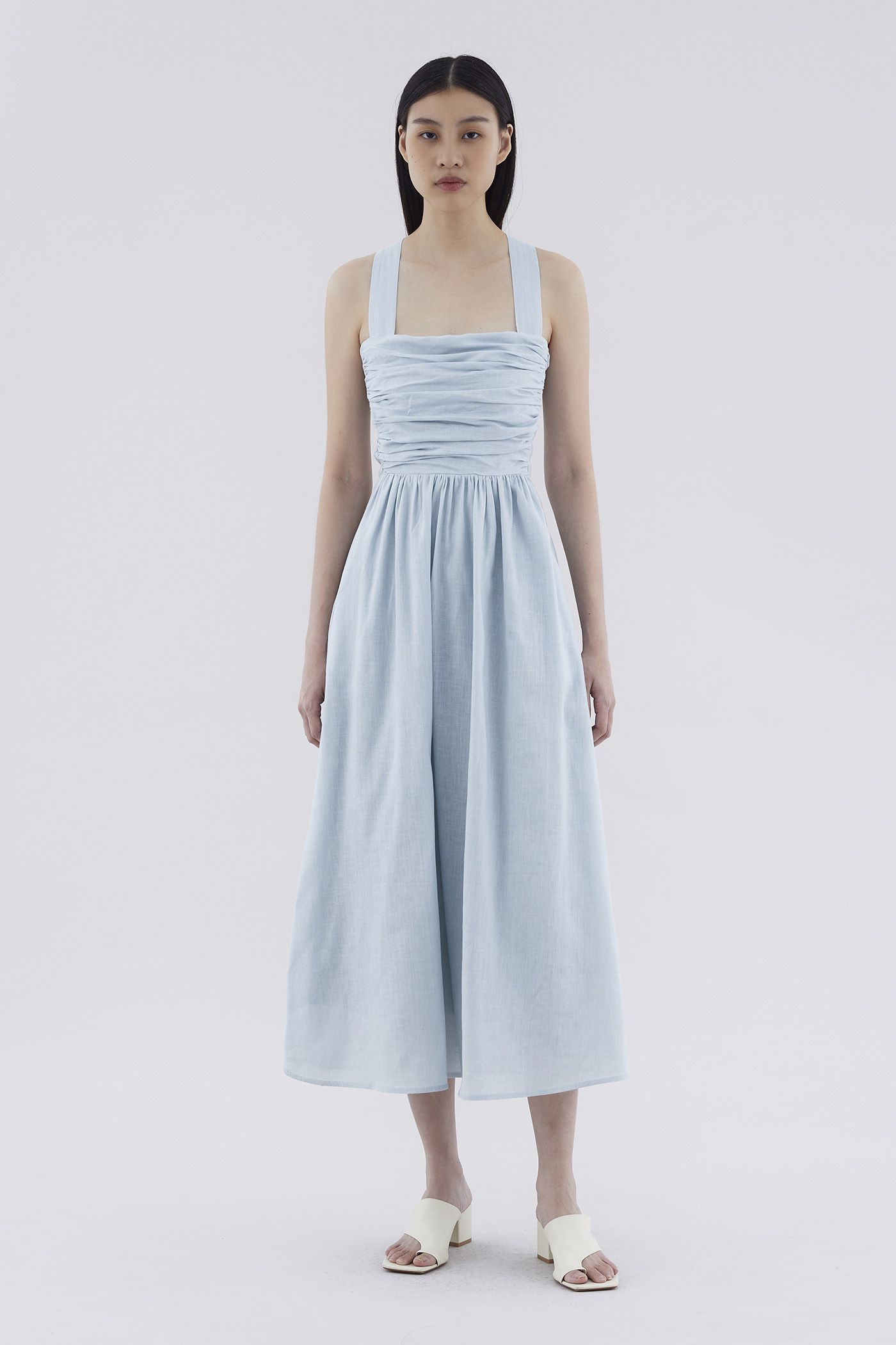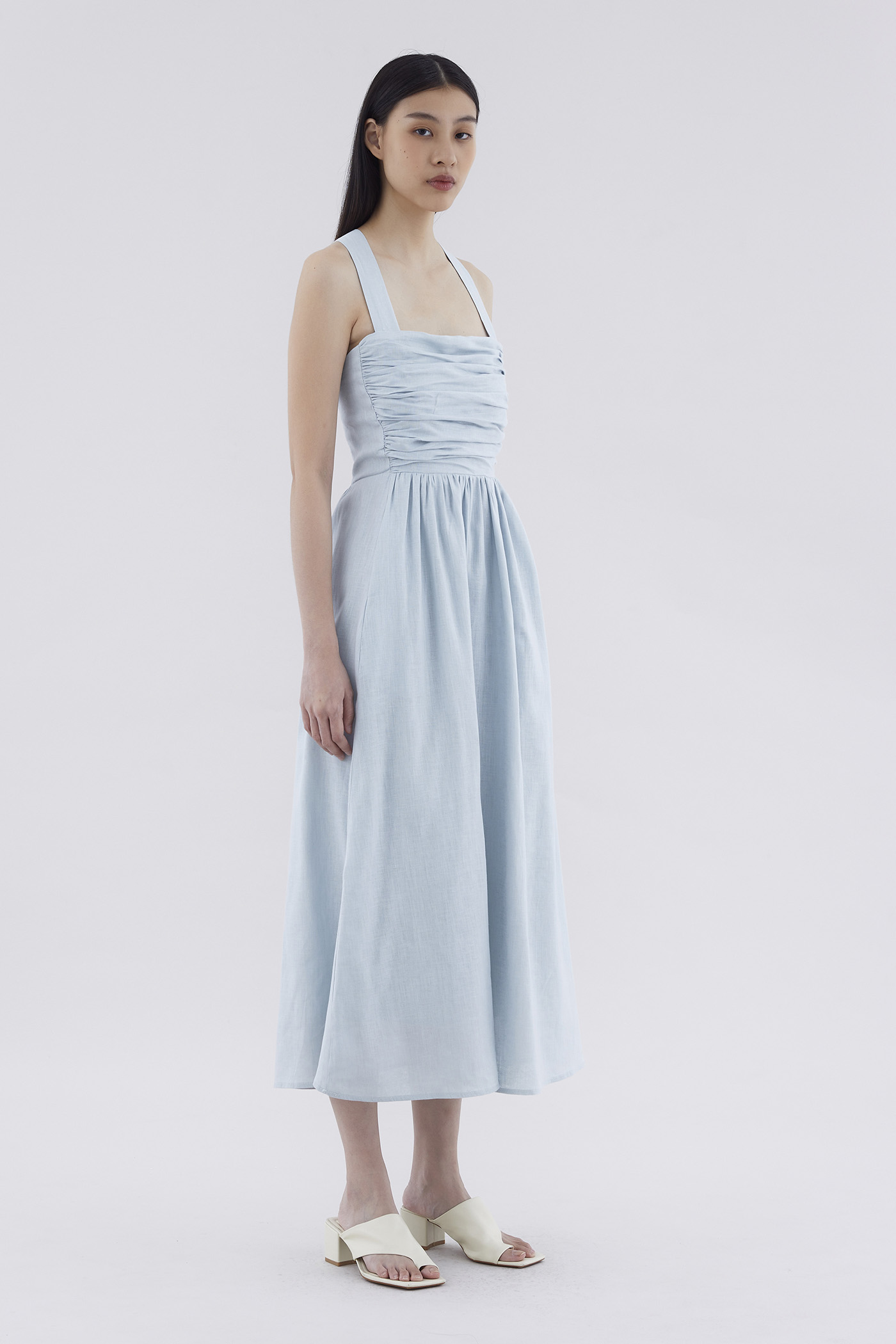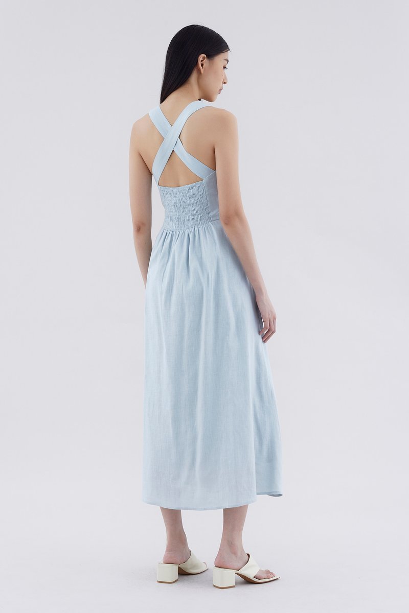 Feels like summer. Cut from airy and gently tailored 100% linen, this sleeveless maxi dress features a square neckline, ruched front, side zip closure and smocked back with crossover straps. Worn in an A-line silhouette that fits slimmer through the bodice before flowing out in a relaxed skirt.