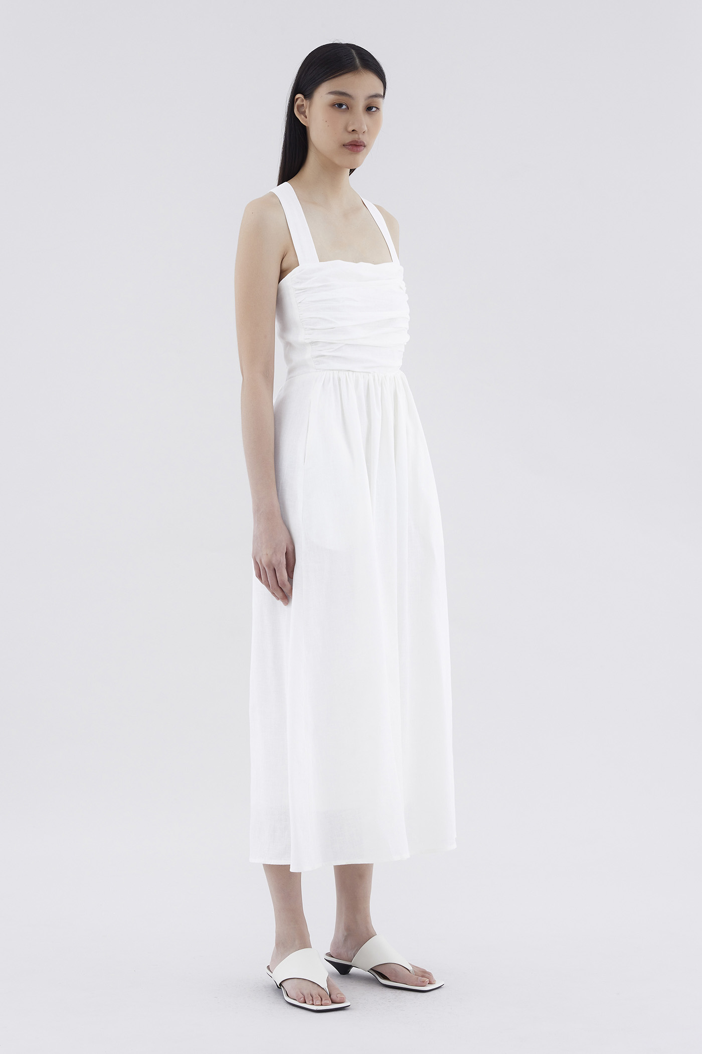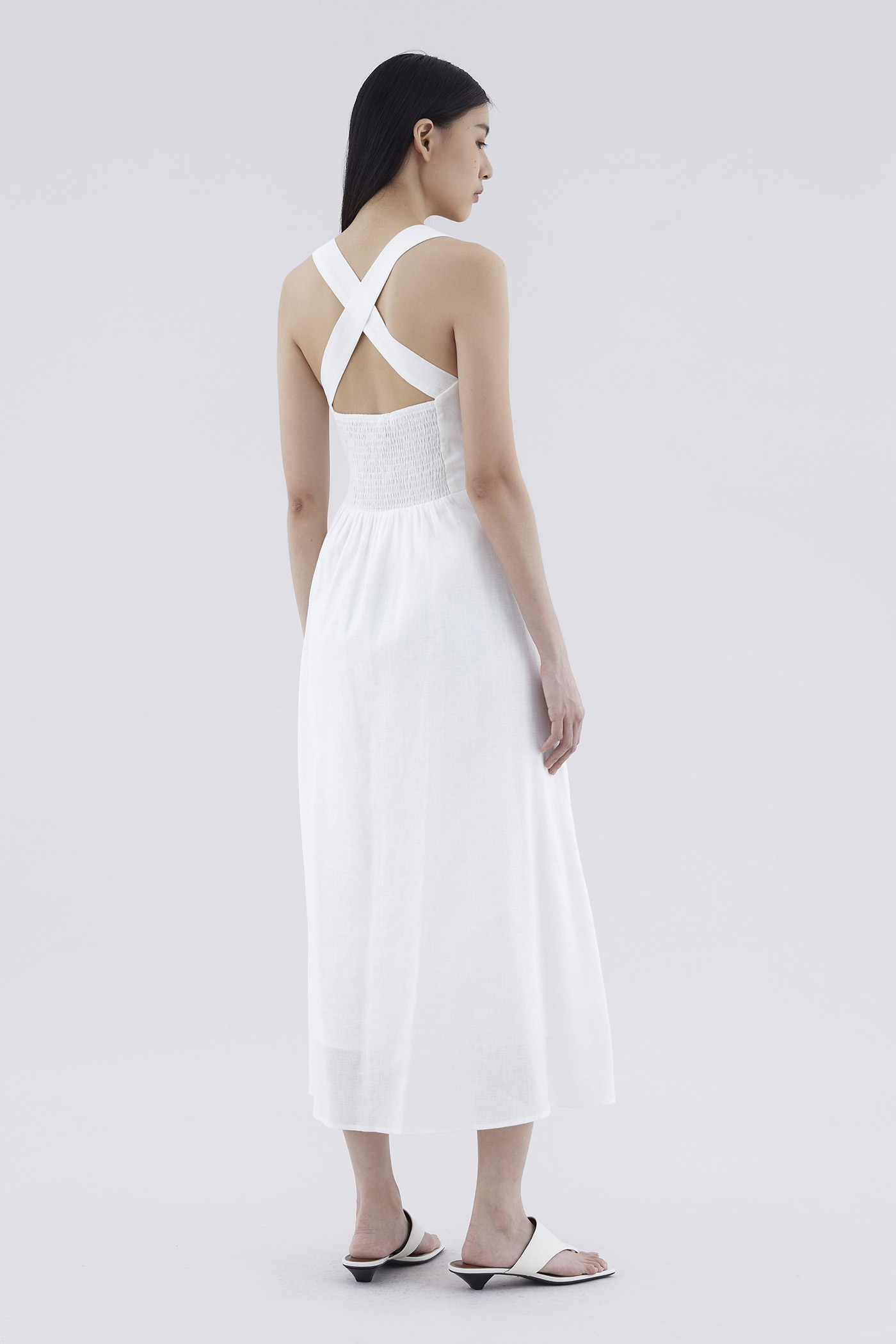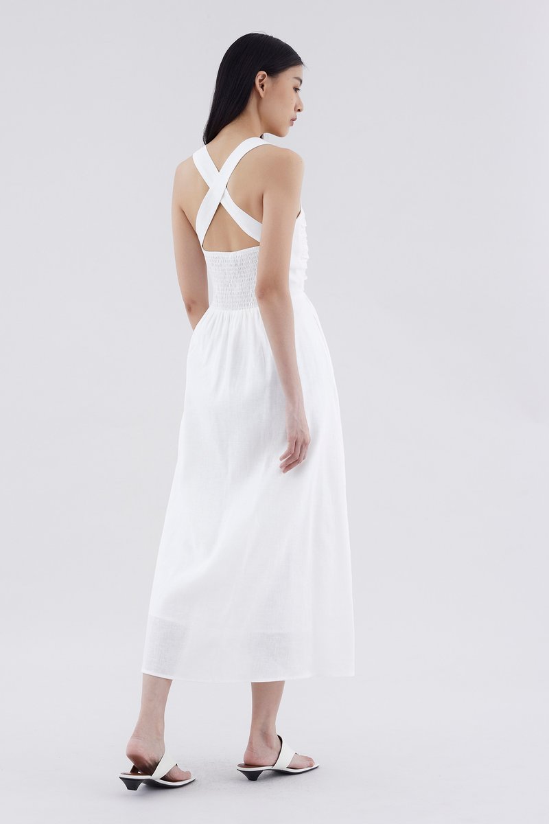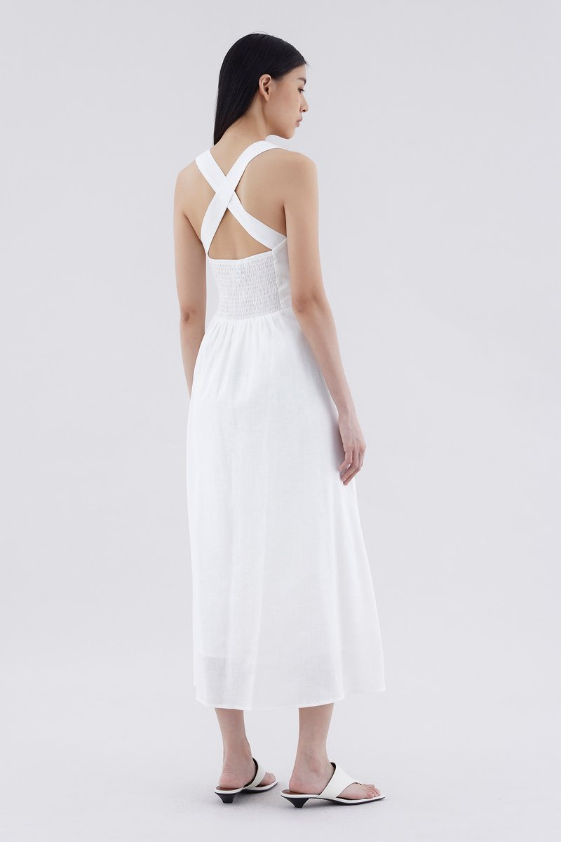 Feels like summer. Cut from airy and gently tailored 100% linen, this sleeveless maxi dress features a square neckline, ruched front, side zip closure and smocked back with crossover straps. Worn in an A-line silhouette that fits slimmer through the bodice before flowing out in a relaxed skirt.