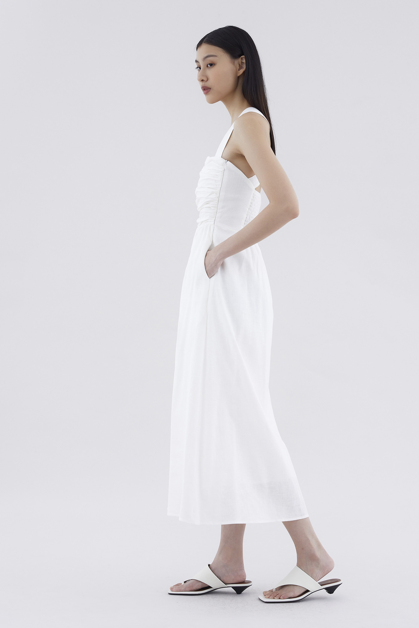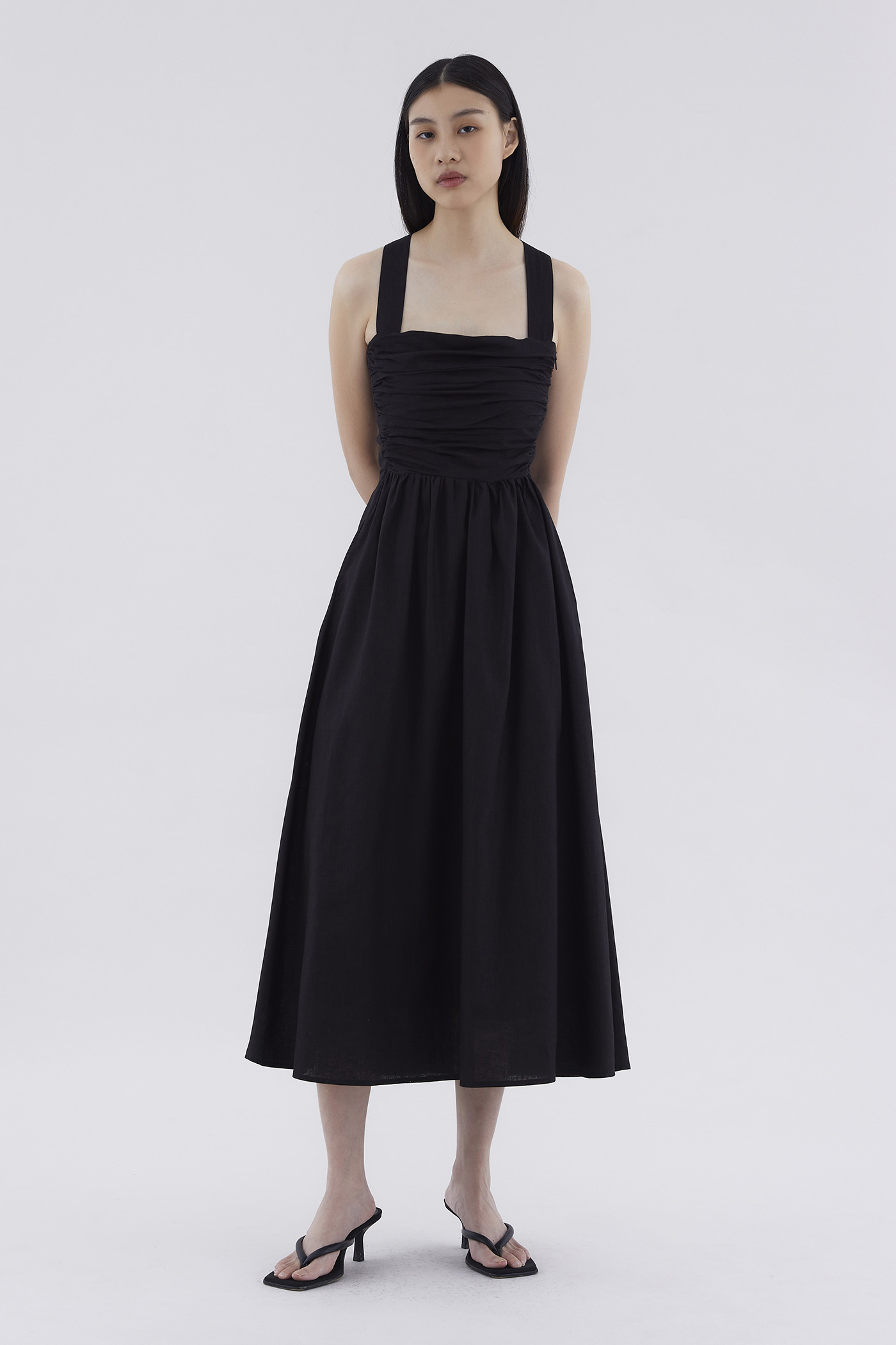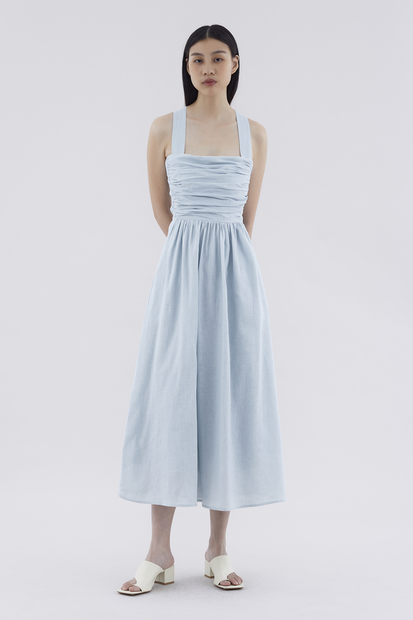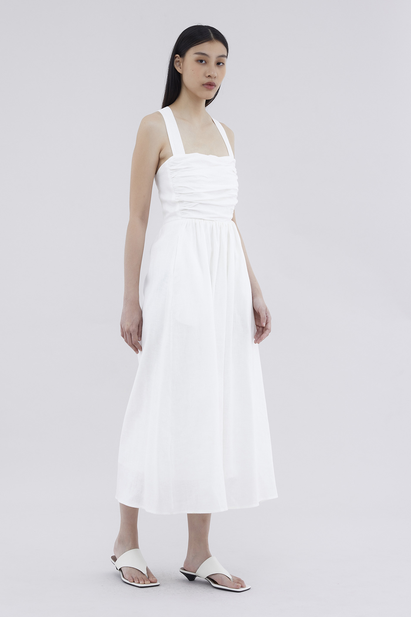 Feels like summer. Cut from airy and gently tailored 100% linen, this sleeveless maxi dress features a square neckline, ruched front, side zip closure and smocked back with crossover straps. Worn in an A-line silhouette that fits slimmer through the bodice before flowing out in a relaxed skirt.