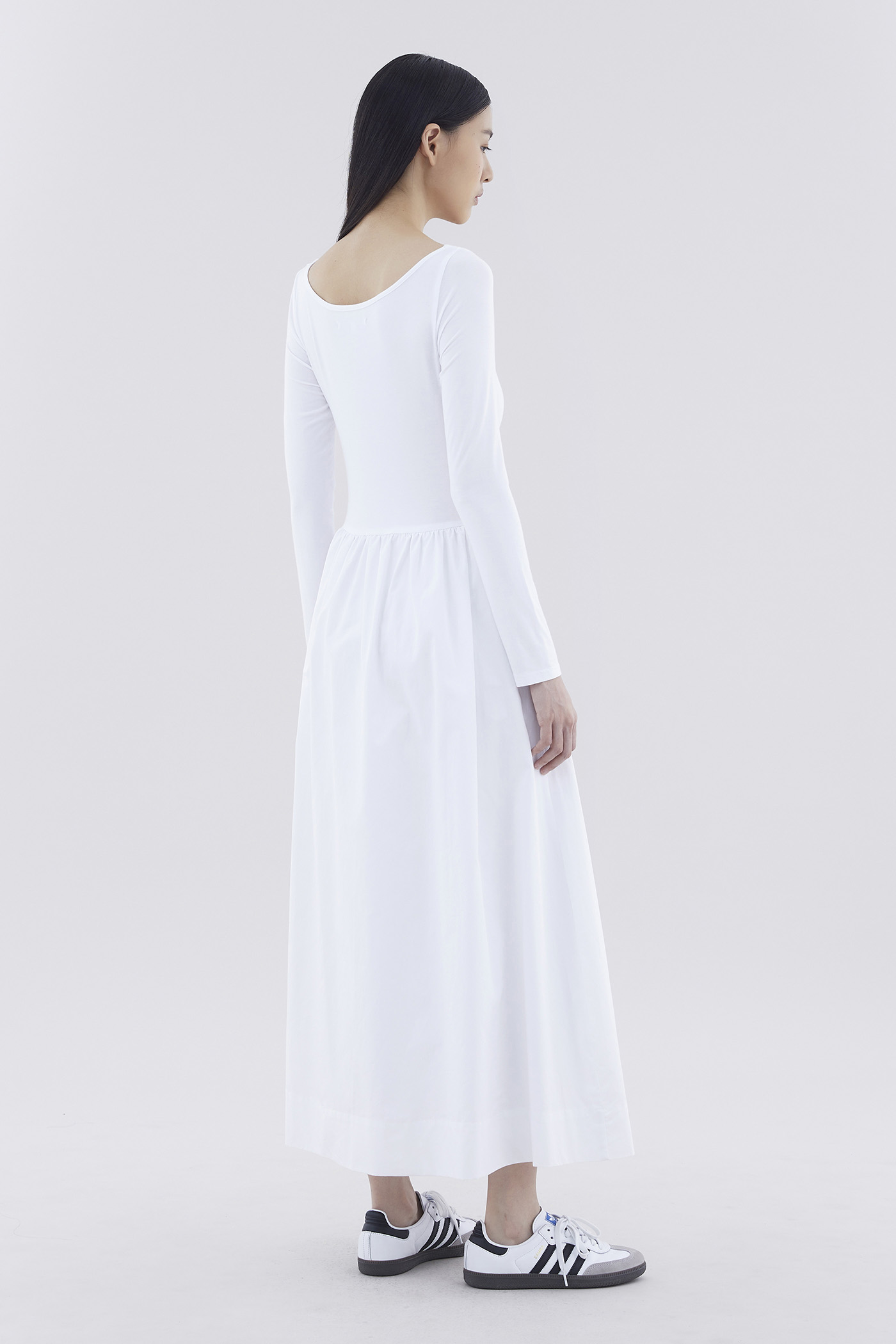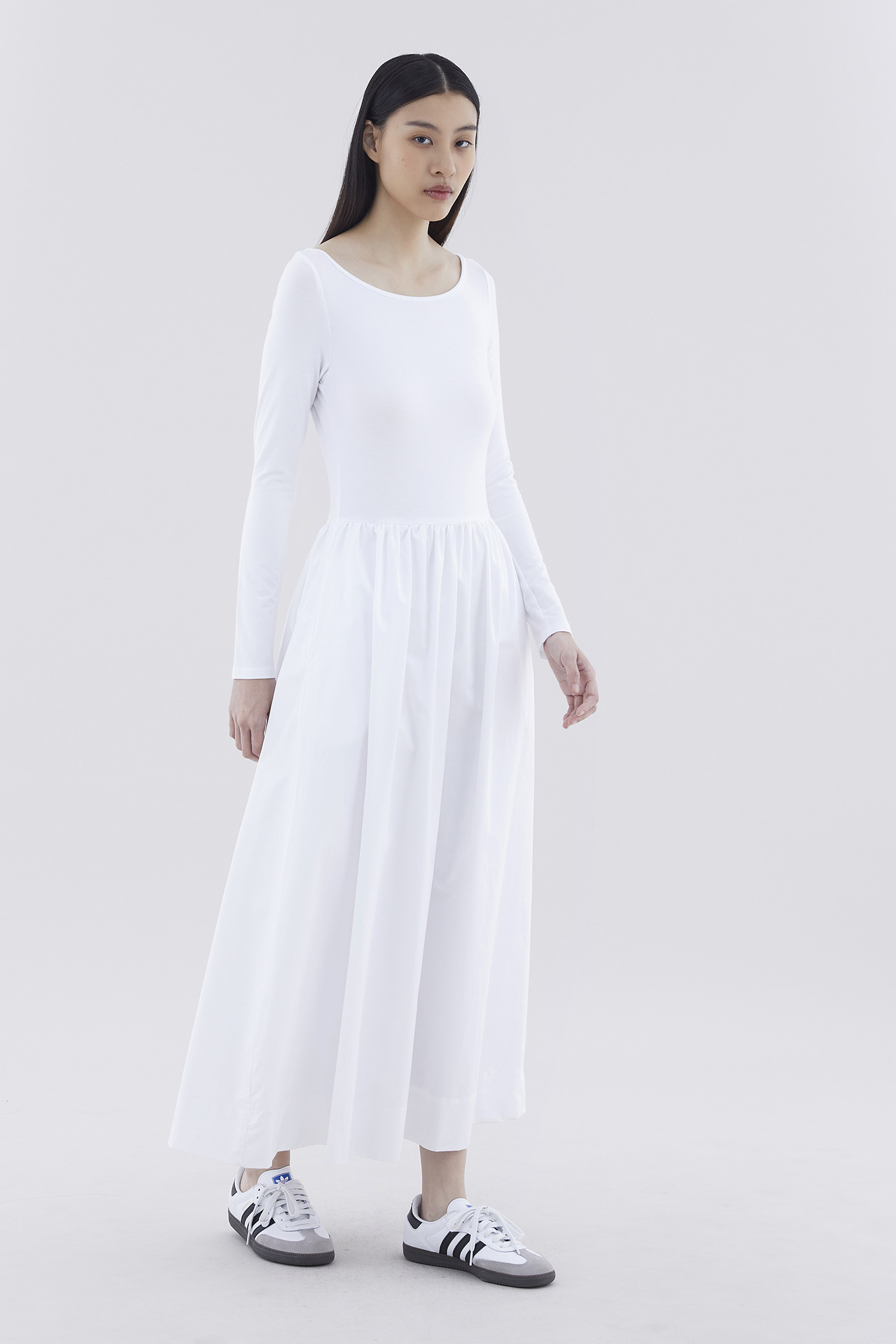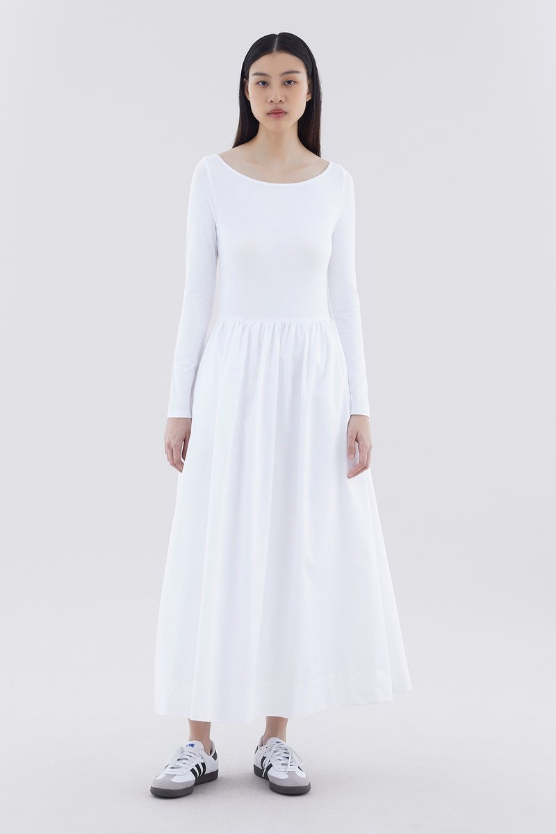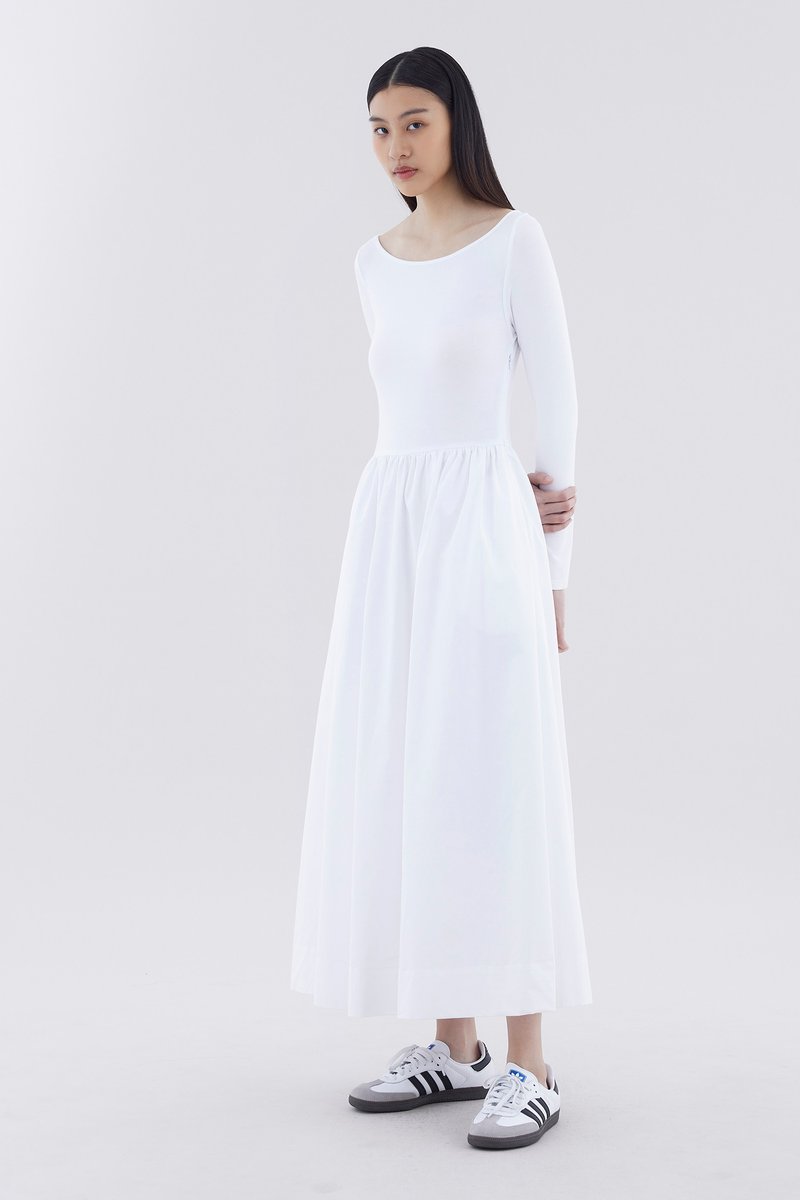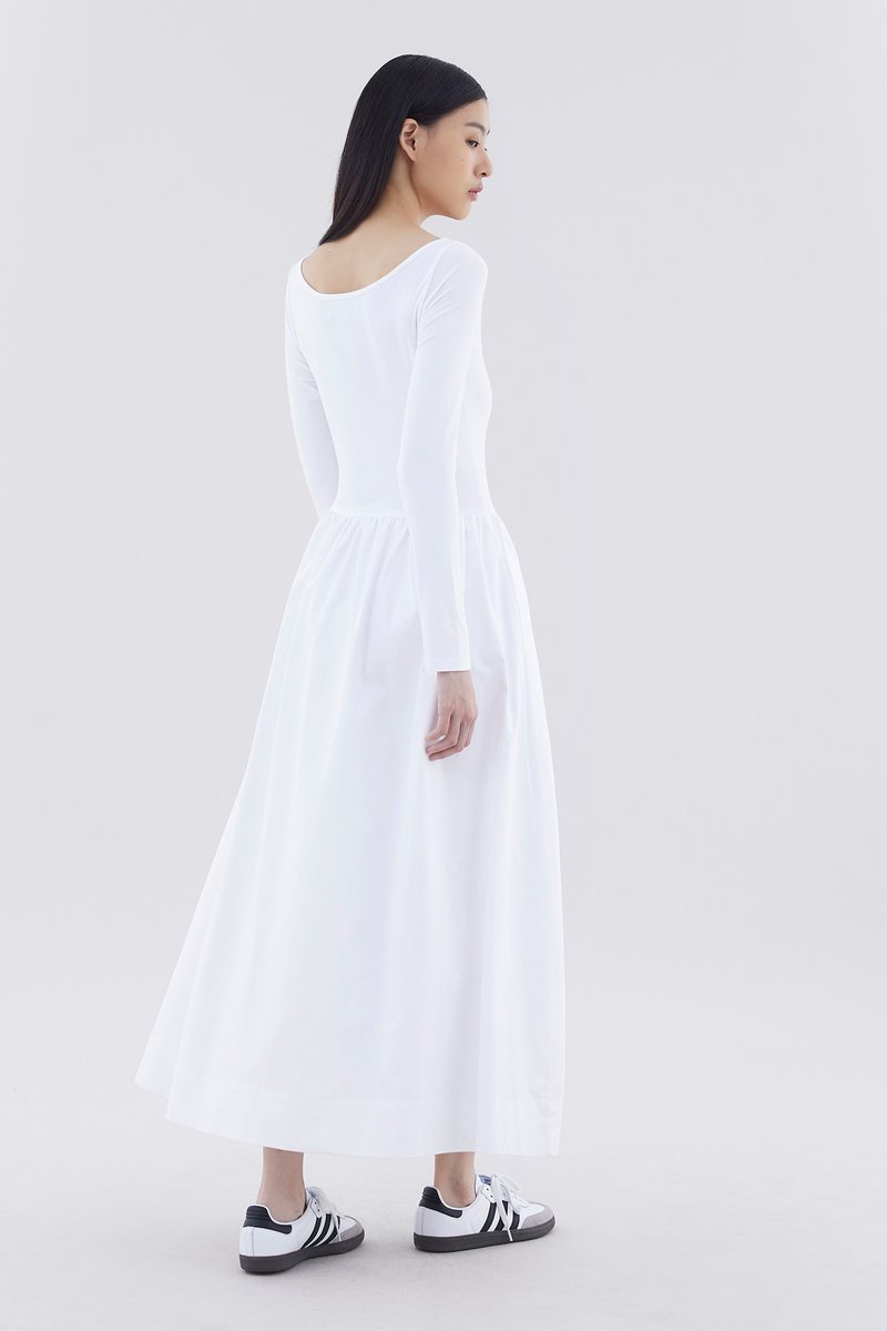 A good mix. This long-sleeved maxi dress features a fitted top made from soft and stretchy fabrics, and crisp, relaxed skirt with a side zip closure.