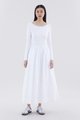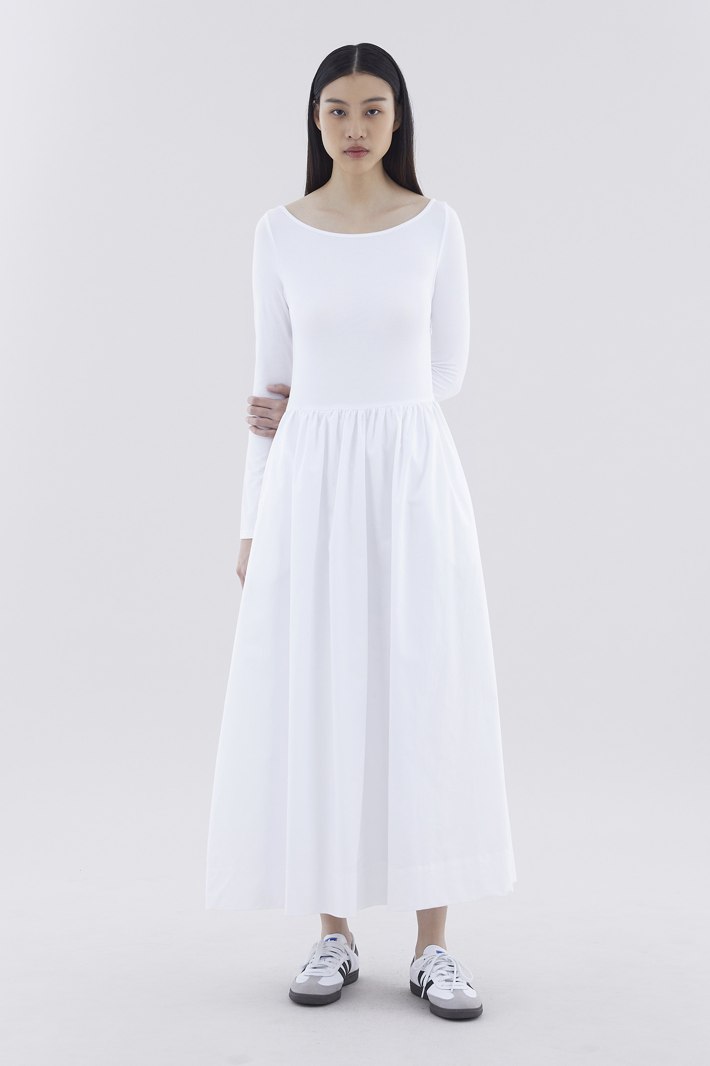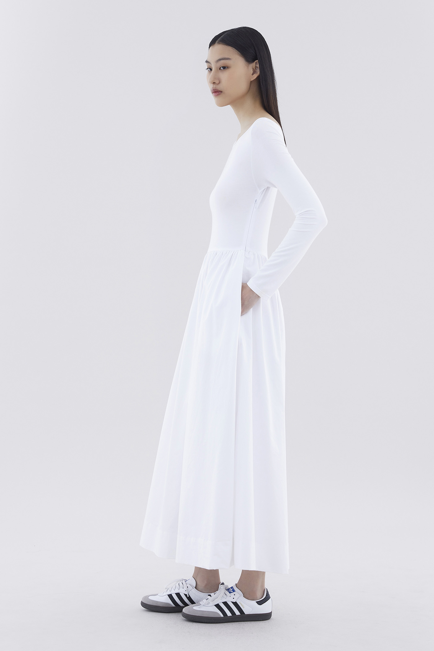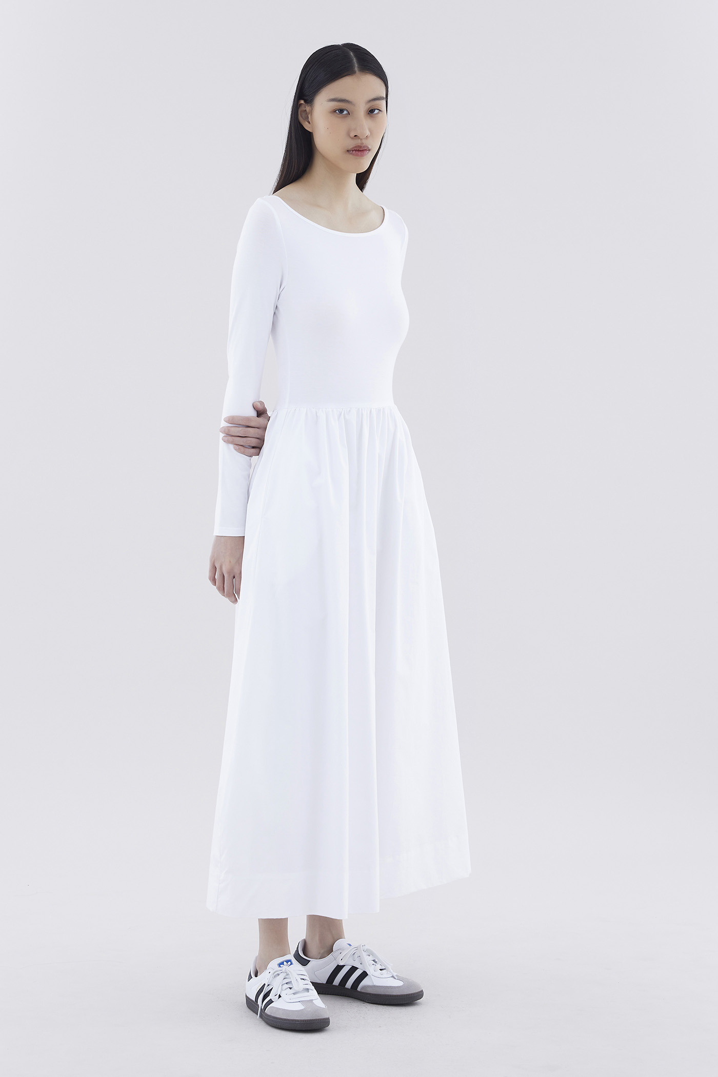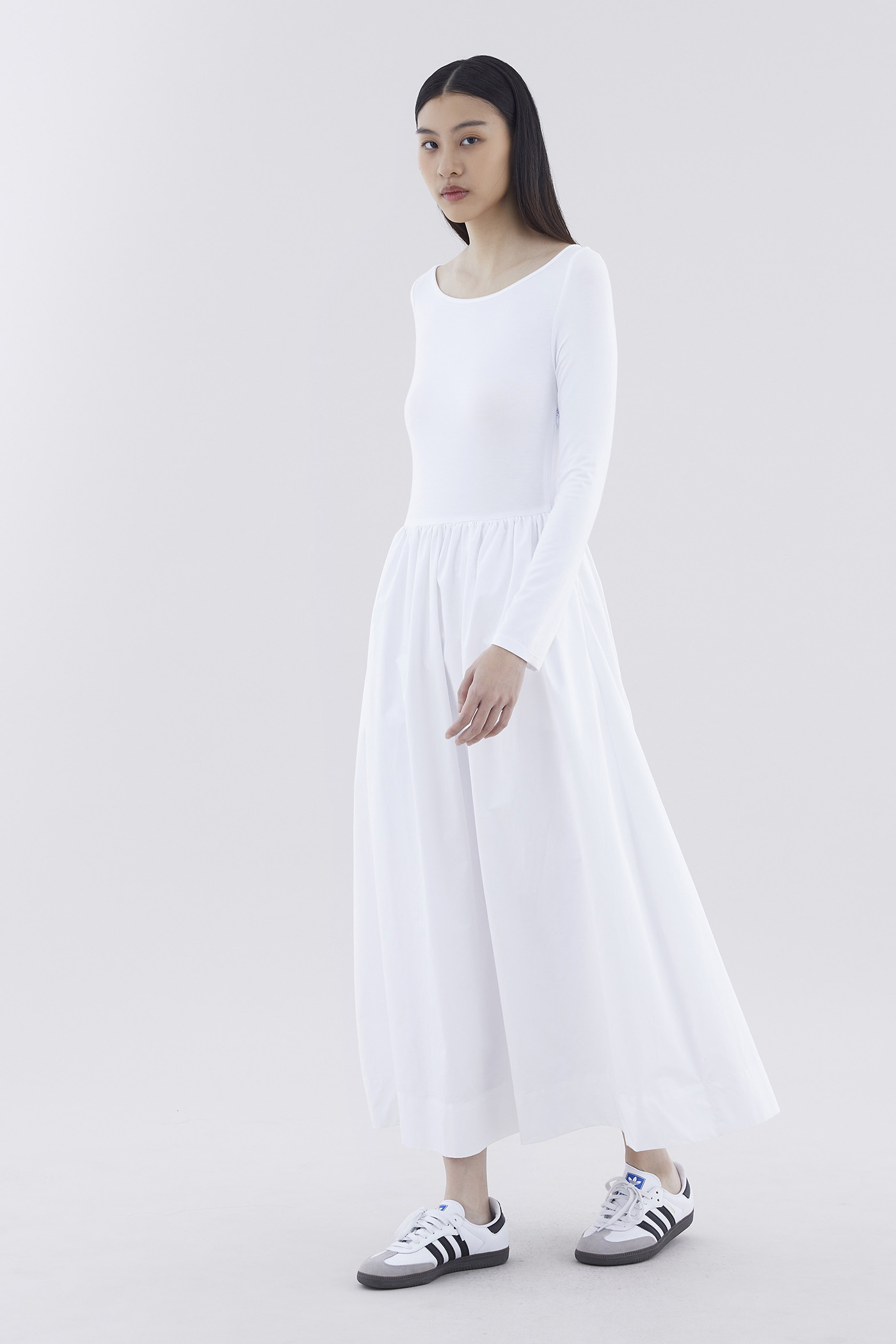 A good mix. This long-sleeved maxi dress features a fitted top made from soft and stretchy fabrics, and crisp, relaxed skirt with a side zip closure.