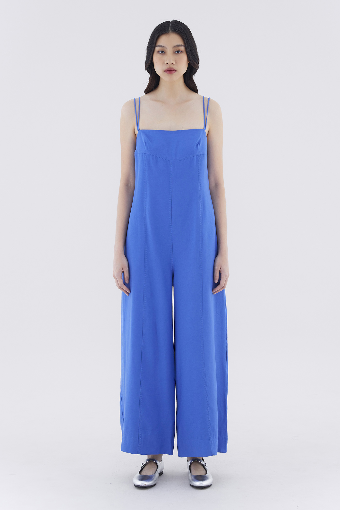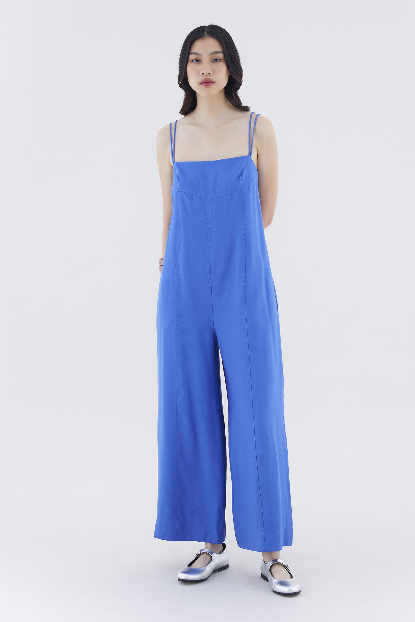 One piece wonder. Cut from smooth and drapey fabric, this sleeveless jumpsuit features double non-adjustable shoulder straps, a straight neckline, front panelling and wide legs. Fits relaxed with a back zip closure.