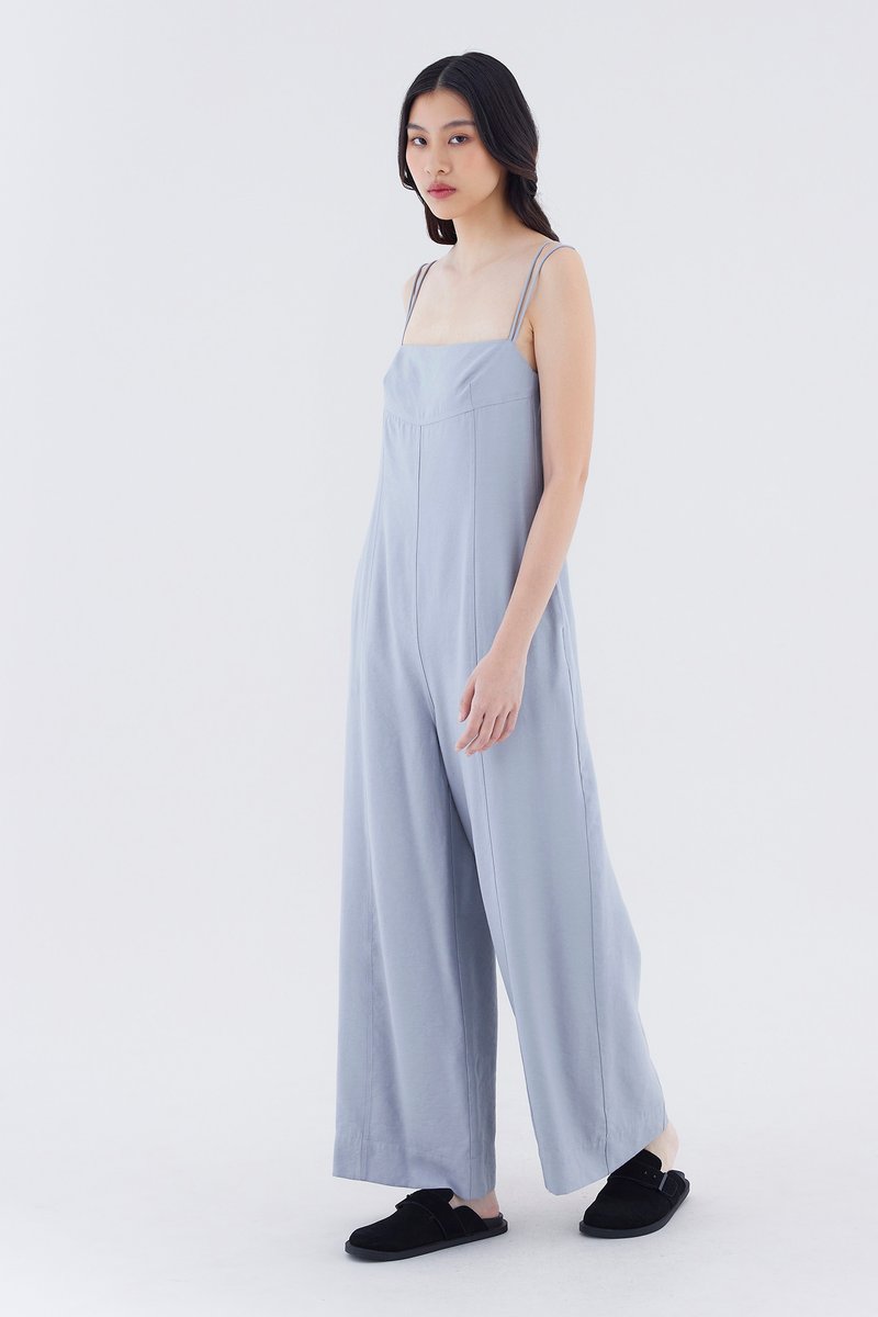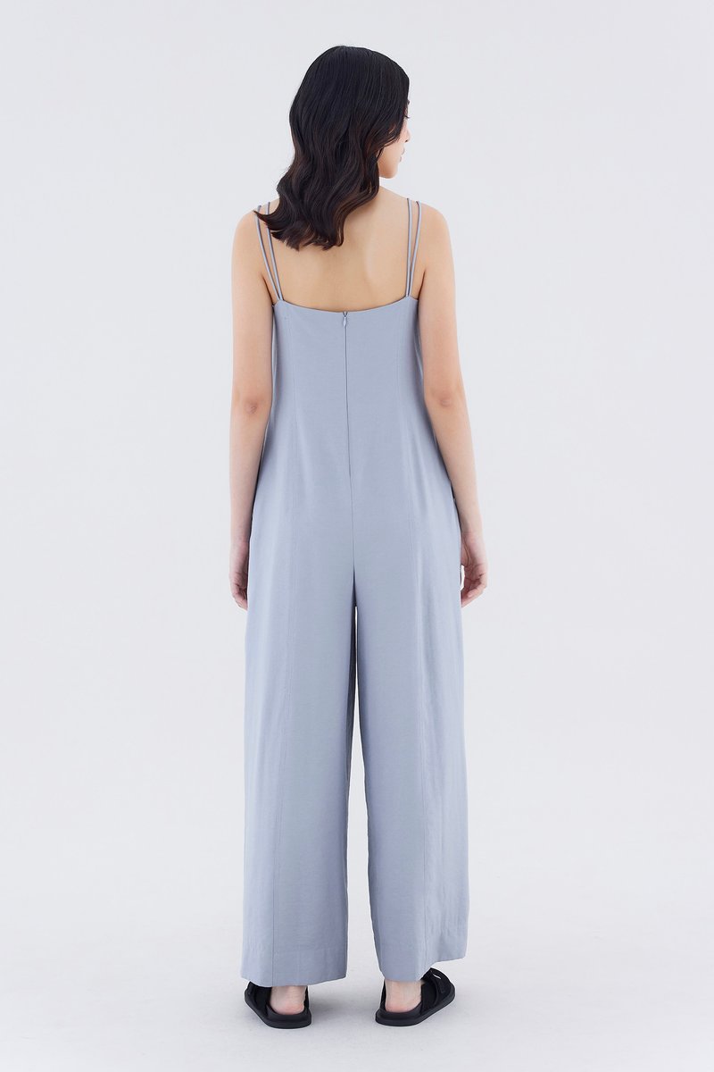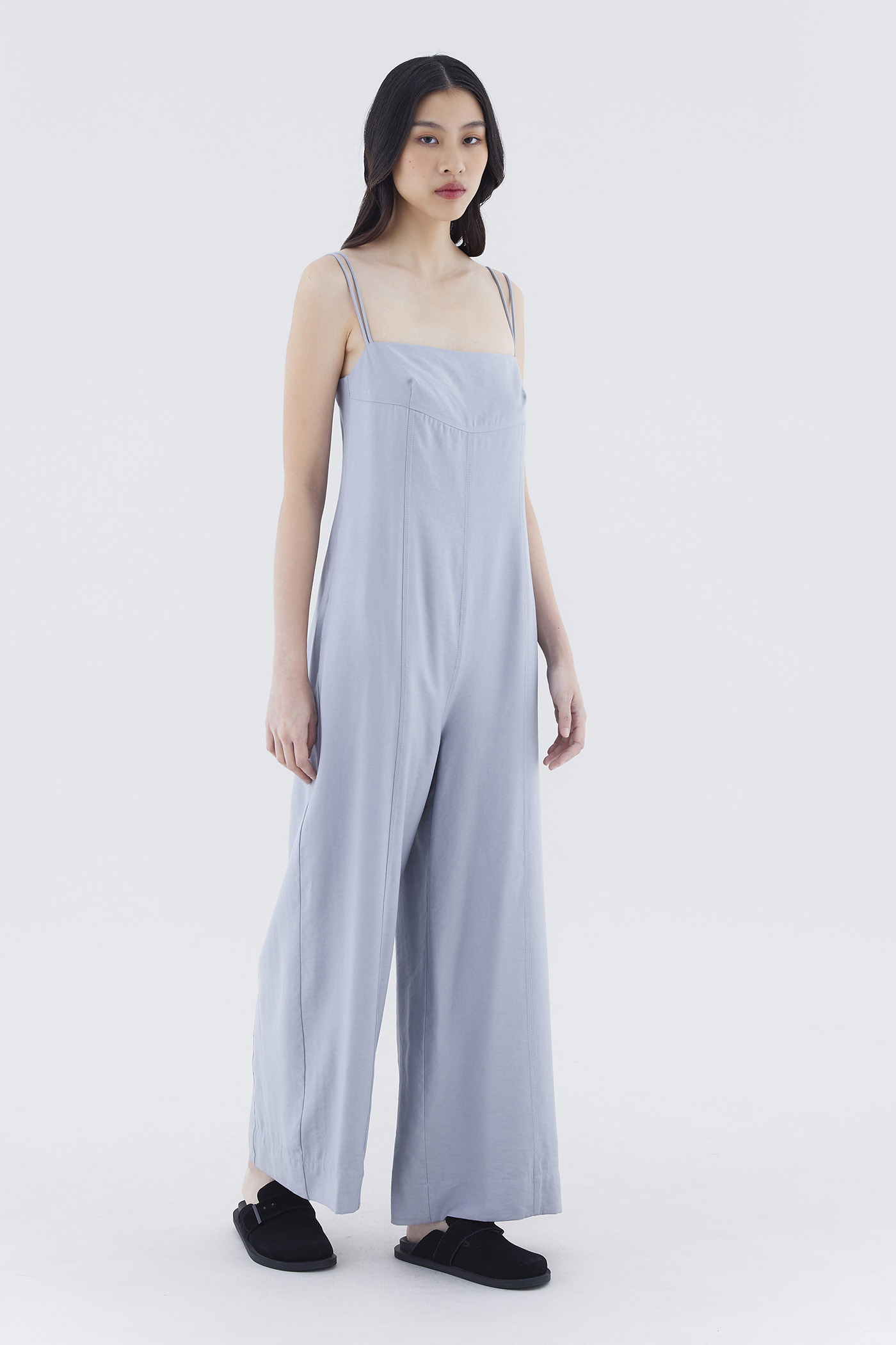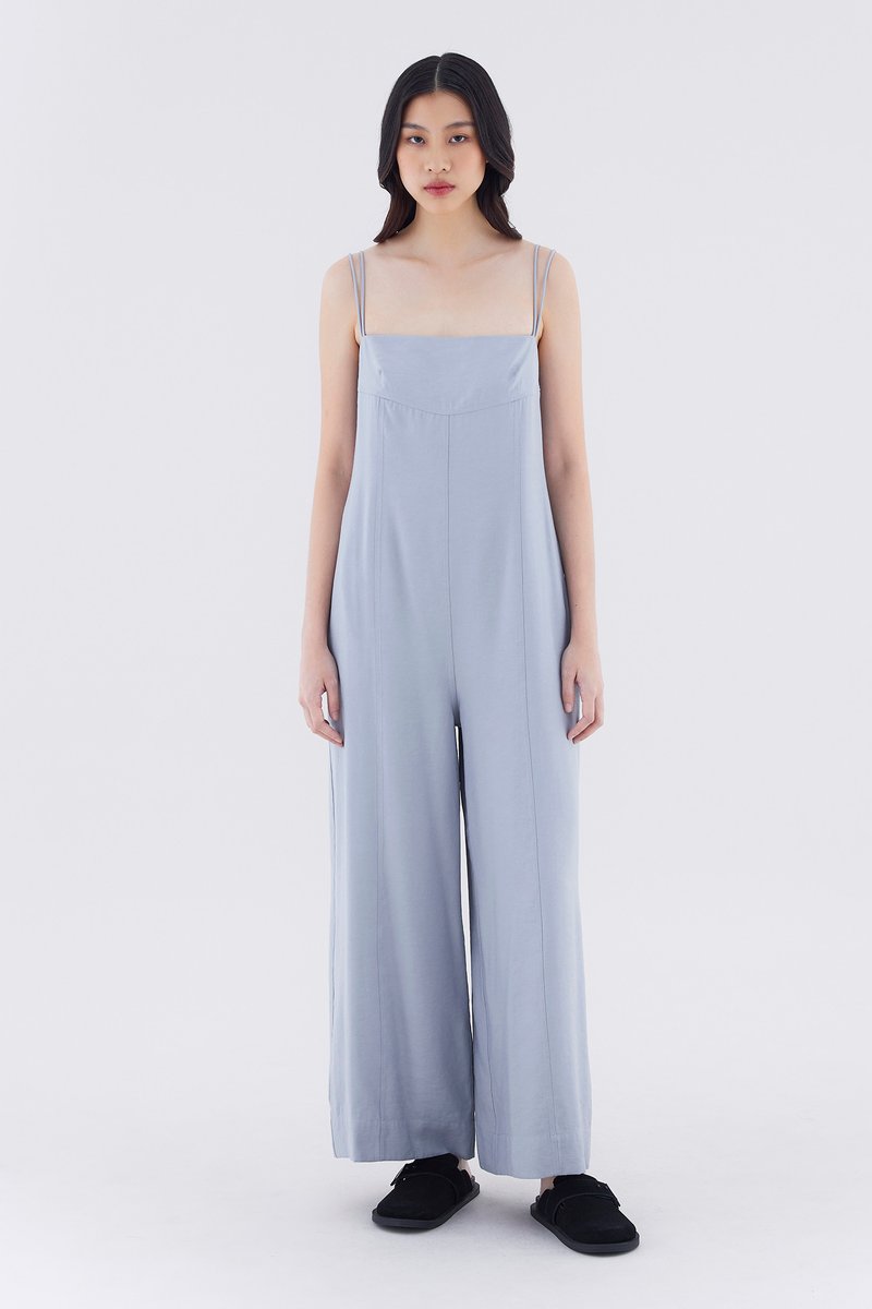 One piece wonder. Cut from smooth and drapey fabric, this sleeveless jumpsuit features double non-adjustable shoulder straps, a straight neckline, front panelling and wide legs. Fits relaxed with a back zip closure.