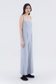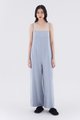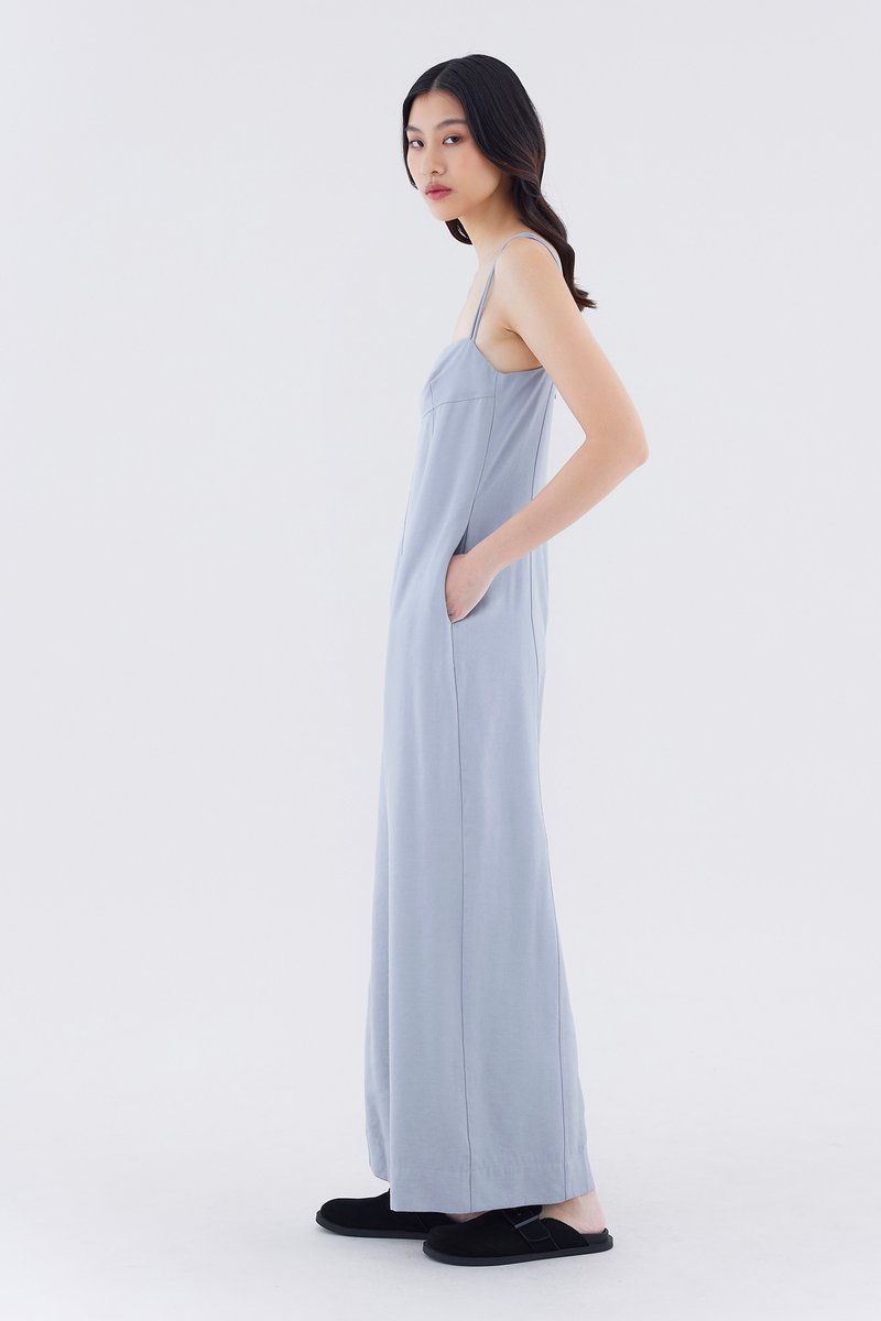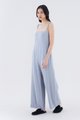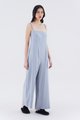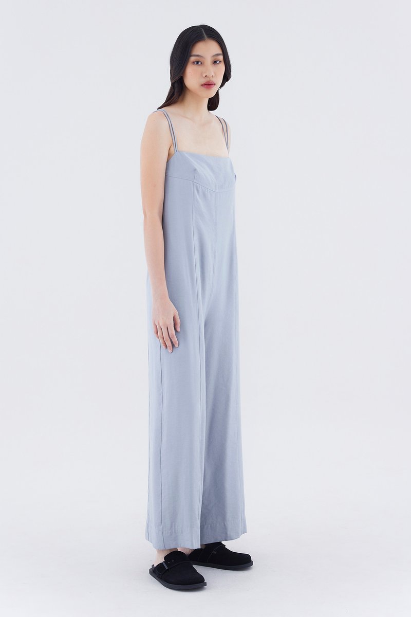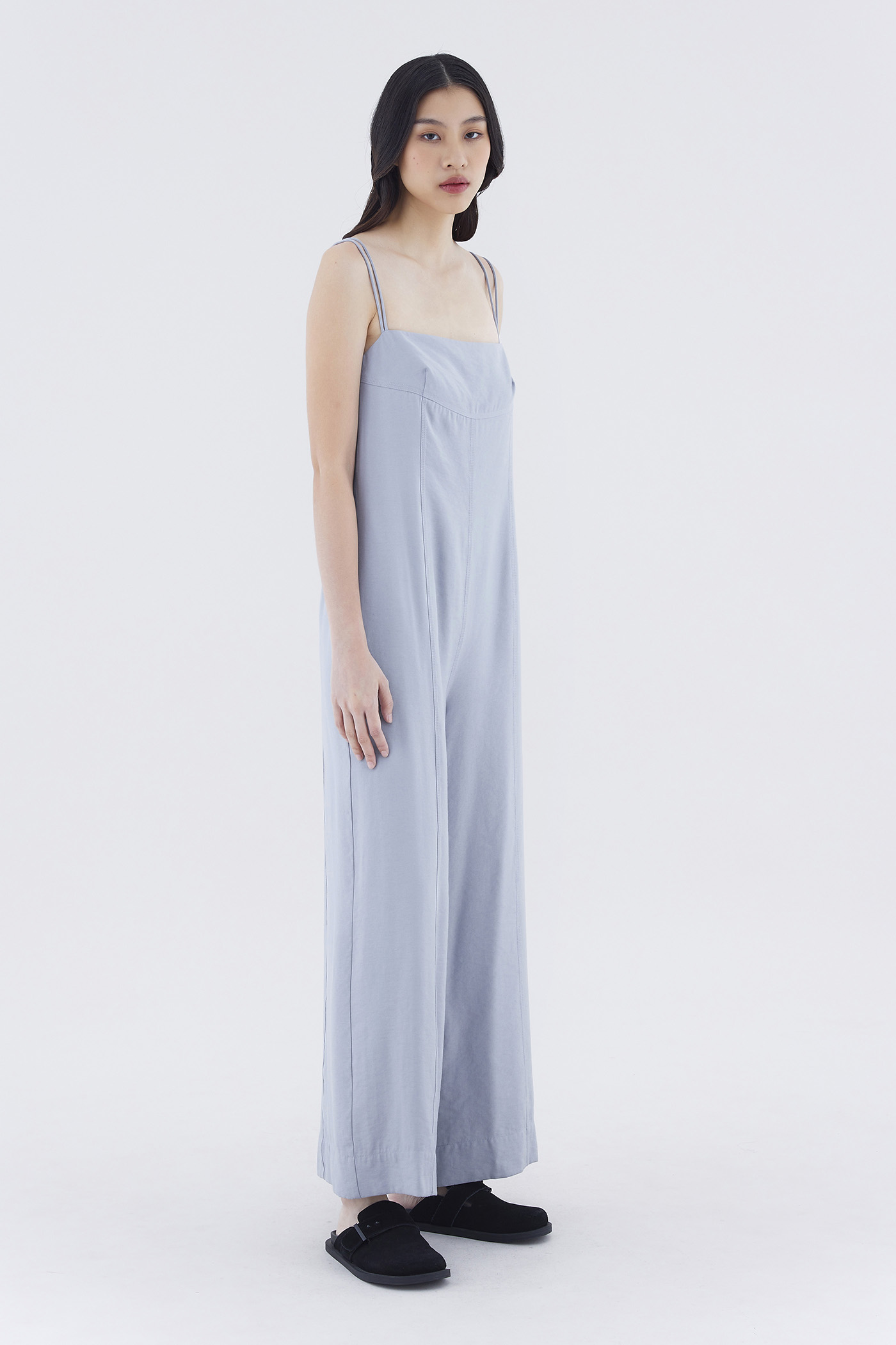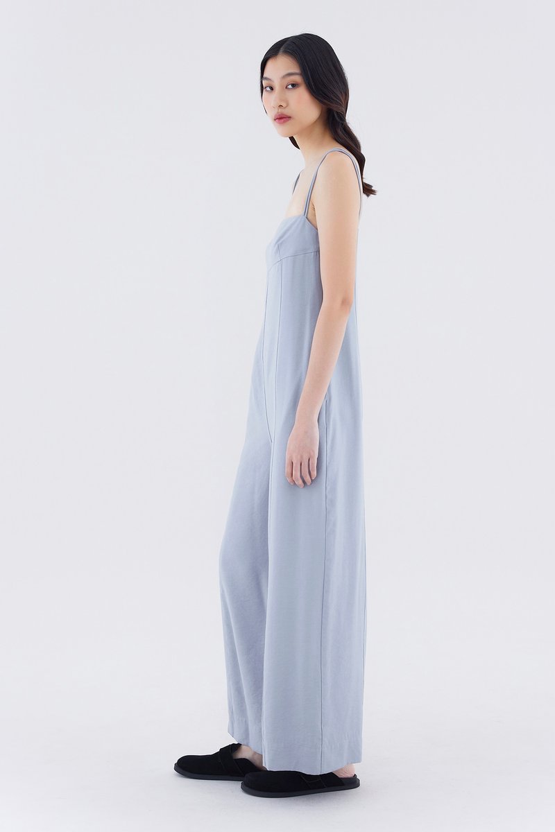 One piece wonder. Cut from smooth and drapey fabric, this sleeveless jumpsuit features double non-adjustable shoulder straps, a straight neckline, front panelling and wide legs. Fits relaxed with a back zip closure.