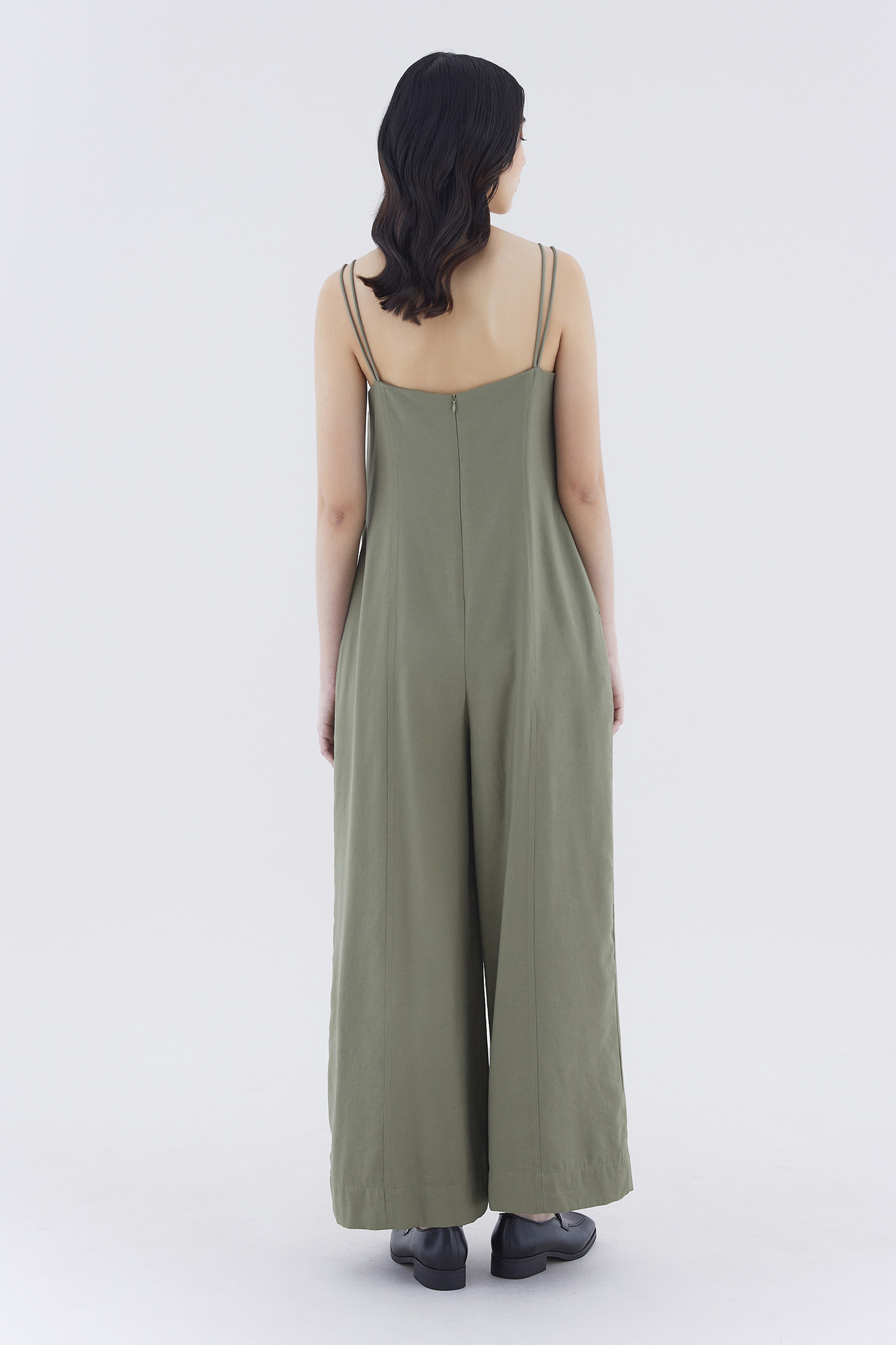 One piece wonder. Cut from smooth and drapey fabric, this sleeveless jumpsuit features double non-adjustable shoulder straps, a straight neckline, front panelling and wide legs. Fits relaxed with a back zip closure.