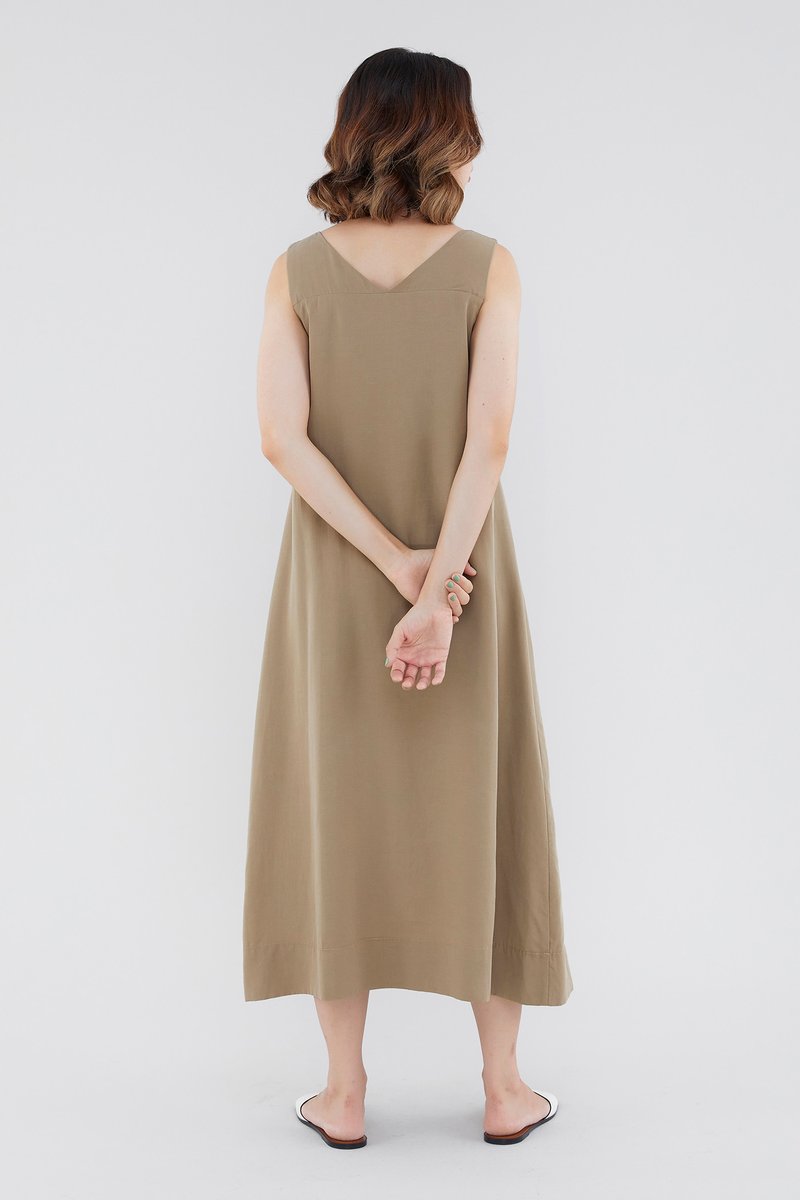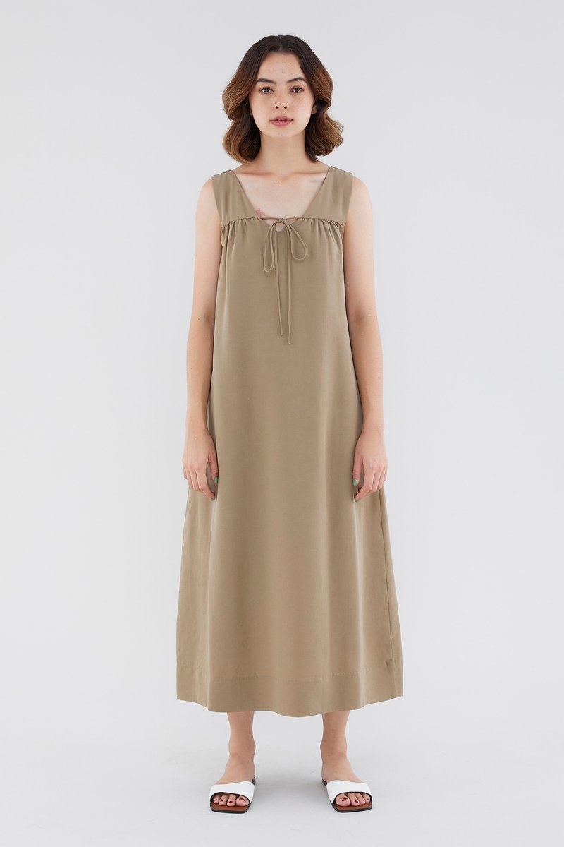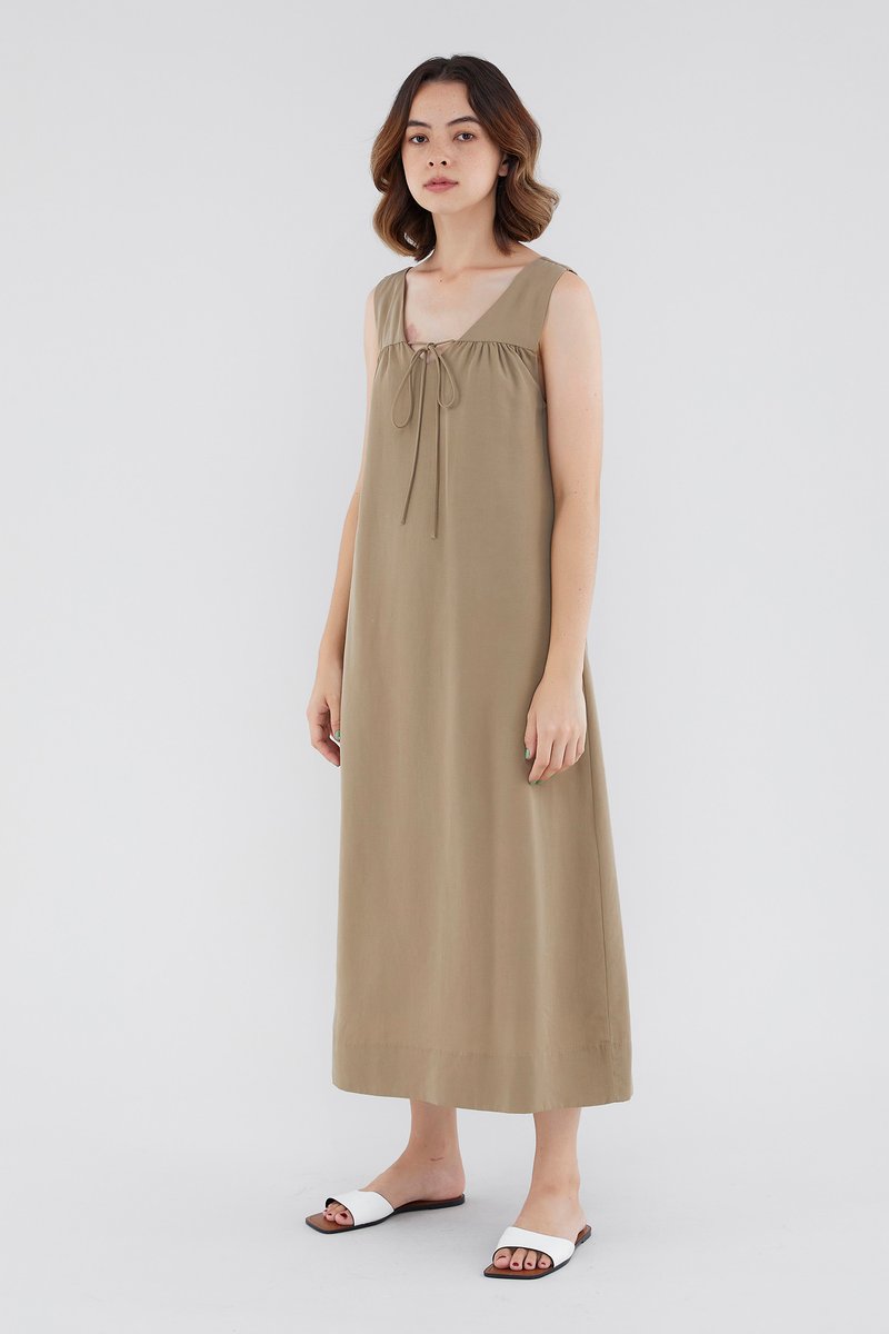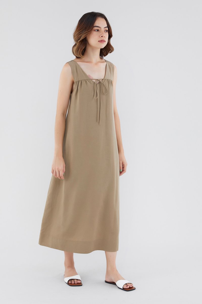 <p><span style="font-weight: 400;">Fabric Composition: 92% Lyocell 8% Linen</span></p> <p><span style="font-weight: 400;">Lining: Full</span></p> <p><span style="font-weight: 400;">Sheerness: Opaque</span></p> <p><span style="font-weight: 400;">Pockets: None</span></p> <p><span style="font-weight: 400;">A flowy favourite. Cut from flowy and non-stretch linen, this sleeveless maxi dress features a V-neckline with a self-tie closure, wide shoulder straps and a touch of ruching on the front. Worn in a relaxed, waistless fit. </span></p> <p><span style="font-weight: 400;">Care Instructions: Do not soak / Do not bleach / Handwash or Machine wash on gentle mode / Do not machine dry / Iron using low heat</span></p> <p><em>This piece is made from a combination of our Wear Better fabrics, linen and lyocell. Both are fully biodegradable, durable and derived from production processes that consume and generate significantly less resources and waste respectively — meaning your clothes have a longer, less environmentally damaging life cycle.</em></p>