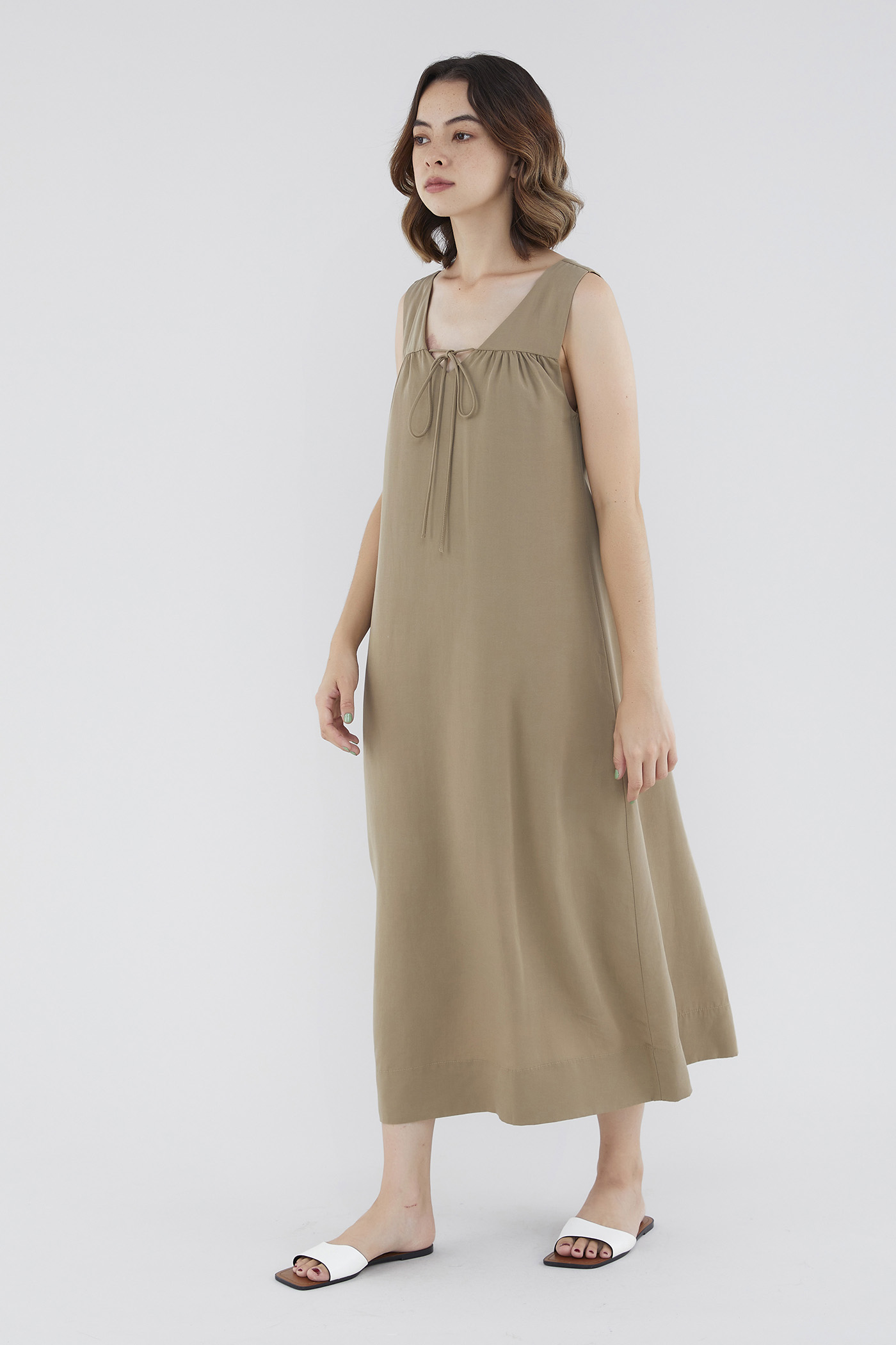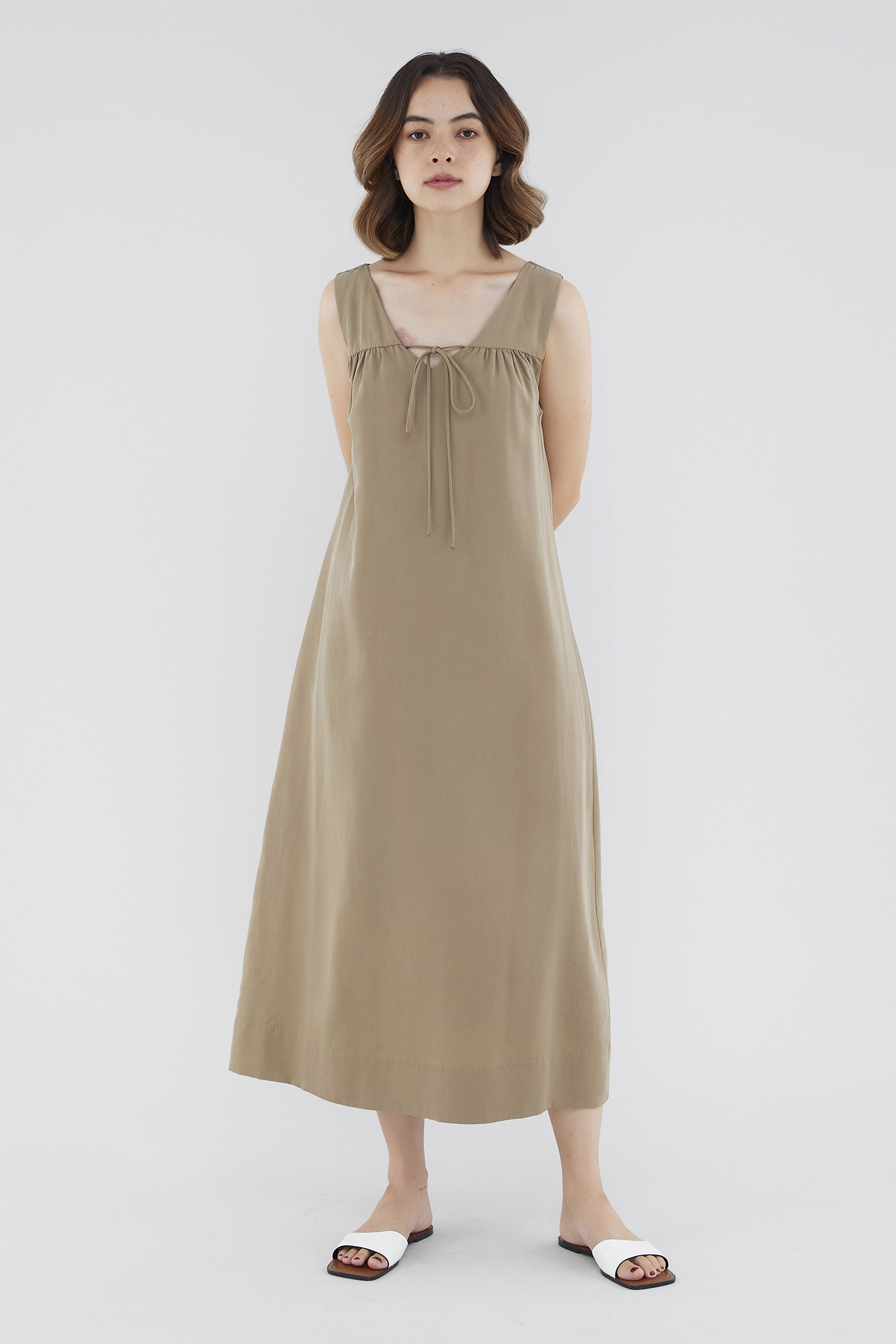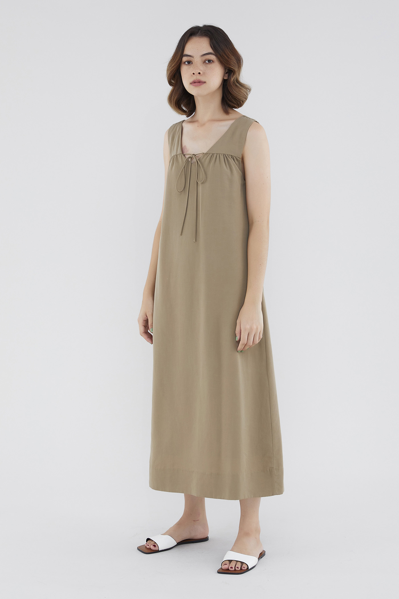 <p><span style="font-weight: 400;">Fabric Composition: 92% Lyocell 8% Linen</span></p> <p><span style="font-weight: 400;">Lining: Full</span></p> <p><span style="font-weight: 400;">Sheerness: Opaque</span></p> <p><span style="font-weight: 400;">Pockets: None</span></p> <p><span style="font-weight: 400;">A flowy favourite. Cut from flowy and non-stretch linen, this sleeveless maxi dress features a V-neckline with a self-tie closure, wide shoulder straps and a touch of ruching on the front. Worn in a relaxed, waistless fit. </span></p> <p><span style="font-weight: 400;">Care Instructions: Do not soak / Do not bleach / Handwash or Machine wash on gentle mode / Do not machine dry / Iron using low heat</span></p> <p><em>This piece is made from a combination of our Wear Better fabrics, linen and lyocell. Both are fully biodegradable, durable and derived from production processes that consume and generate significantly less resources and waste respectively — meaning your clothes have a longer, less environmentally damaging life cycle.</em></p>