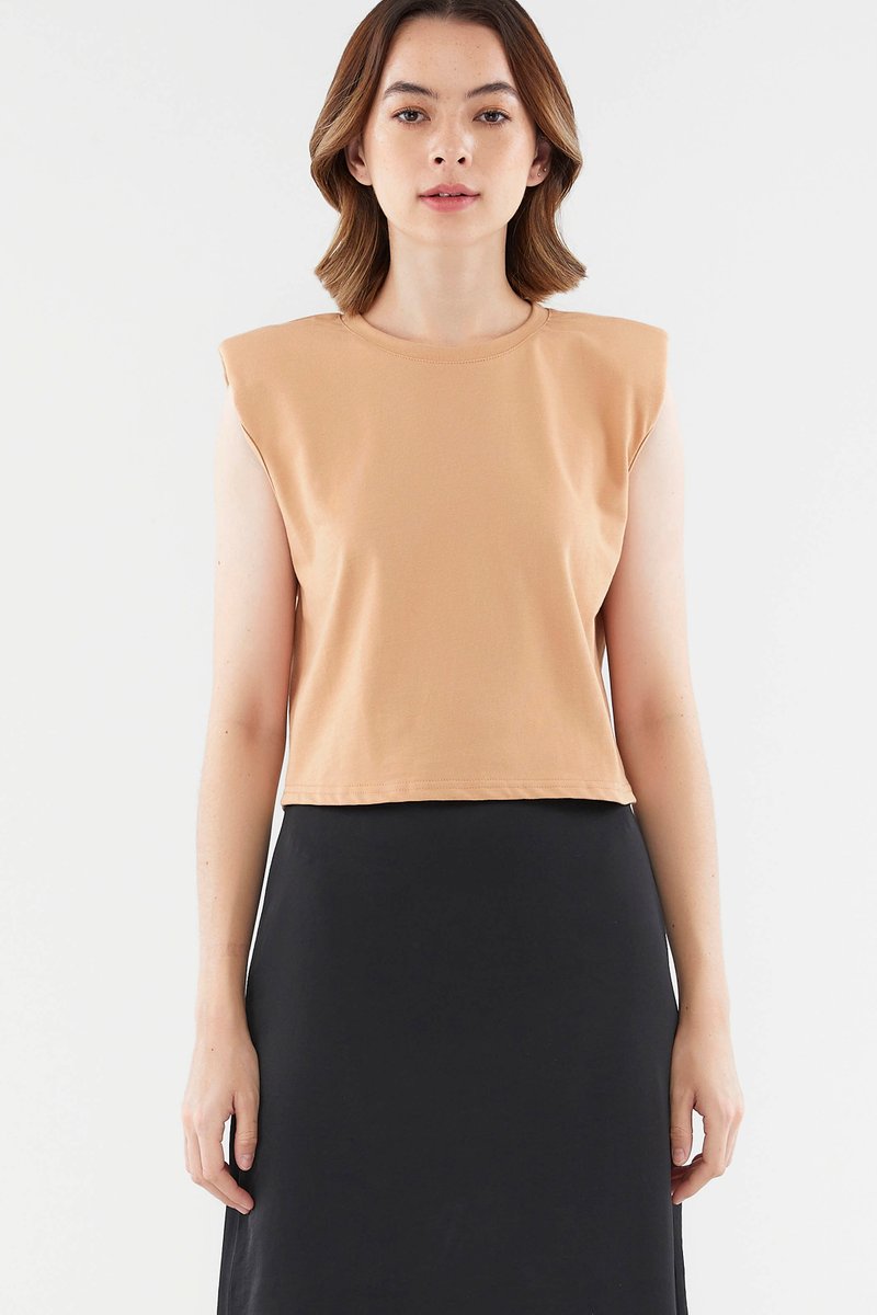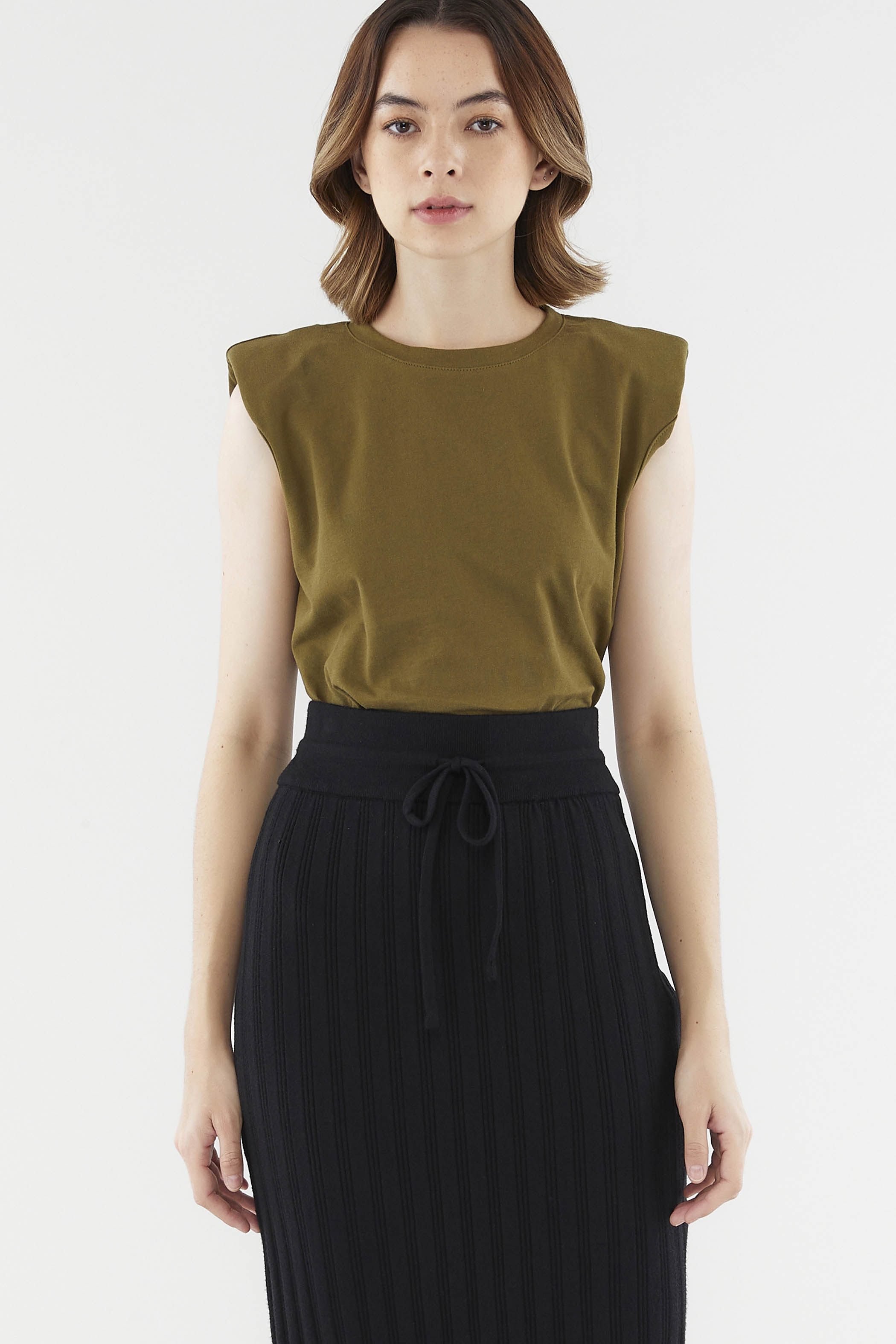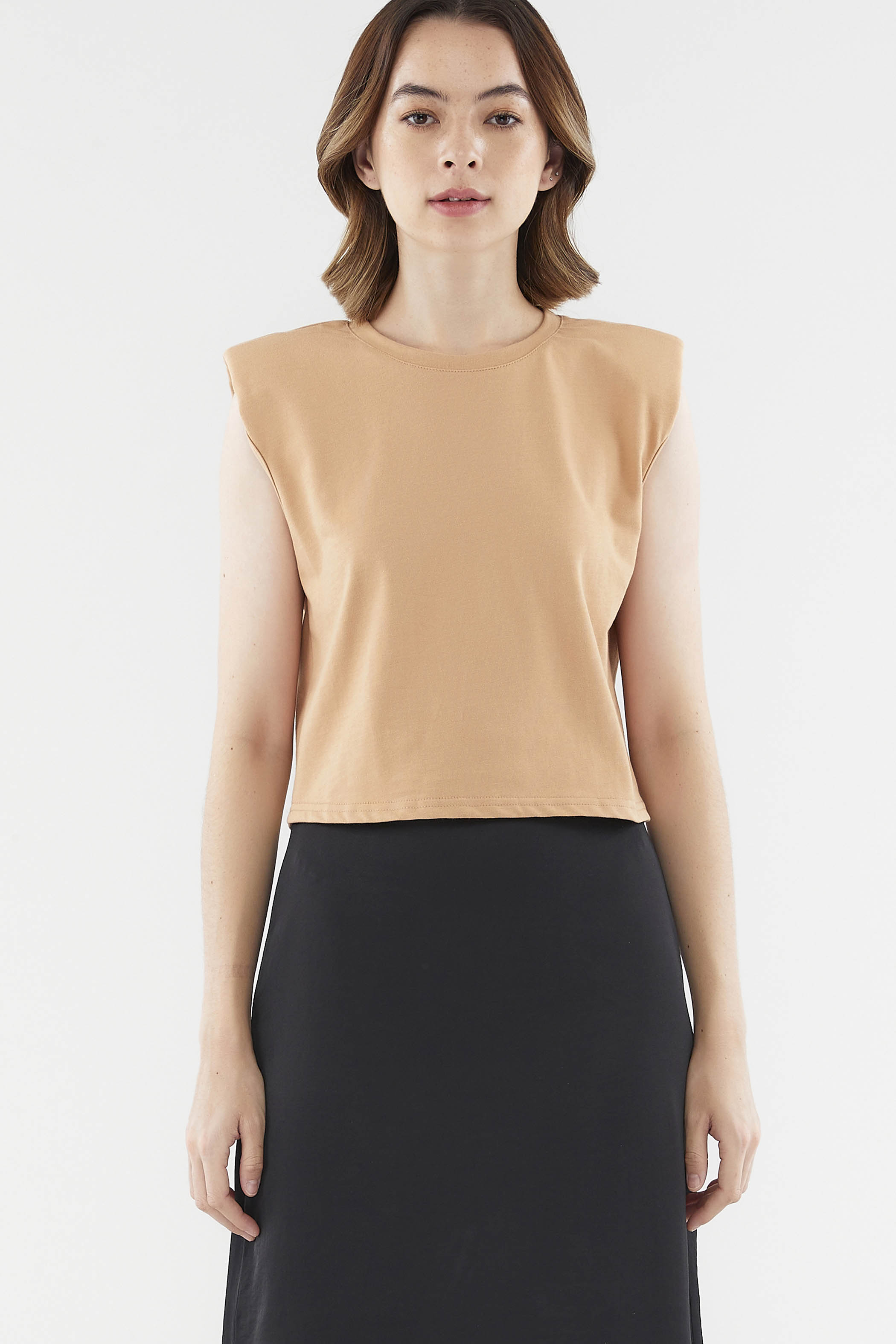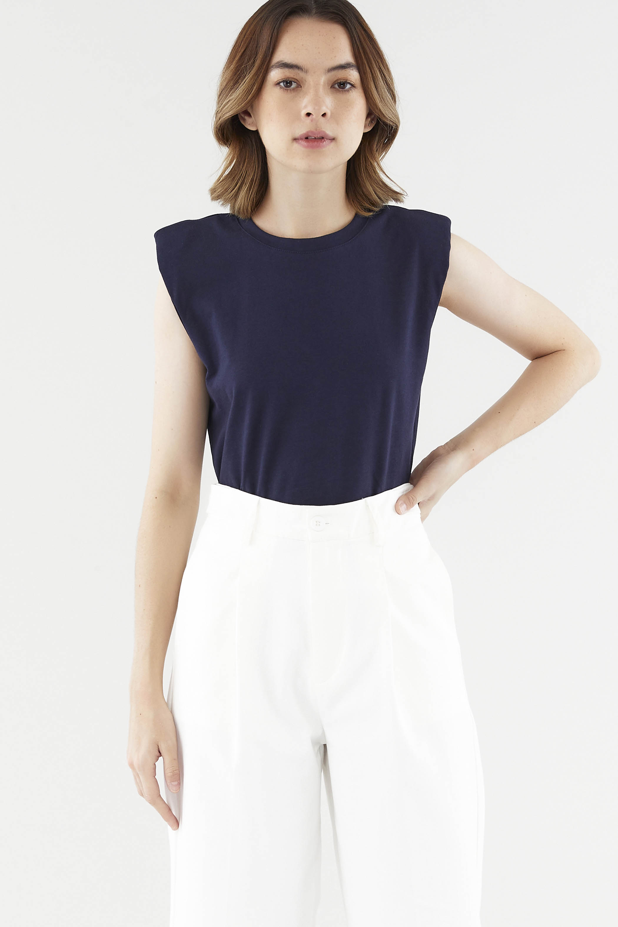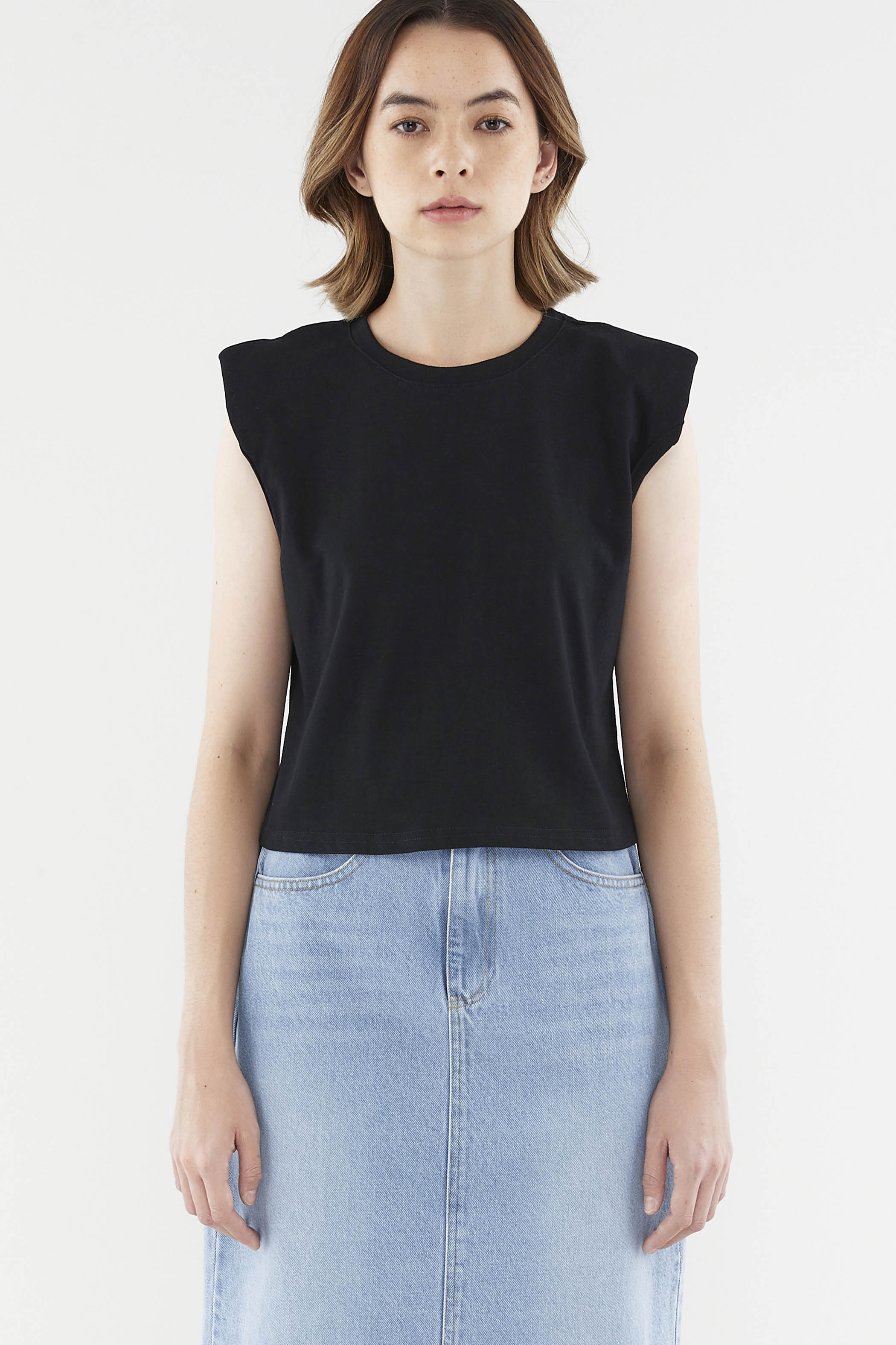 Not your usual tee. Made from stretchy and non-sheer cotton jersey, this sleeveless top features a flattering round neckline, capped sleeves and lightly padded shoulders. Worn in a relaxed fit and cropped length.