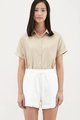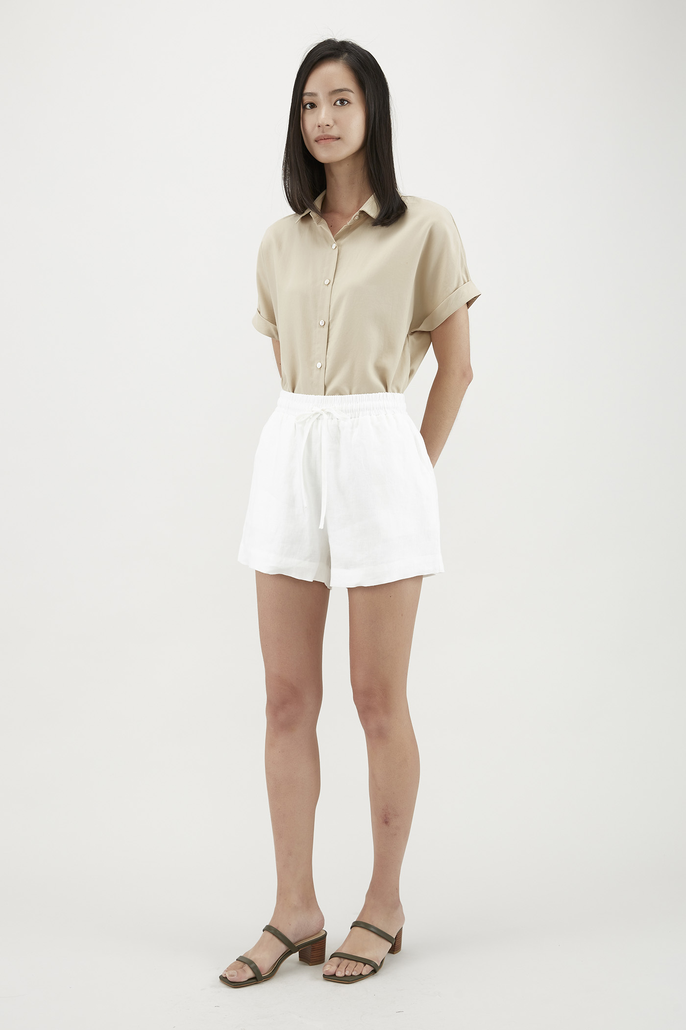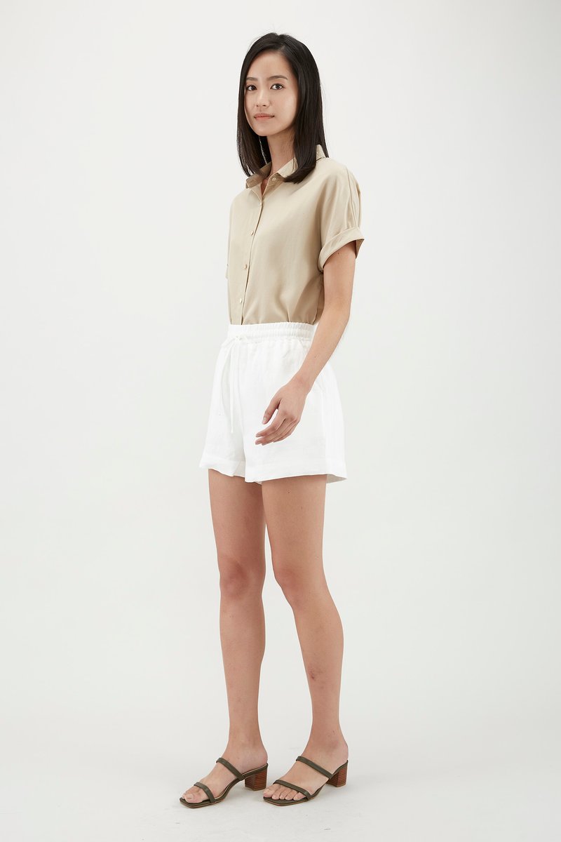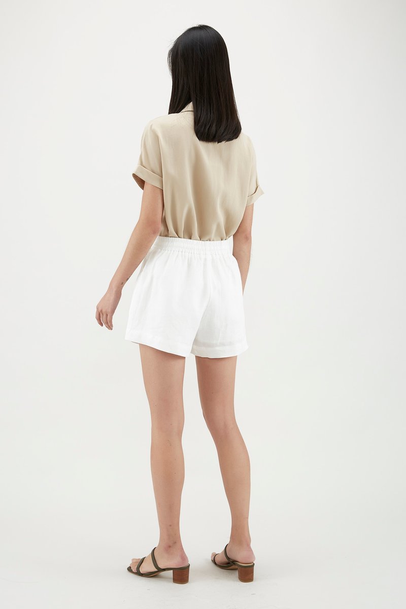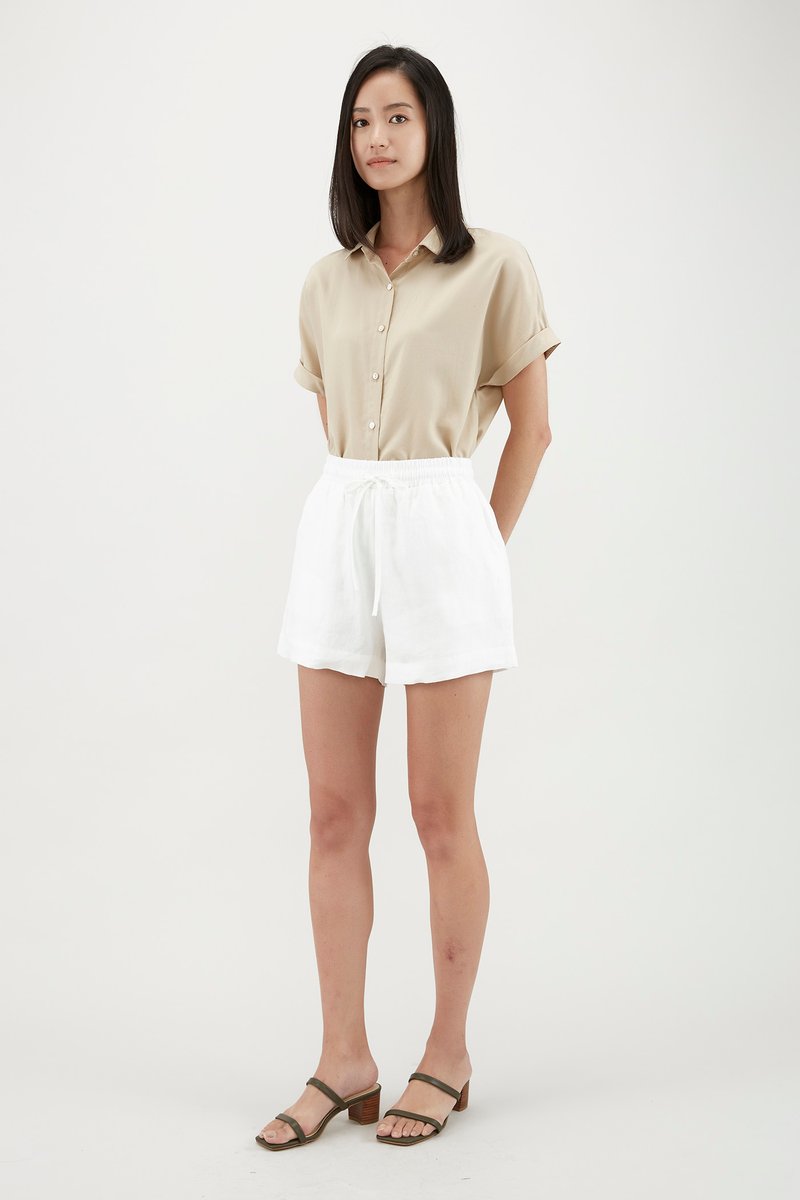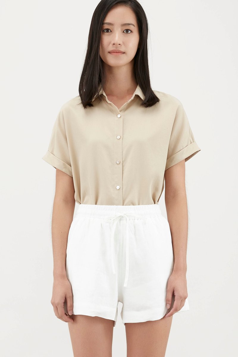 Stay cool and comfy in this warm weather staple. Made from soft and unlined lyocell, this shirt features short cuffed sleeves, rounded collars and a front button closure. Worn in a relaxed, oversized fit. Nude undergarments are recommended for lighter colour options.