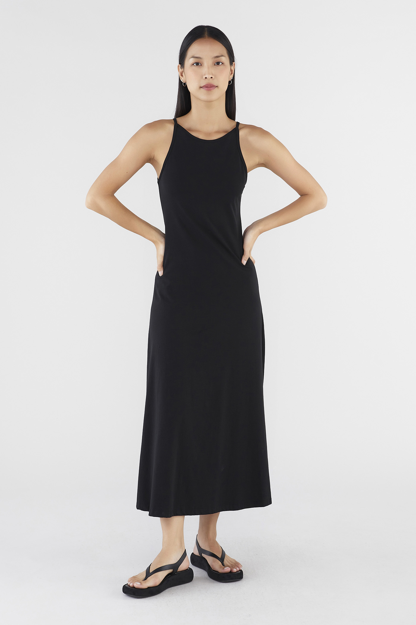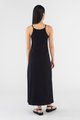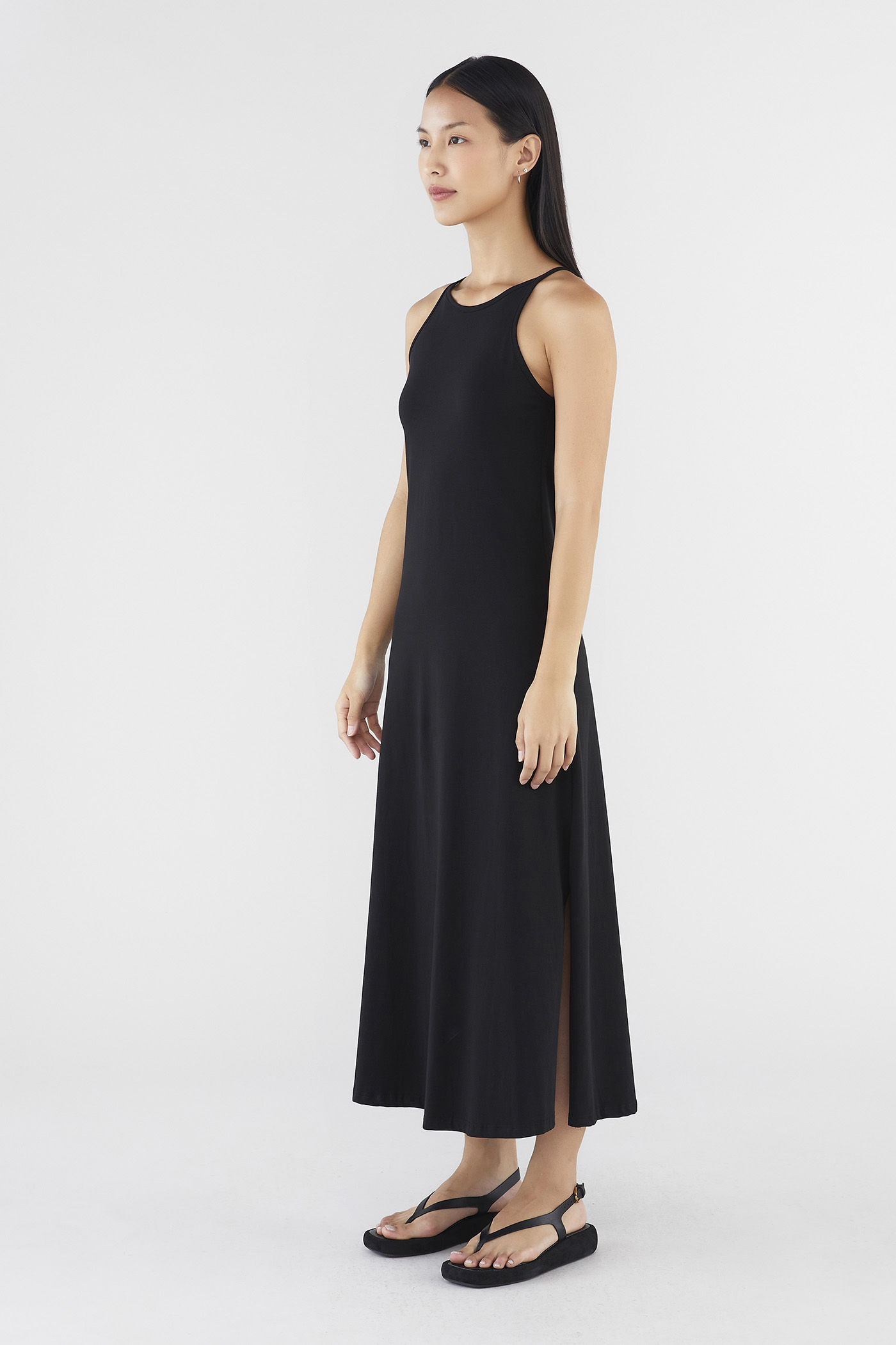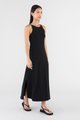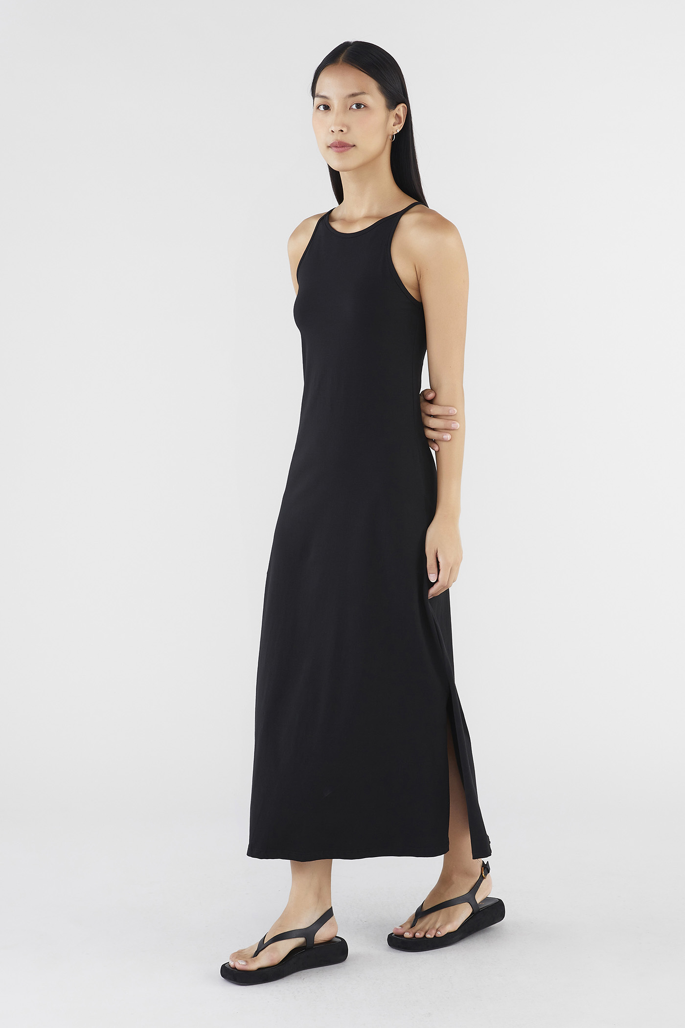 Keep it seamless. Made from smooth and stretchy fabric, this sleeveless maxi dress features a wide, round neckline, slim non-adjustable shoulder straps and a split-hem skirt. Worn in a slim fit.