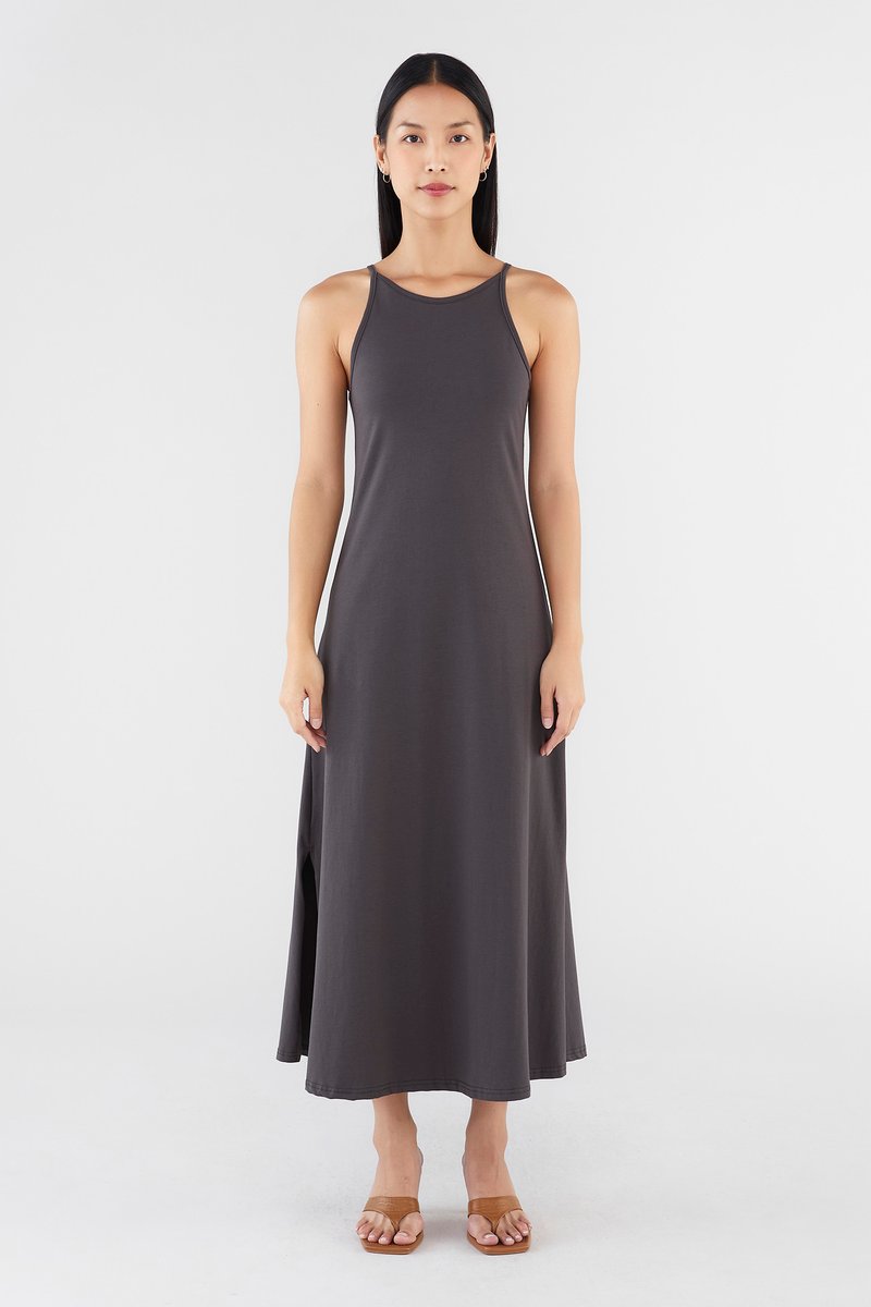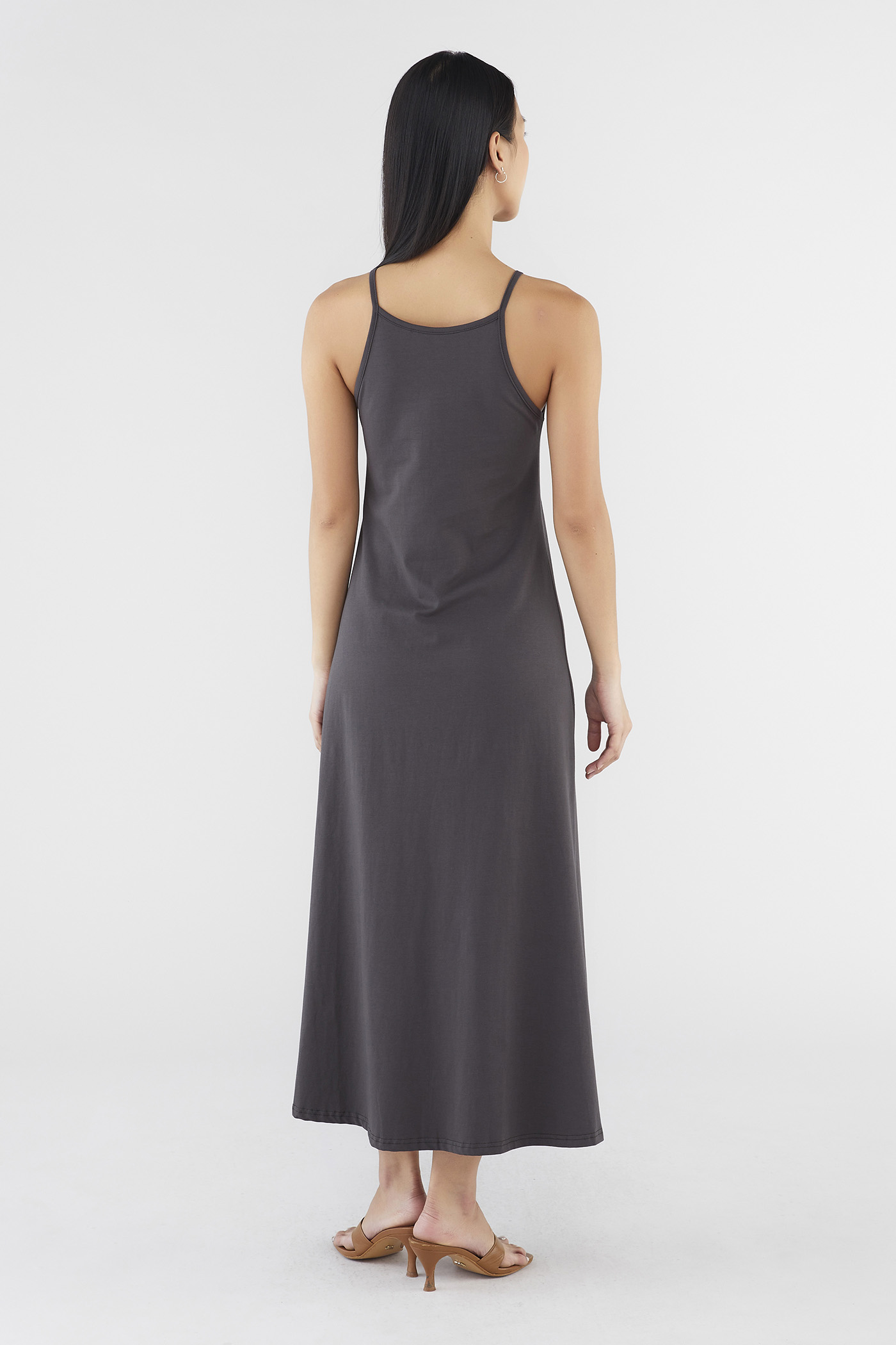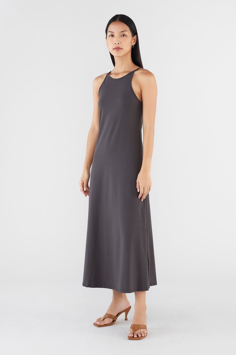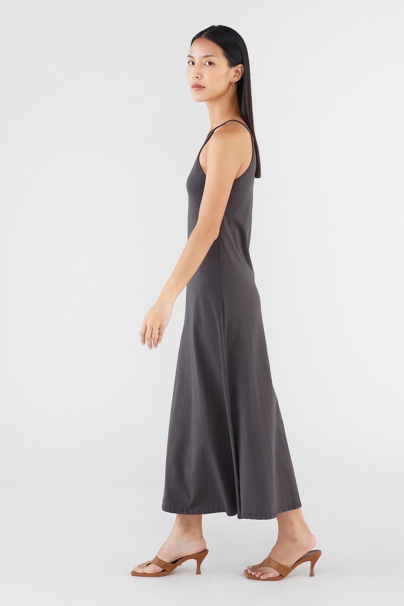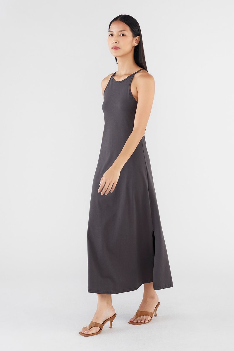 Keep it seamless. Made from smooth and stretchy fabric, this sleeveless maxi dress features a wide, round neckline, slim non-adjustable shoulder straps and a split-hem skirt. Worn in a slim fit.