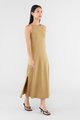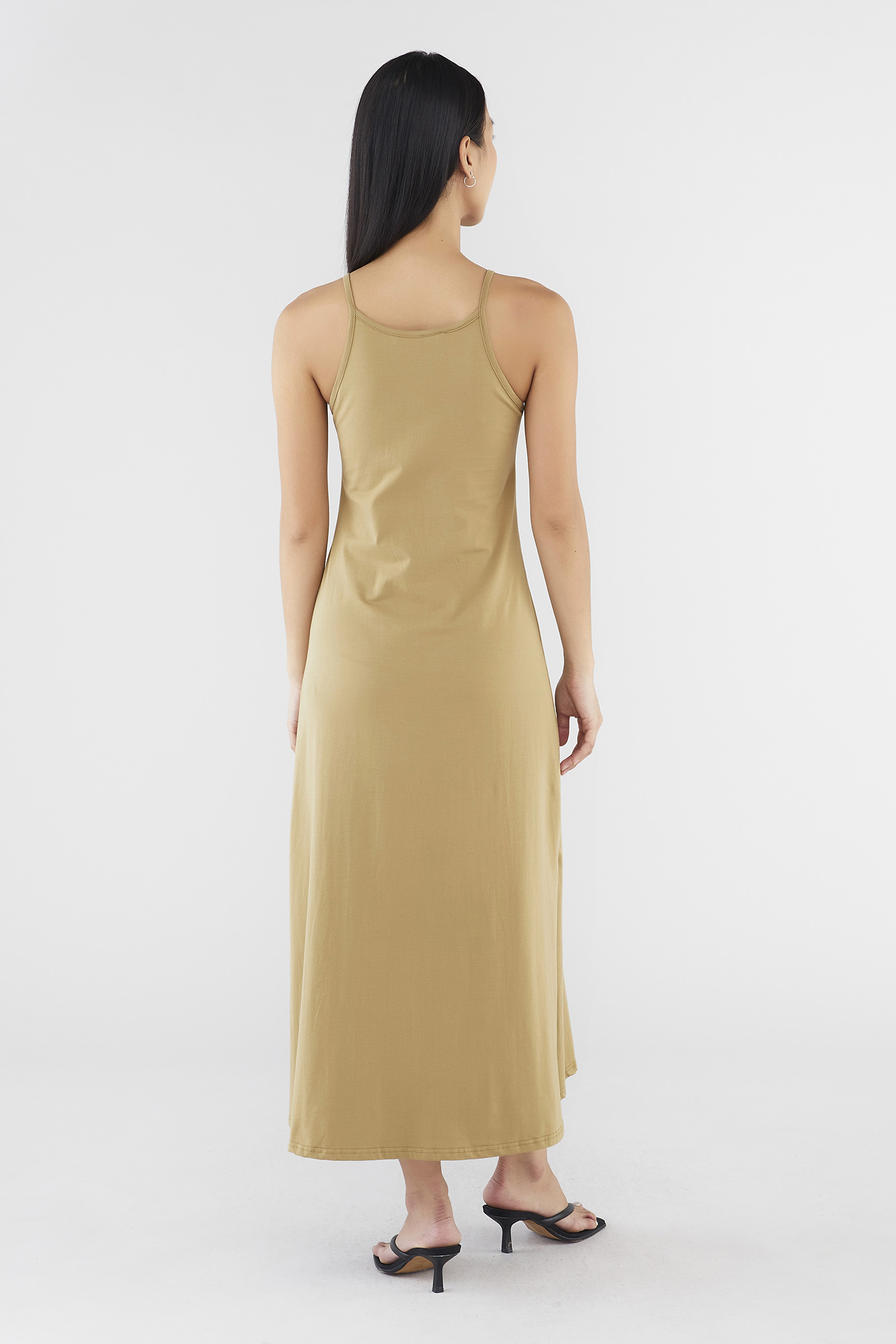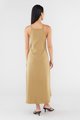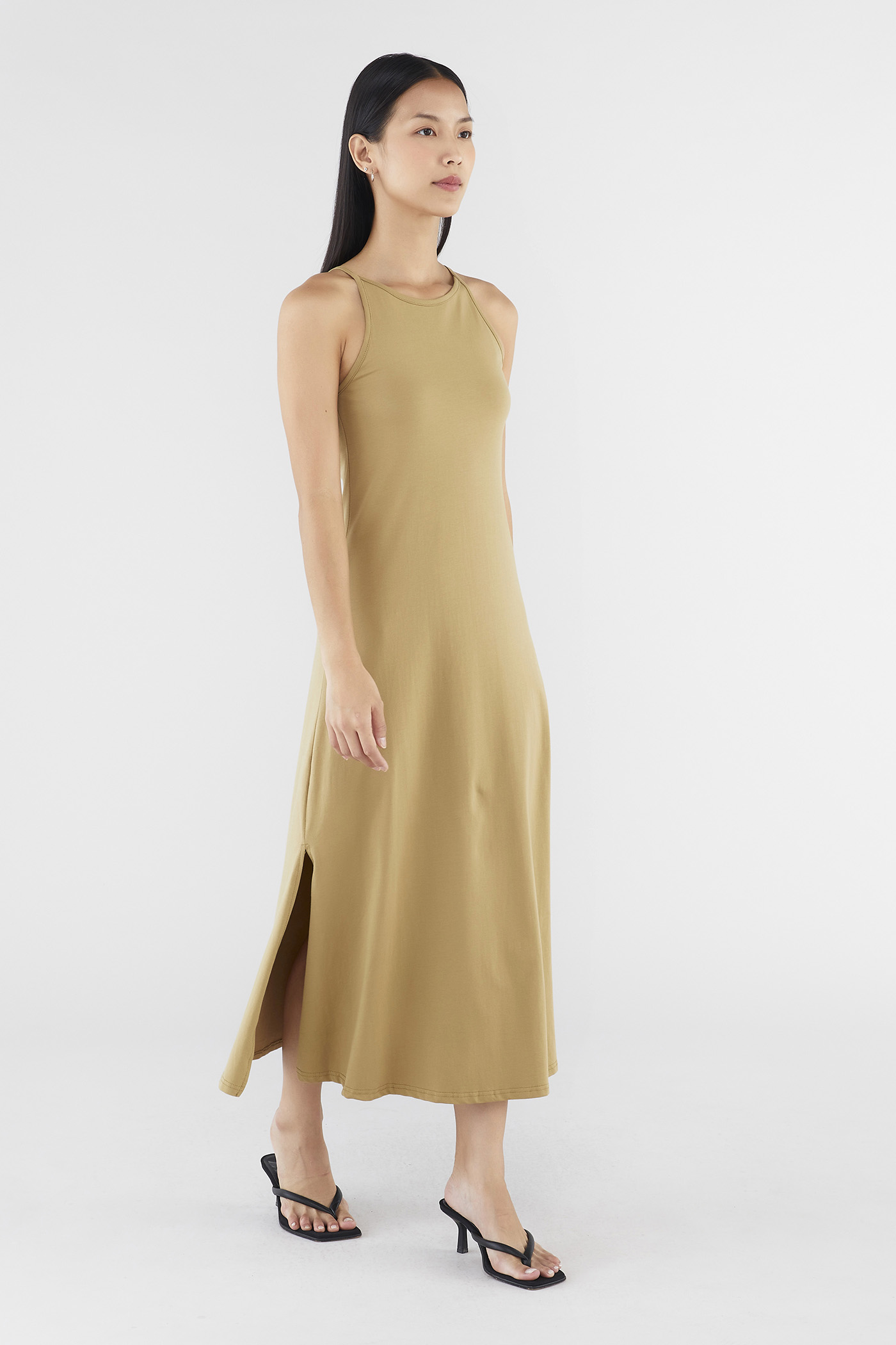 Keep it seamless. Made from smooth and stretchy fabric, this sleeveless maxi dress features a wide, round neckline, slim non-adjustable shoulder straps and a split-hem skirt. Worn in a slim fit.