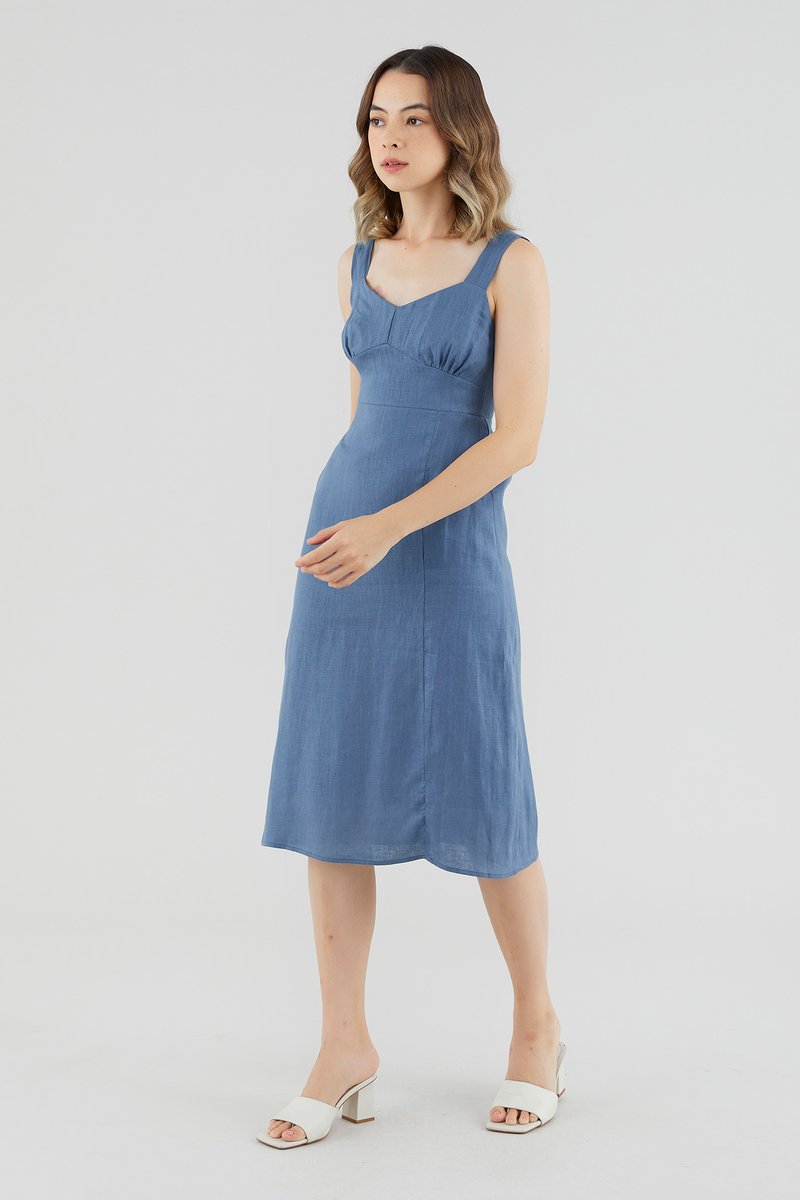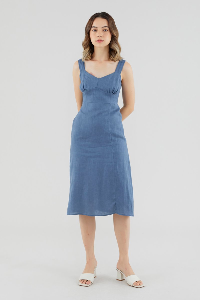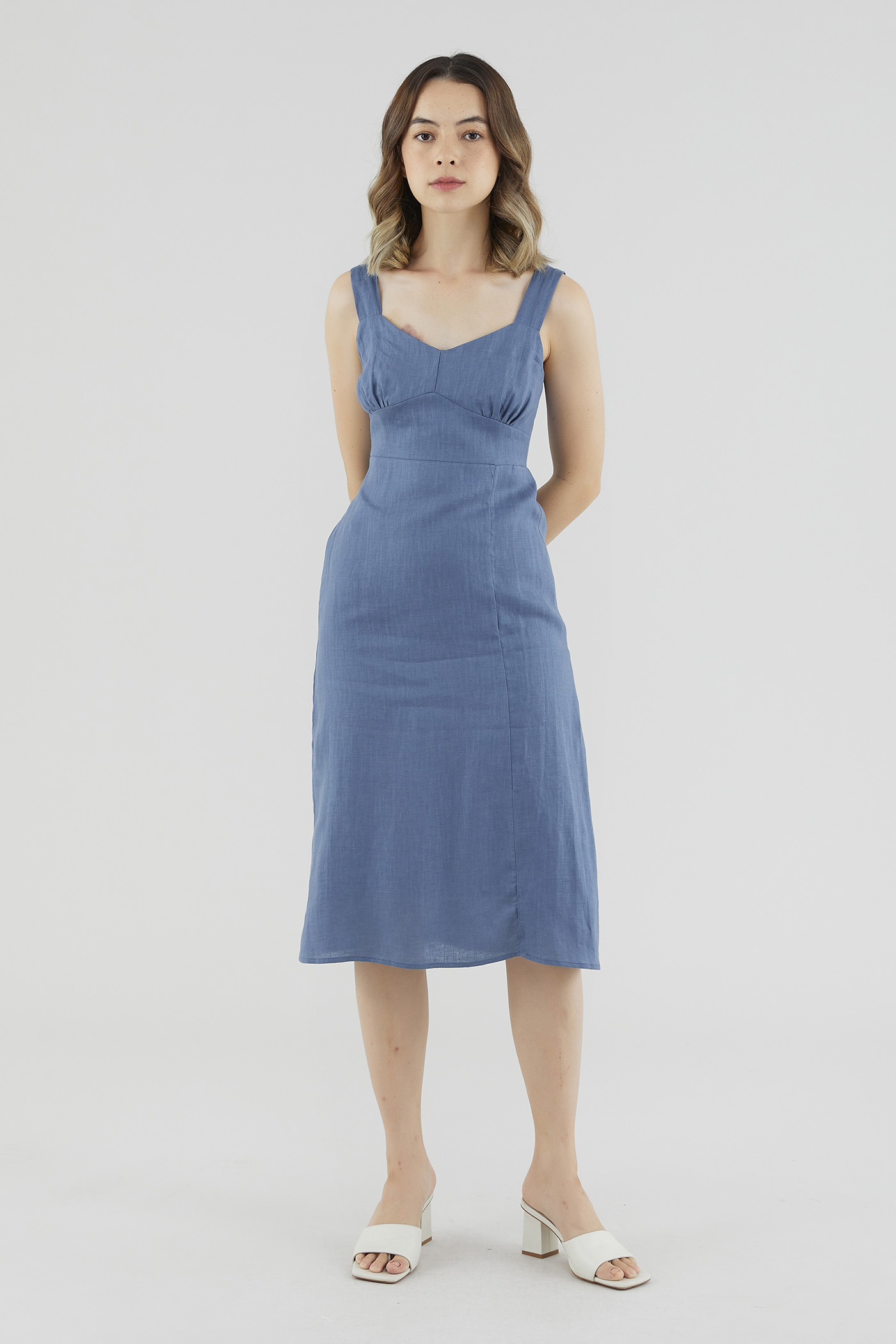 Down for the weekend. Cut from crisp and gently tailored 100% linen, this sleeveless knee-length dress features wide straps, a dipped neckline, a ruched bust, a fitted waist and a smocked back. Fits slim with a zip closure on the side.