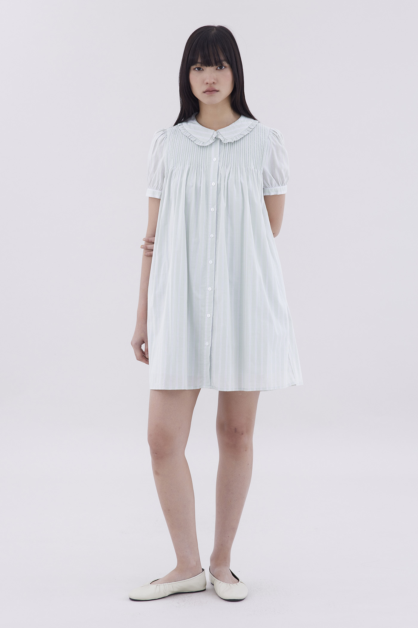 Obsessed. Made from smooth and crisp cotton, this above-the-knee dress features ruffle-trimmed collars, short puffy sleeves with a buttoned hem, pin-tuck pleats and a button-down front. Worn in a relaxed fit.