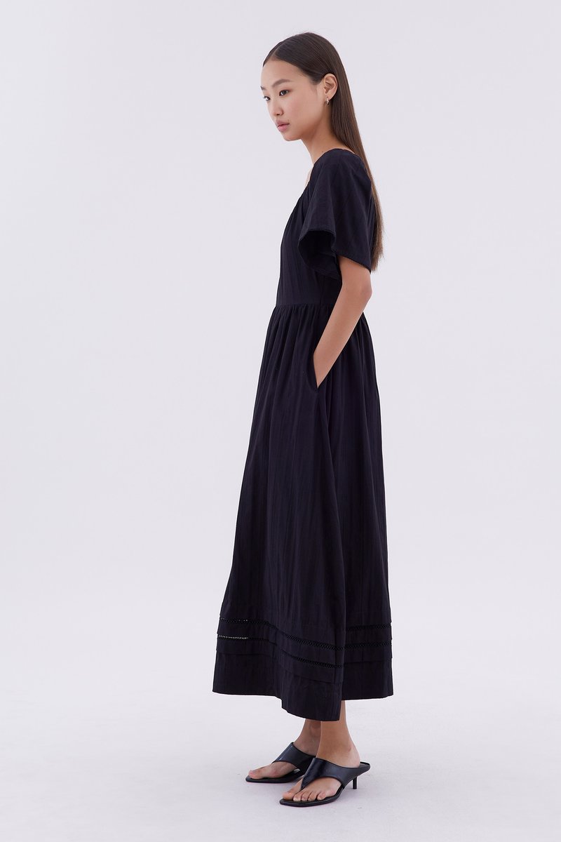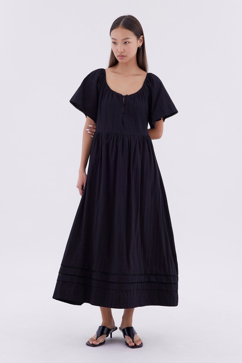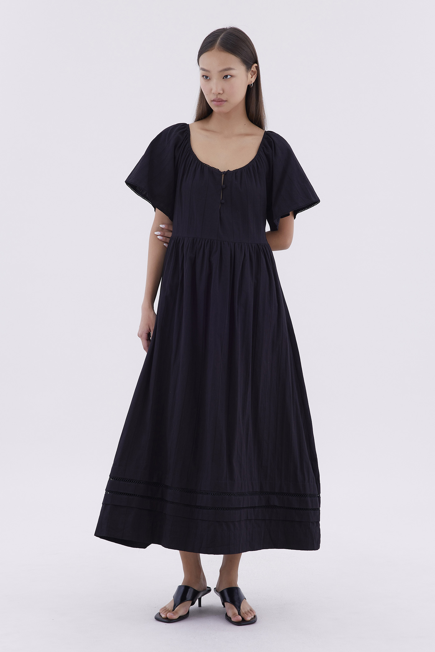 Big statement. Made from airy and softly structured cotton, this maxi dress features a round lace-trimmed neckline, short lace-trimmed bell sleeves, front buttons, bottom pleats and a side zip closure. Worn in an A-line silhouette that fits slimmer at the waist before flaring out in a relaxed skirt.