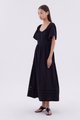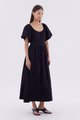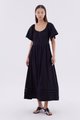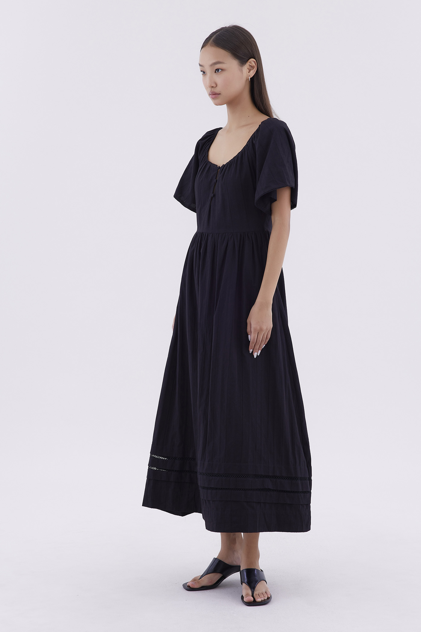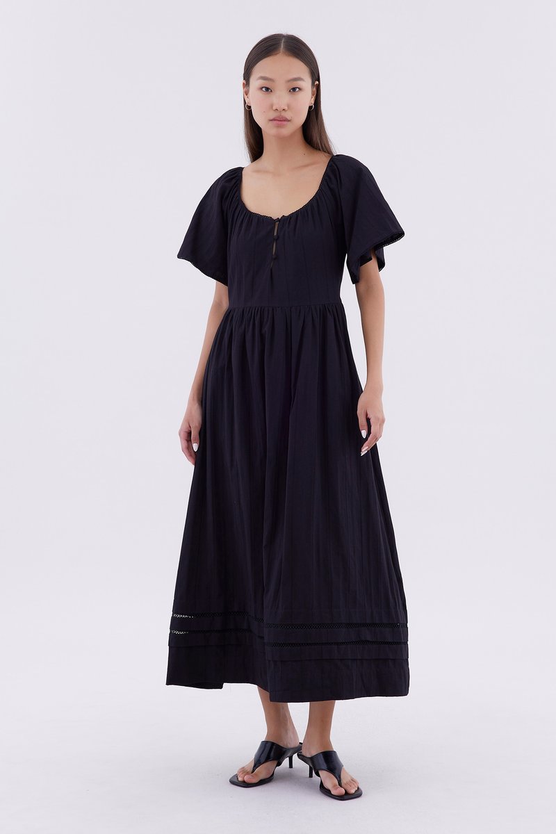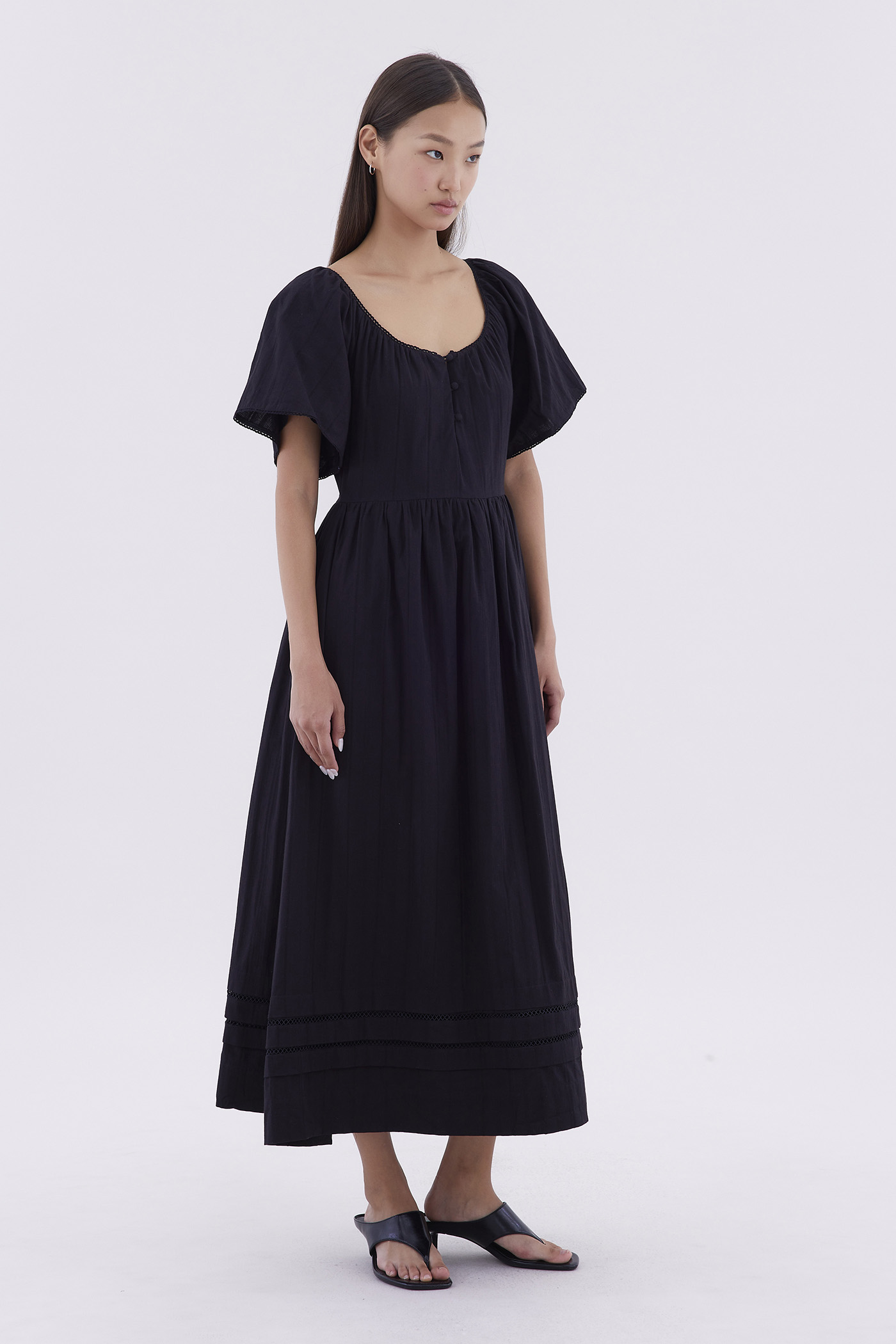 Big statement. Made from airy and softly structured cotton, this maxi dress features a round lace-trimmed neckline, short lace-trimmed bell sleeves, front buttons, bottom pleats and a side zip closure. Worn in an A-line silhouette that fits slimmer at the waist before flaring out in a relaxed skirt.