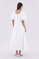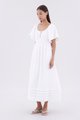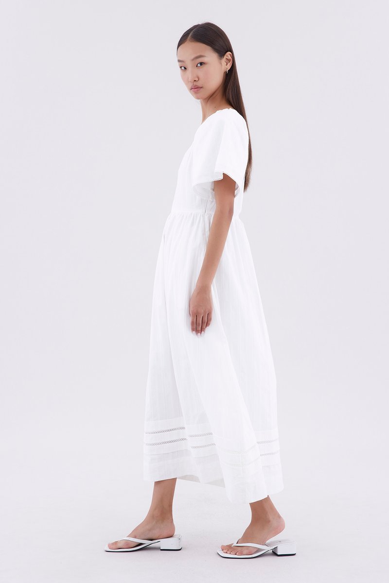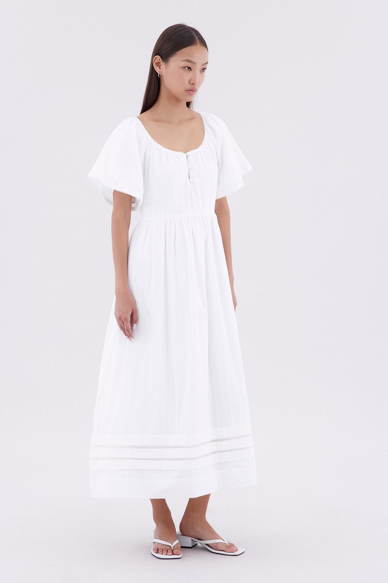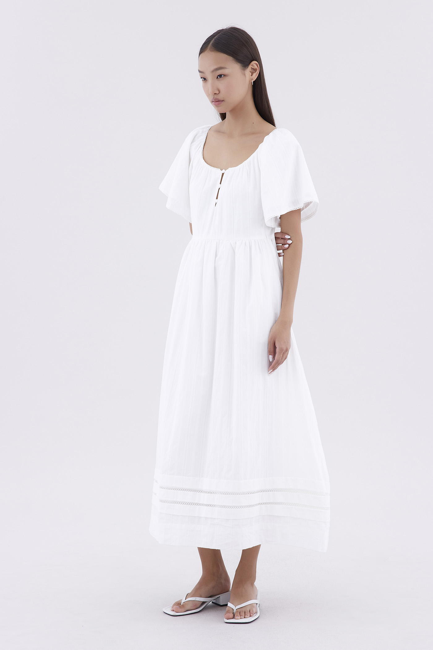 Big statement. Made from airy and softly structured cotton, this maxi dress features a round lace-trimmed neckline, short lace-trimmed bell sleeves, front buttons, bottom pleats and a side zip closure. Worn in an A-line silhouette that fits slimmer at the waist before flaring out in a relaxed skirt.