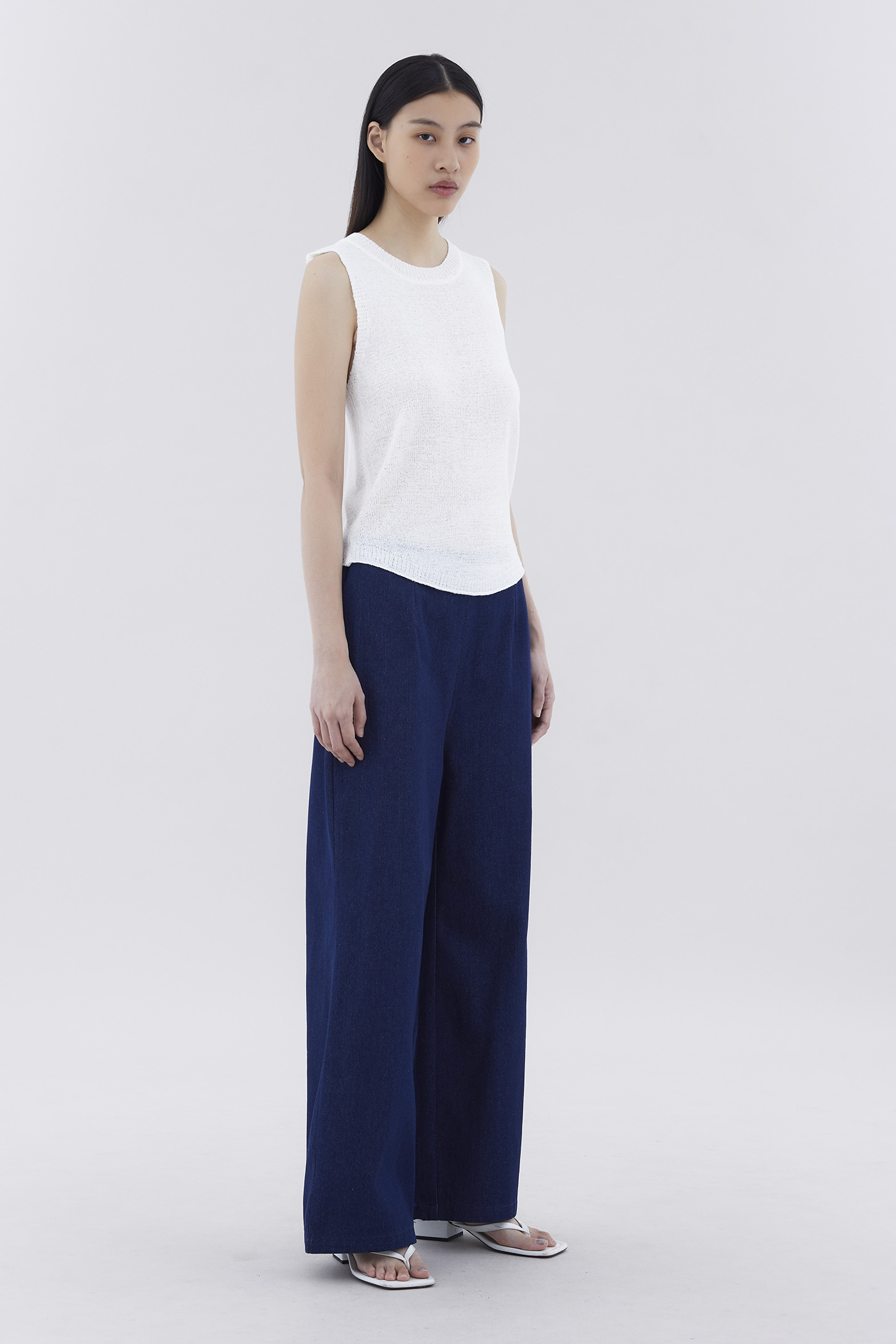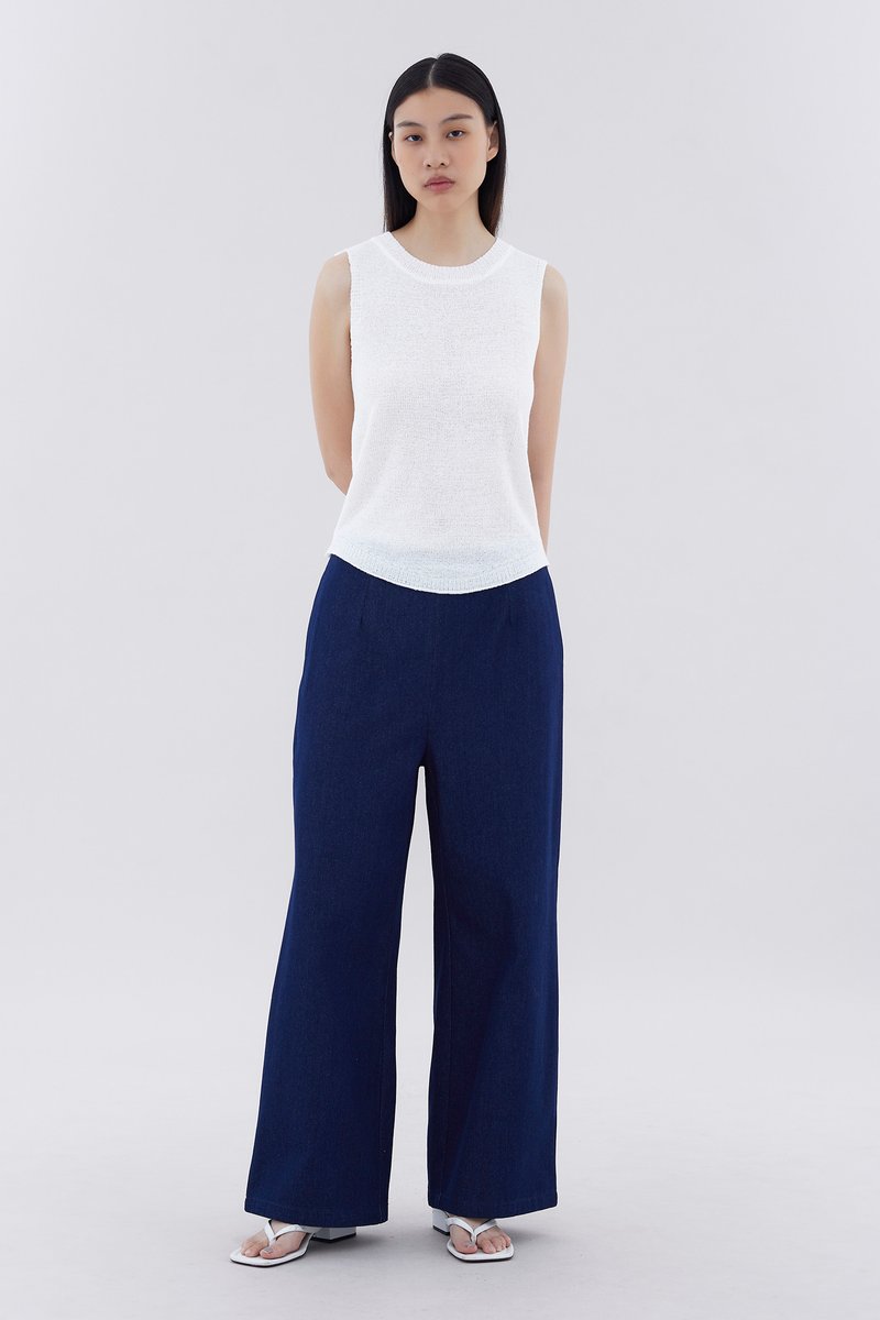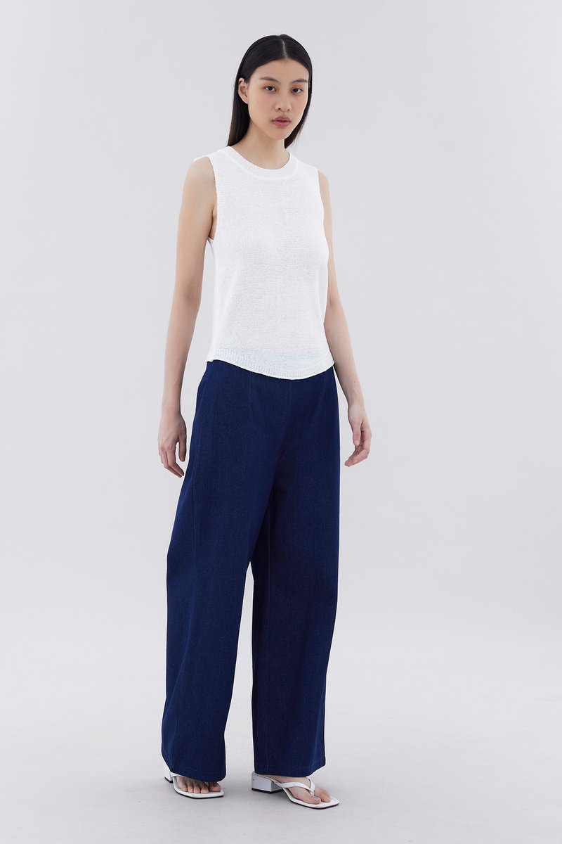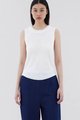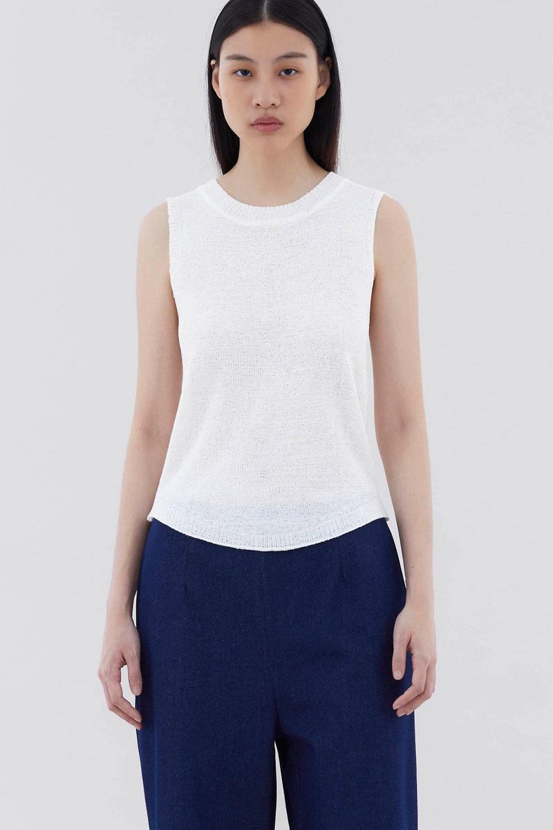 Unite your wardrobe. Made from soft and stretchy knit fabric, this sleeveless tank features a ribbed round neckline and lettuce hem. Worn in a relaxed fit.