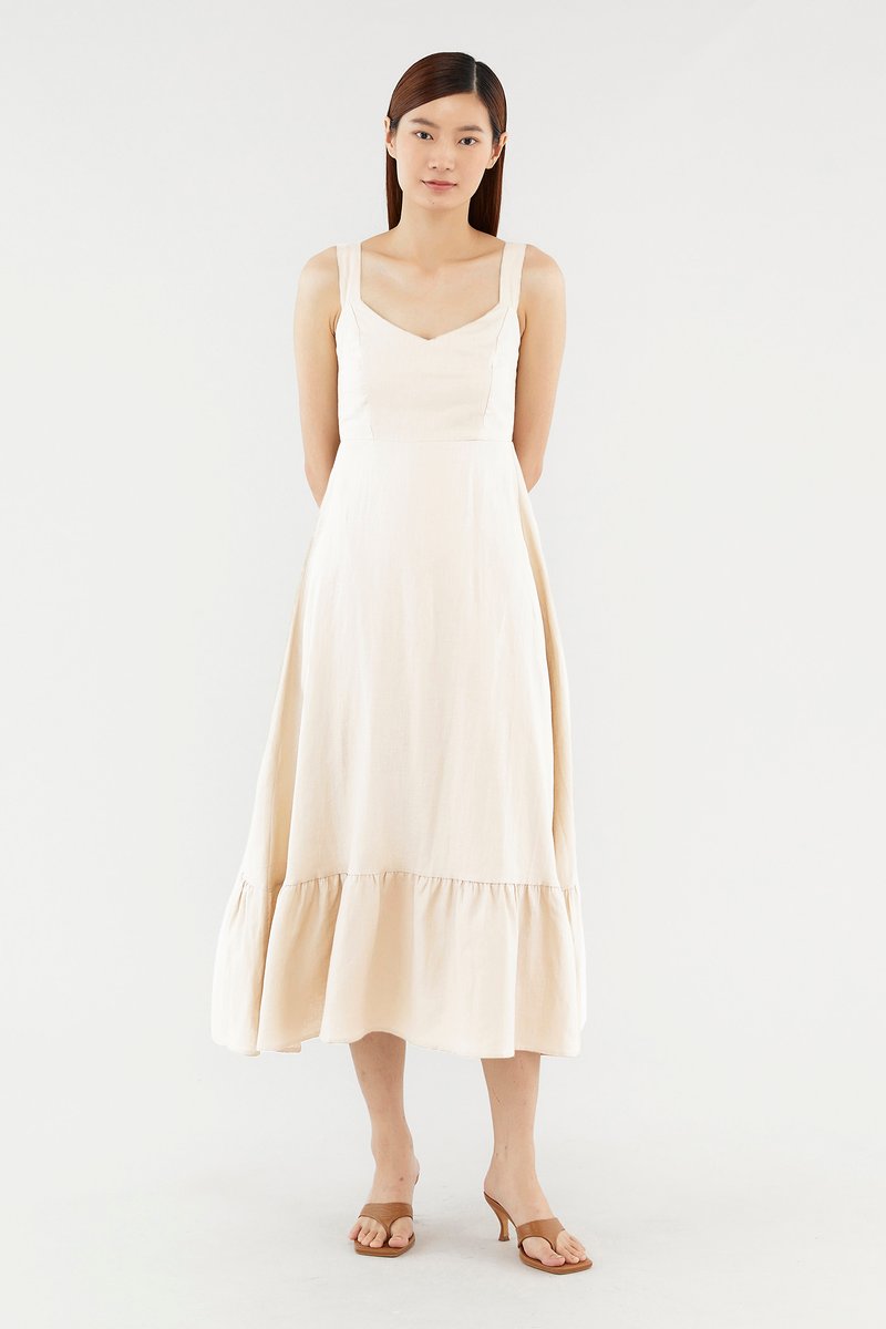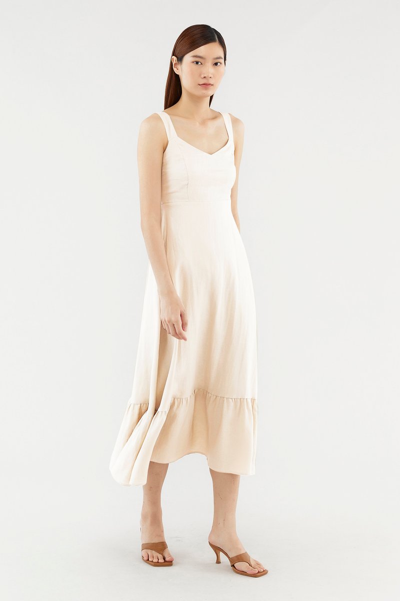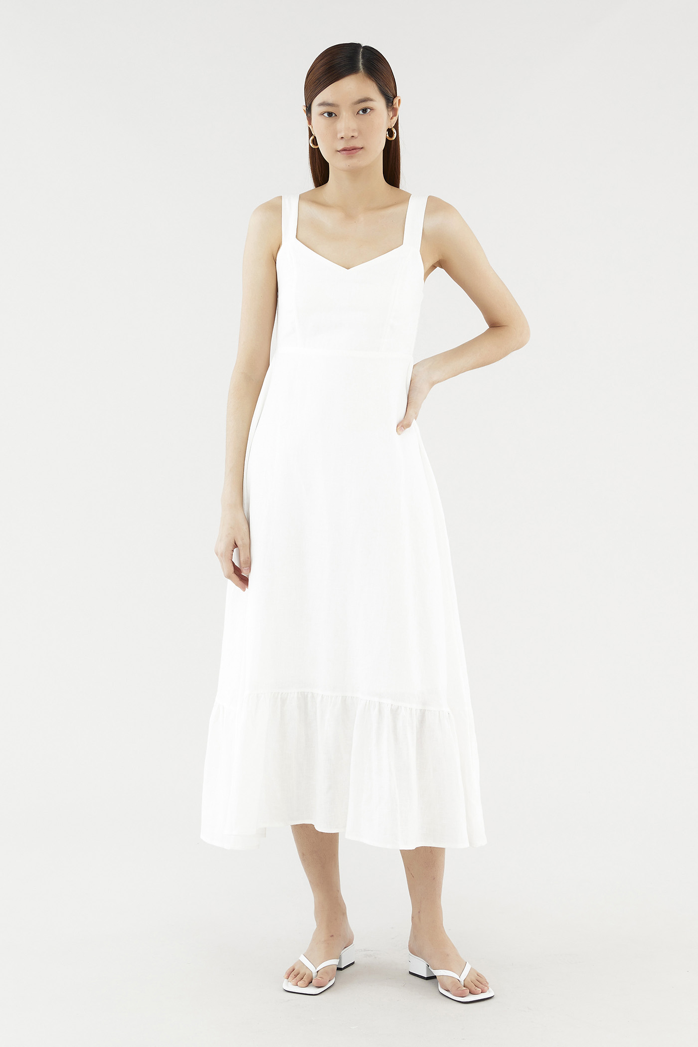 Ready for brighter days. Made from lightweight and fully lined linen, this sleeveless dress features a flattering V-neckline, thick shoulder straps, a smocked back and an A-line skirt with a frilled hem. Fits slim in a midi length.