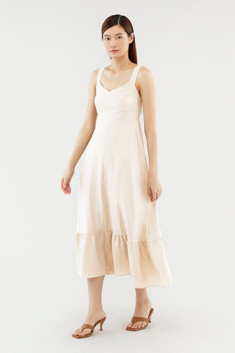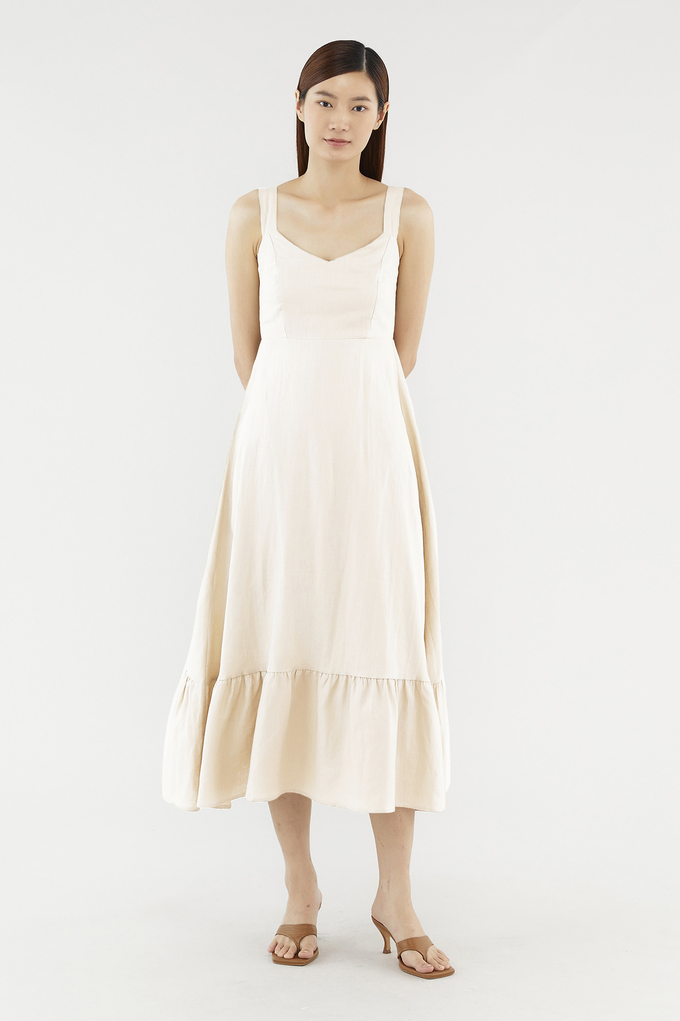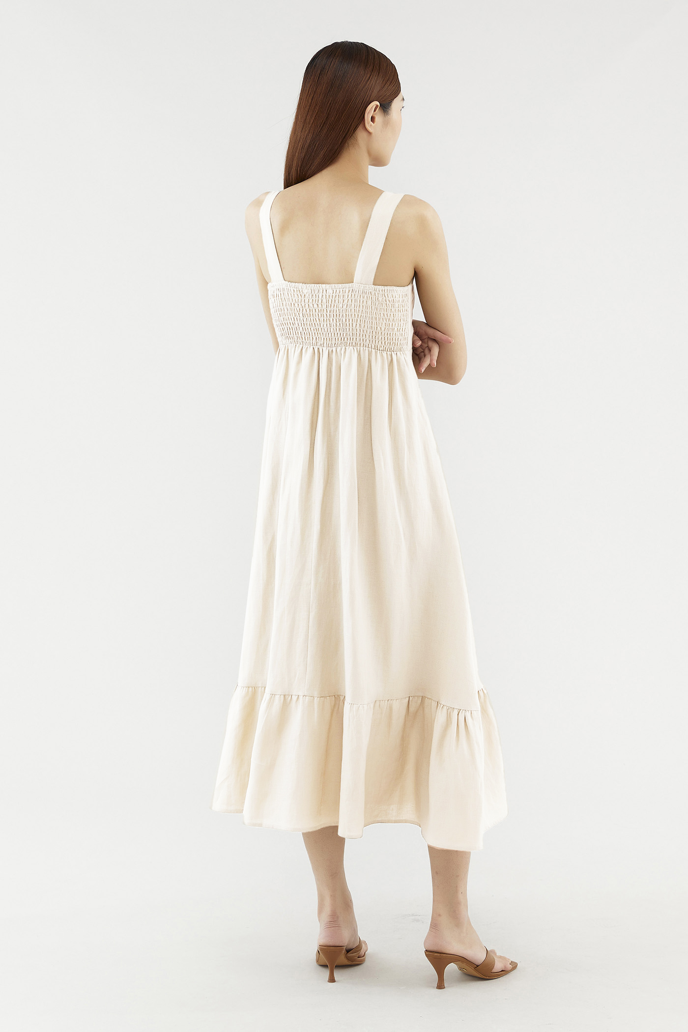 Ready for brighter days. Made from lightweight and fully lined linen, this sleeveless dress features a flattering V-neckline, thick shoulder straps, a smocked back and an A-line skirt with a frilled hem. Fits slim in a midi length.
