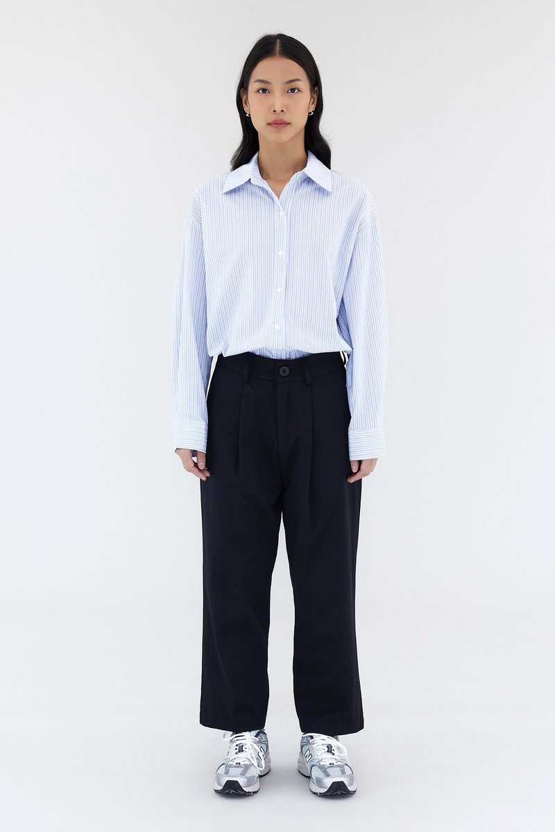 Smart choice. Cut from smooth and gently tailored cotton, these mid-waisted pants feature straight legs, front pleats, belt loops and a zip and button closure. Worn in a relaxed fit.