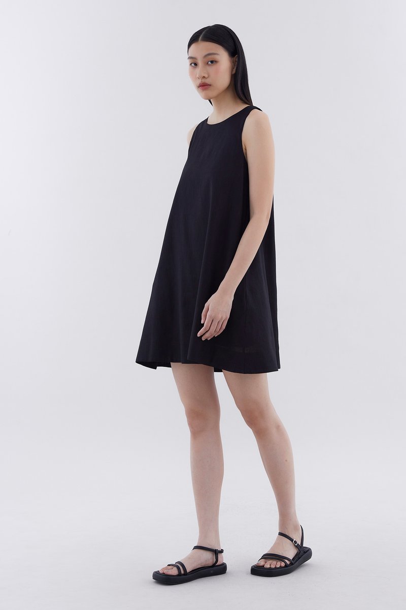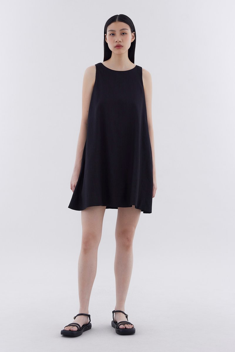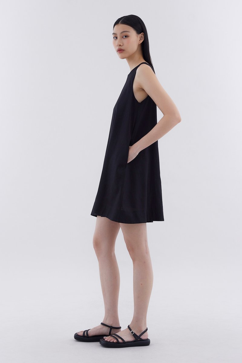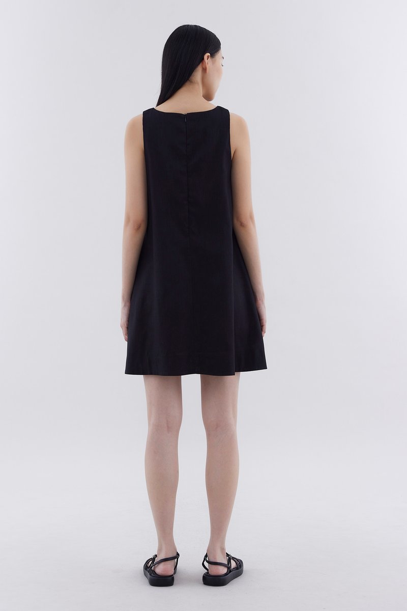 Keep it cool. Made from airy and gently tailored 100% linen, this sleeveless mini dress features cut-in shoulders, two side pockets and a back zip closure. Worn relaxed in a waistless, shift silhouette.