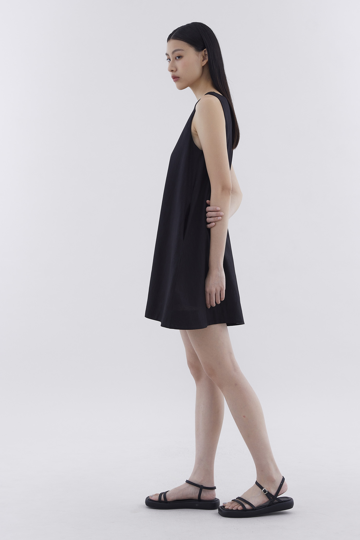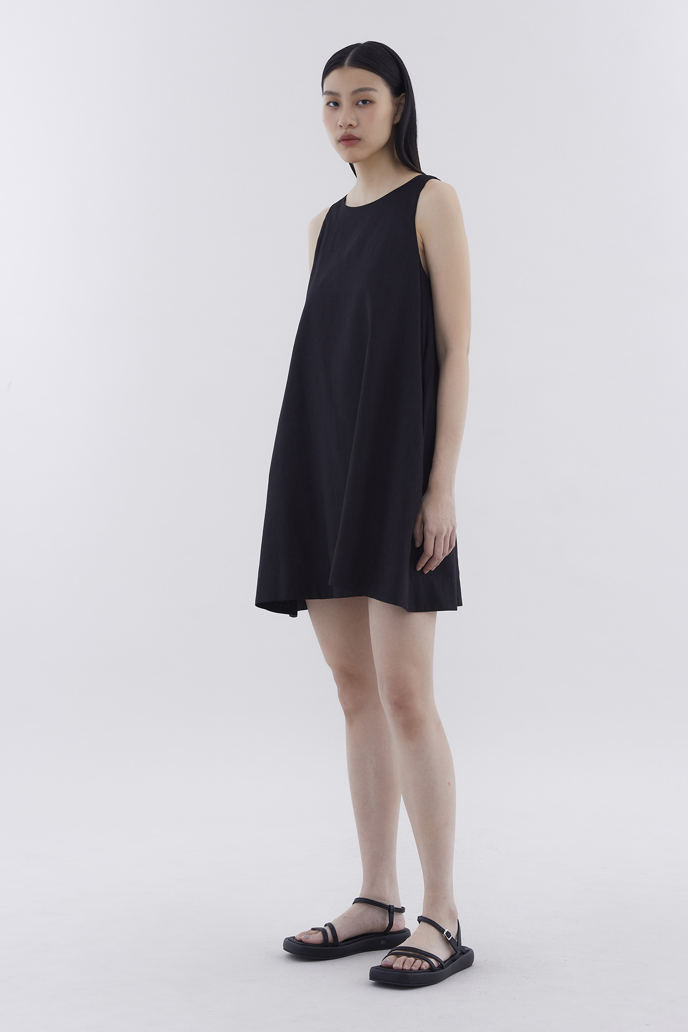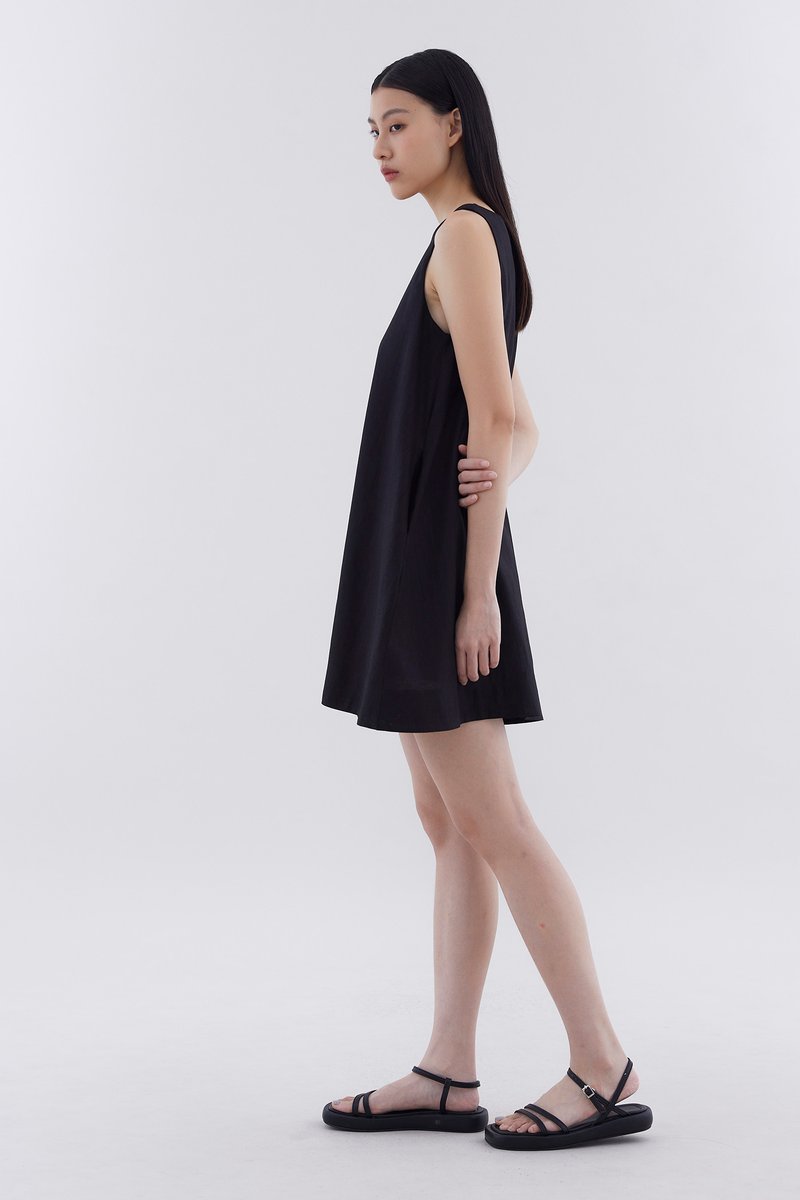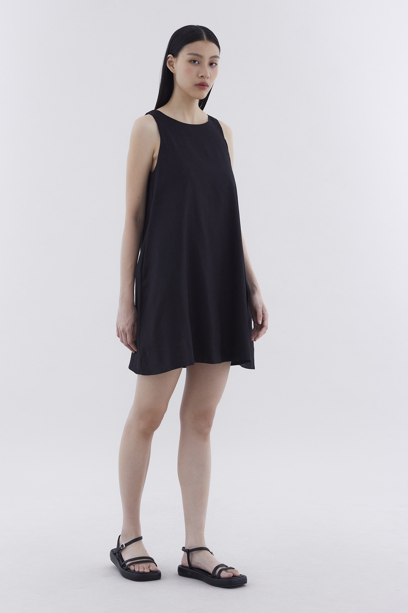 Keep it cool. Made from airy and gently tailored 100% linen, this sleeveless mini dress features cut-in shoulders, two side pockets and a back zip closure. Worn relaxed in a waistless, shift silhouette.