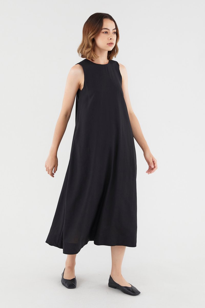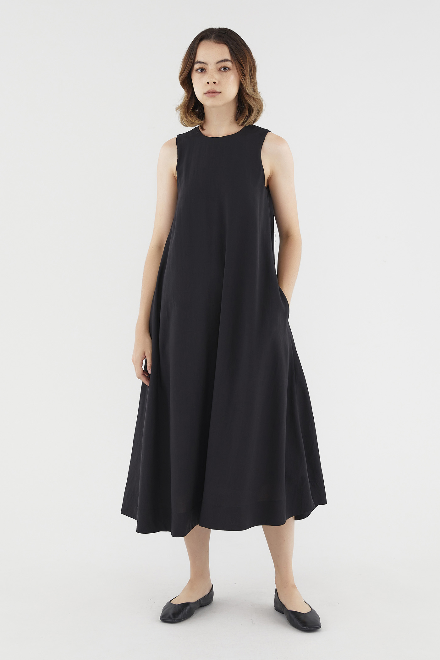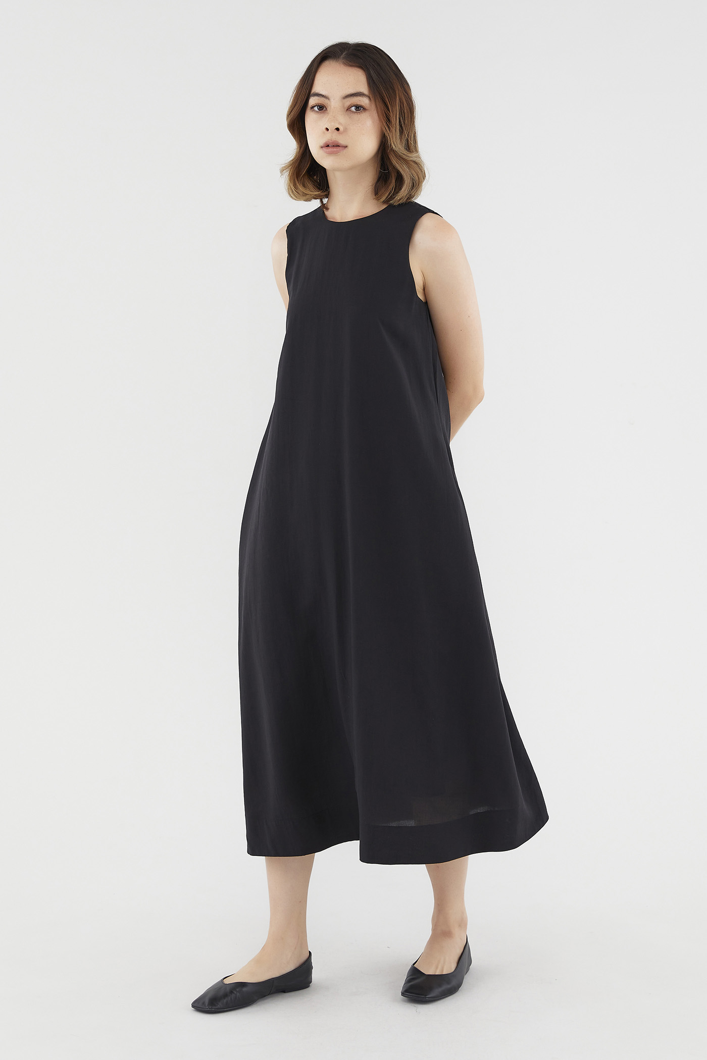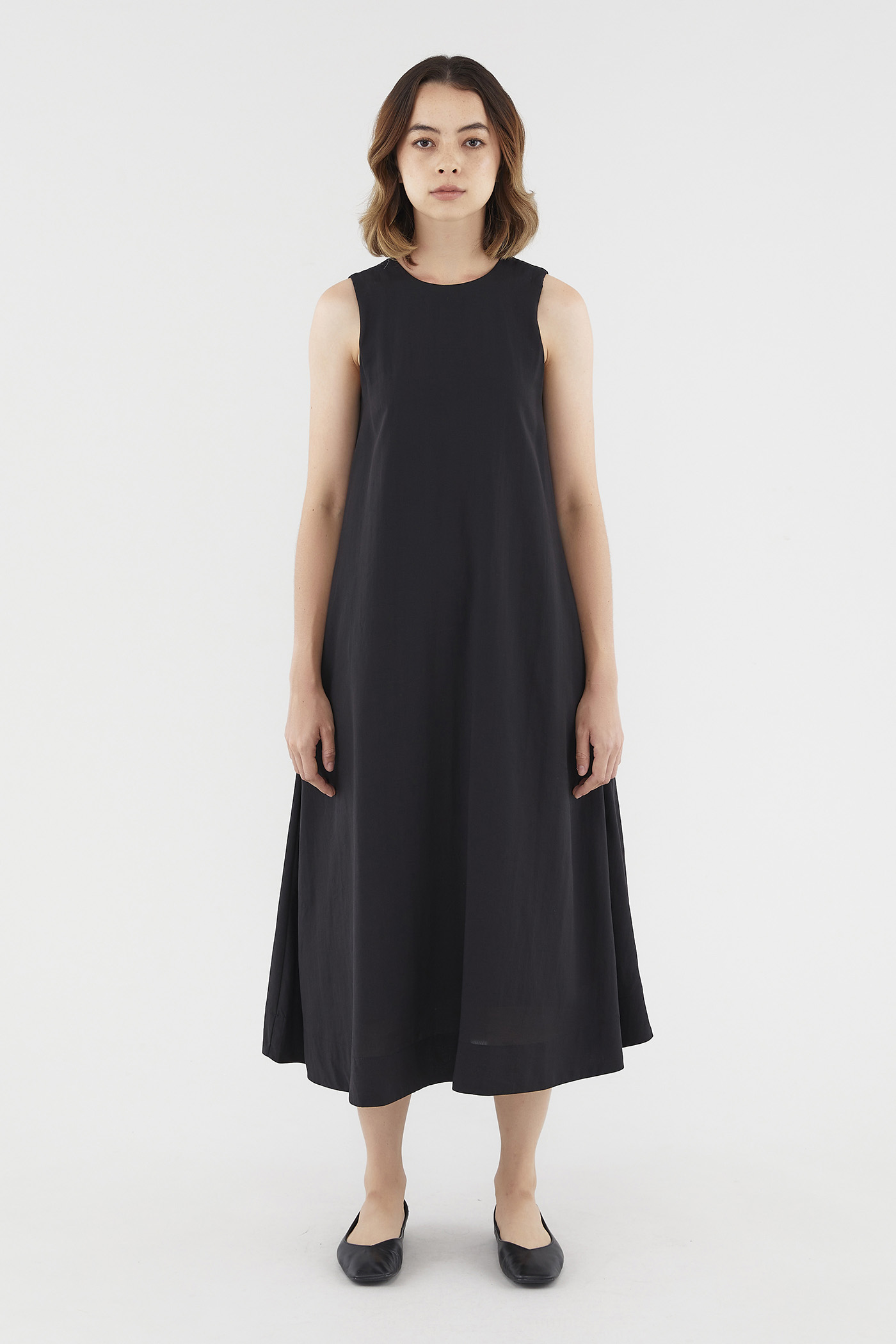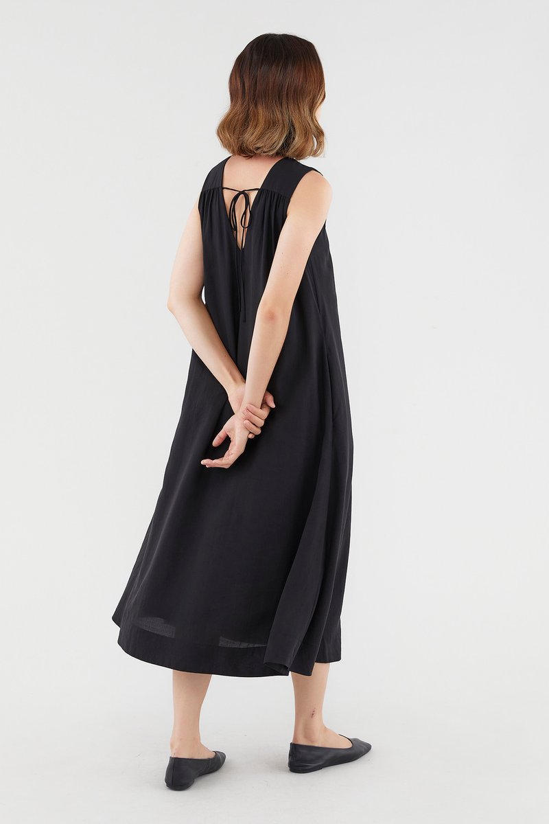 <p><span style="font-weight: 400;">Fabric Composition: 65% Lyocell 25 % Polyester 10% Cotton</span></p> <p><span style="font-weight: 400;">Lining: Full</span></p> <p><span style="font-weight: 400;">Sheerness: Opaque</span></p> <p><span style="font-weight: 400;">Pockets: Two pockets on the side</span></p> <p><span style="font-weight: 400;">This one’s got your back. Made from smooth and non-stretch fabric with a structured drape, this sleeveless midi dress features a round neckline, cut-in shoulders and a V-shaped back with a self-tying string closure. Fits relaxed in a waistless, A-line silhouette. </span></p> <p><span style="font-weight: 400;">Care Instructions: Do not soak / Do not bleach / Handwash or Machine wash on gentle mode / Do not machine dry / Iron using low heat</span></p>