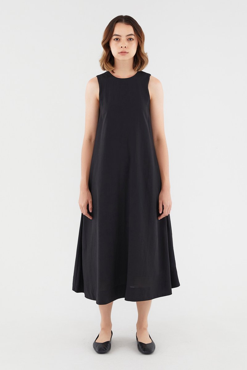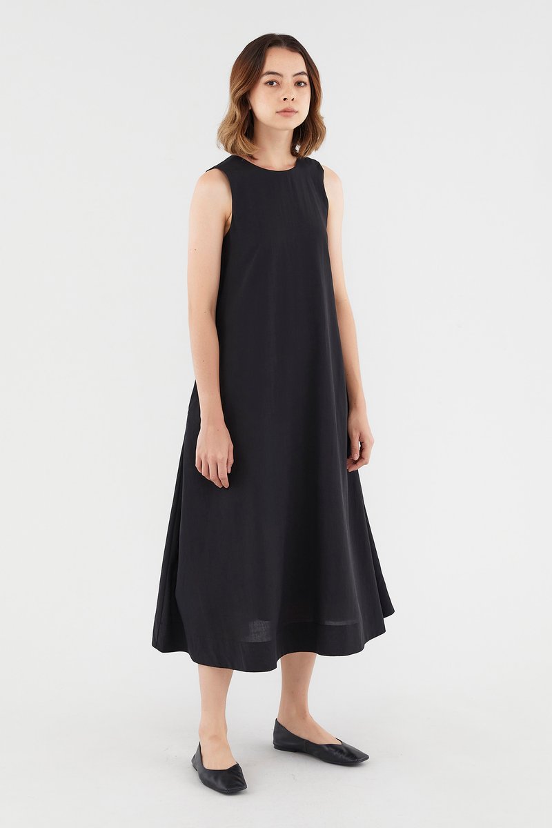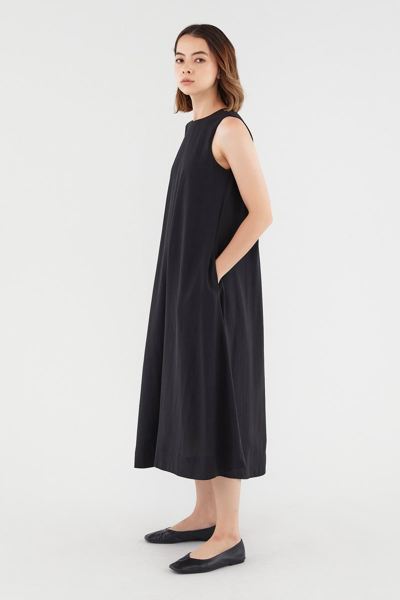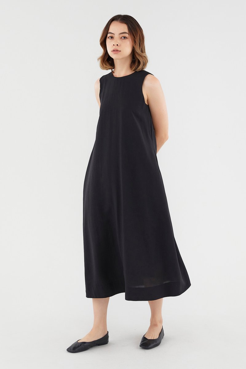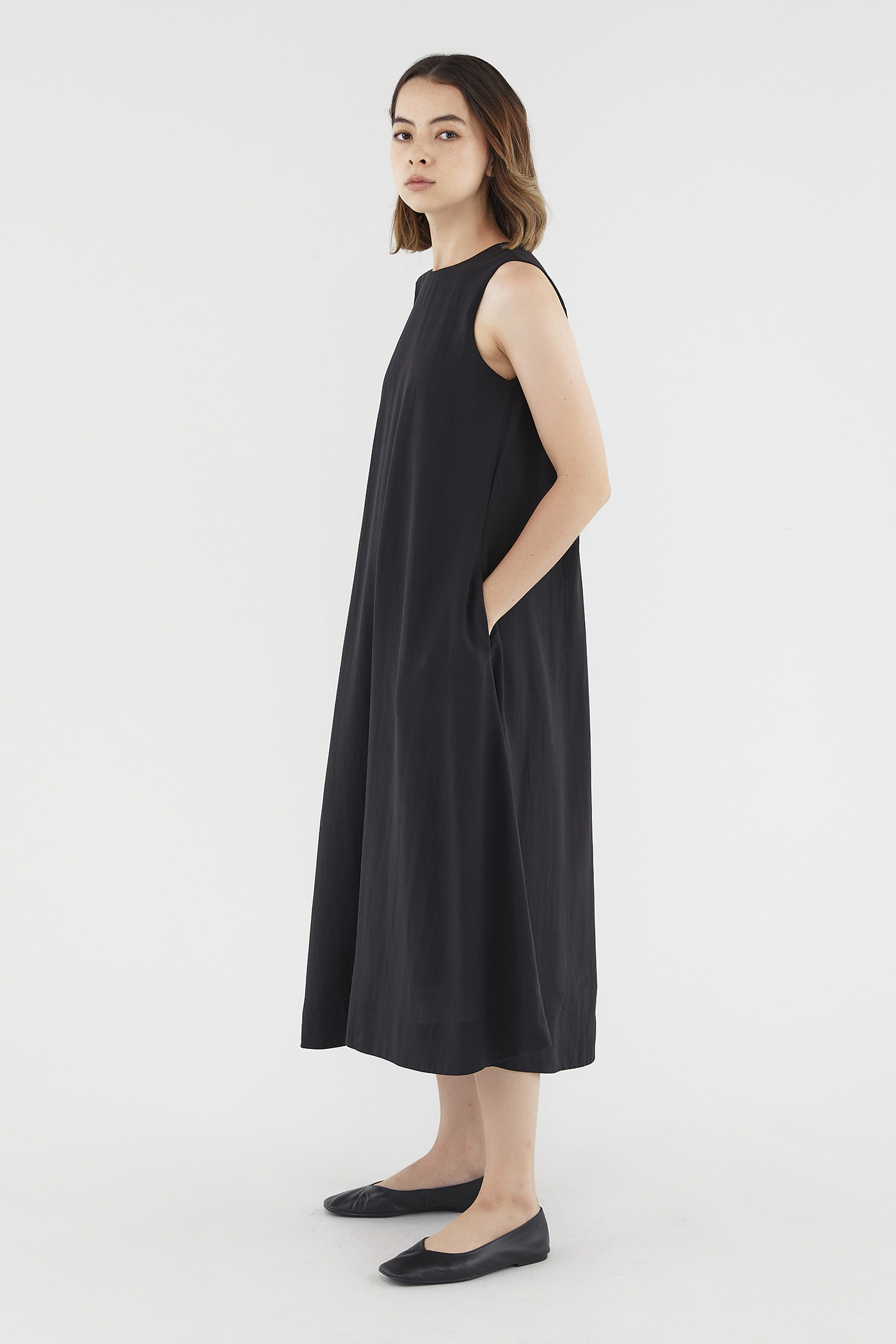 <p><span style="font-weight: 400;">Fabric Composition: 65% Lyocell 25 % Polyester 10% Cotton</span></p> <p><span style="font-weight: 400;">Lining: Full</span></p> <p><span style="font-weight: 400;">Sheerness: Opaque</span></p> <p><span style="font-weight: 400;">Pockets: Two pockets on the side</span></p> <p><span style="font-weight: 400;">This one’s got your back. Made from smooth and non-stretch fabric with a structured drape, this sleeveless midi dress features a round neckline, cut-in shoulders and a V-shaped back with a self-tying string closure. Fits relaxed in a waistless, A-line silhouette. </span></p> <p><span style="font-weight: 400;">Care Instructions: Do not soak / Do not bleach / Handwash or Machine wash on gentle mode / Do not machine dry / Iron using low heat</span></p>