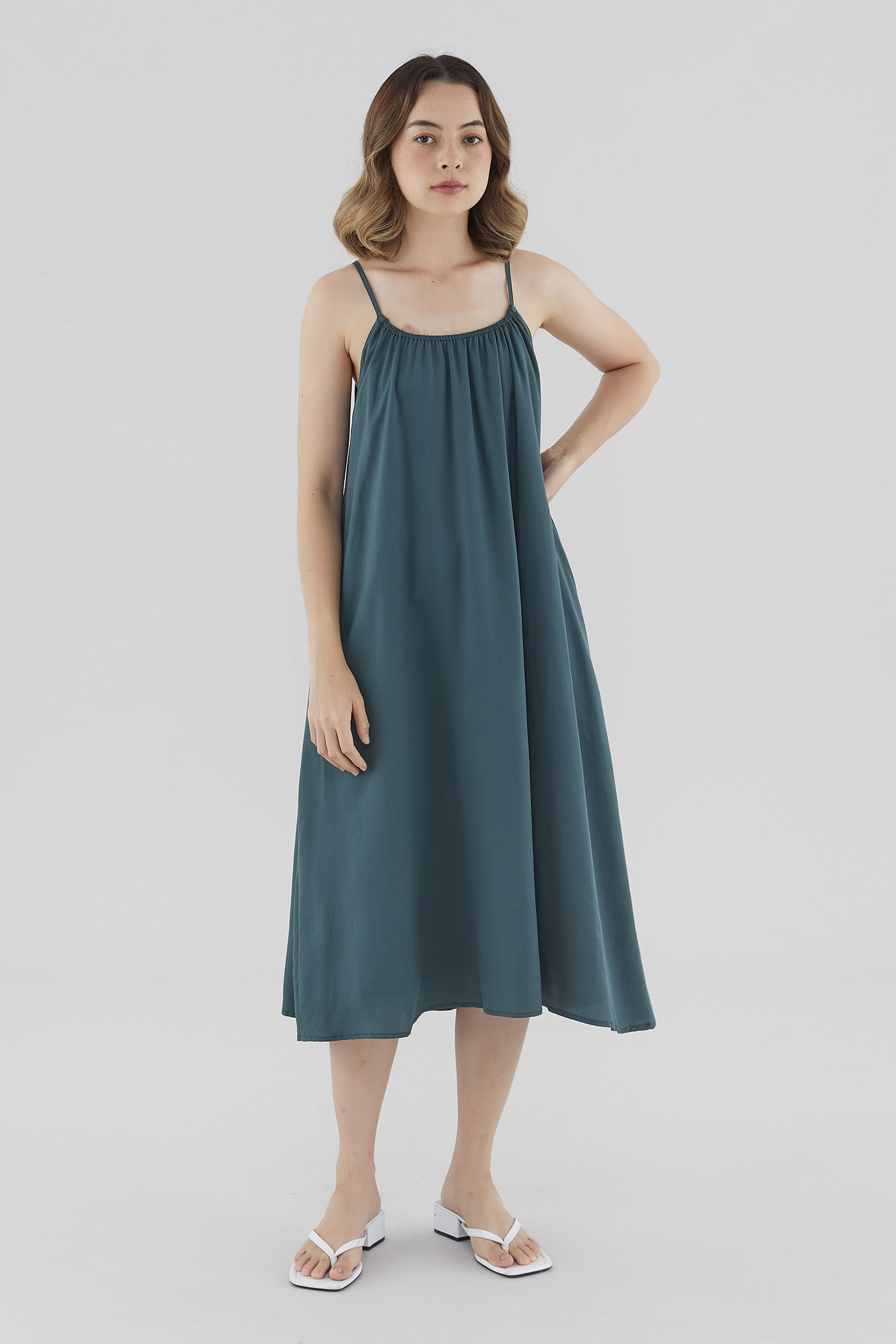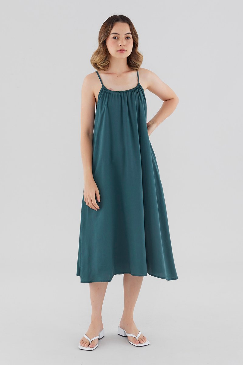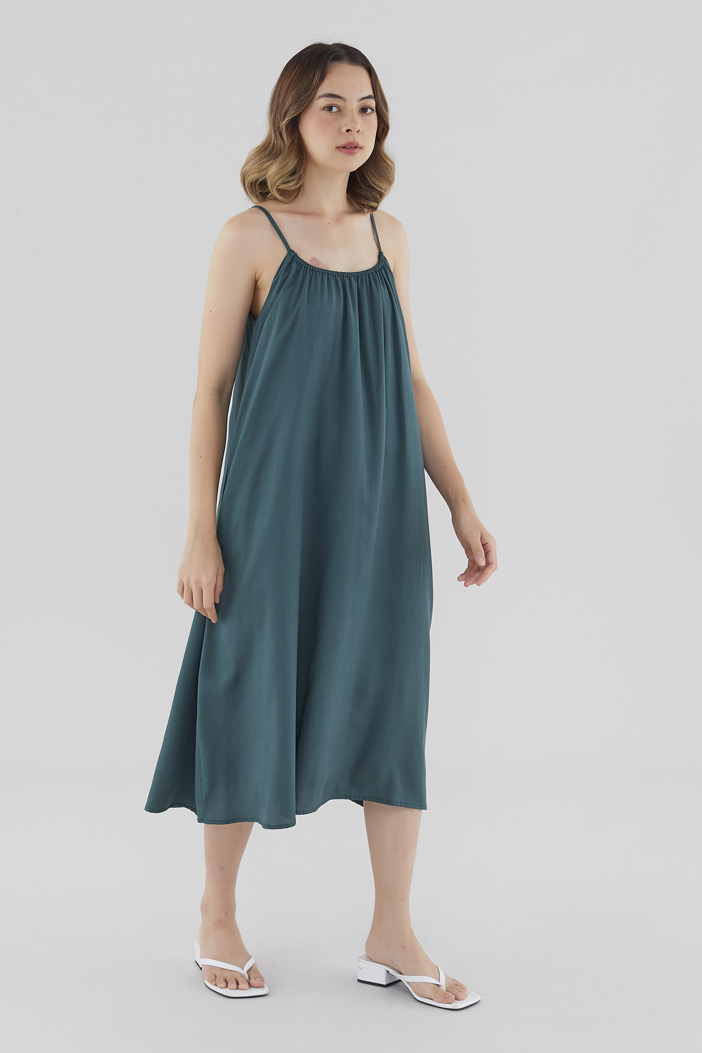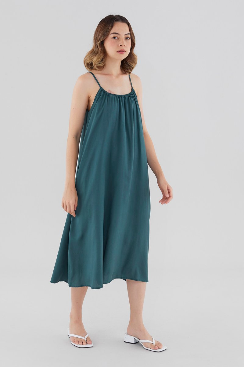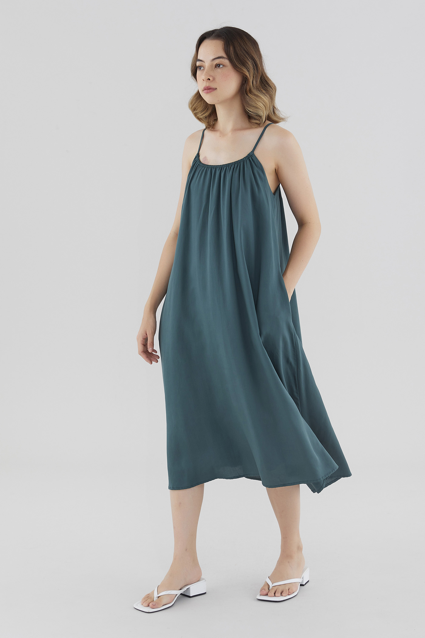 For effortless days. Made from smooth and flowy lyocell, this sleeveless midi dress features an elasticated round neckline, slim adjustable straps and a back keyhole opening with a tie-strap closure. Fits relaxed in a waistless tent silhouette.