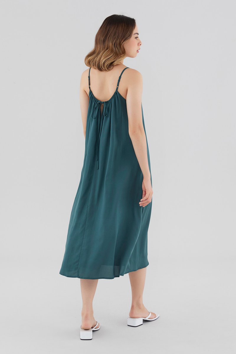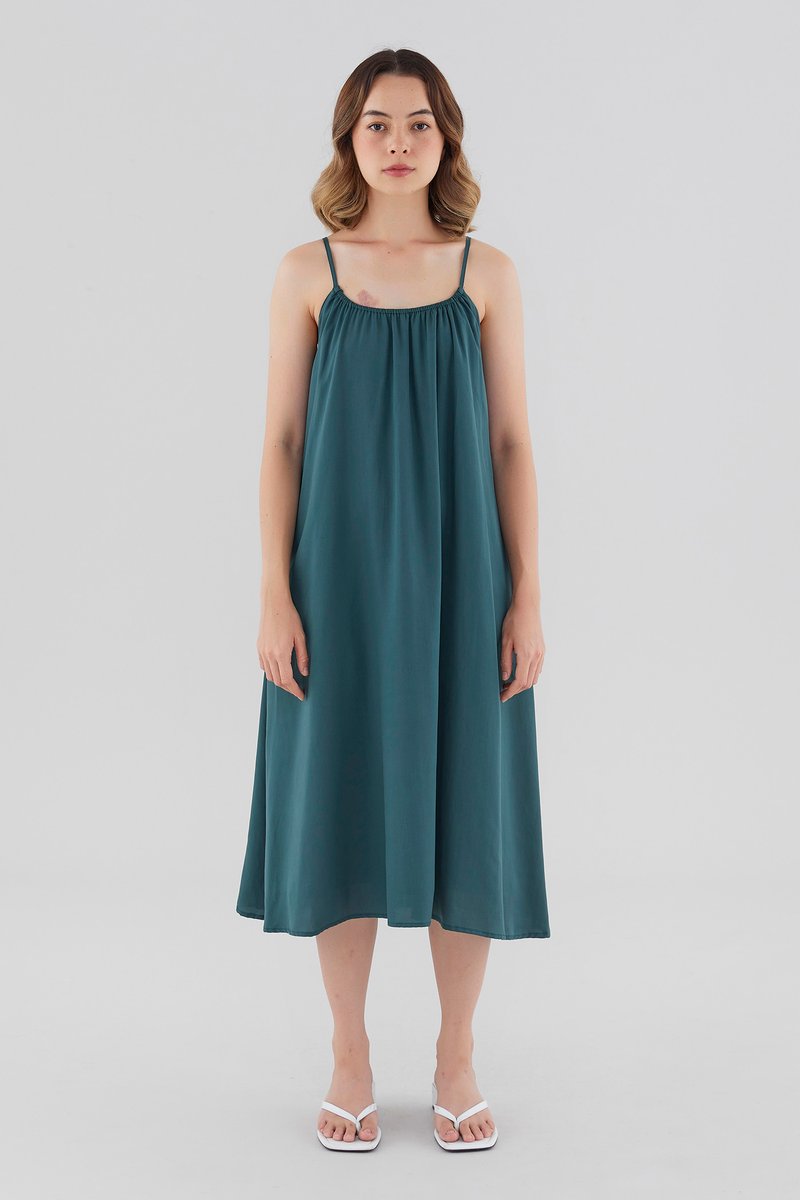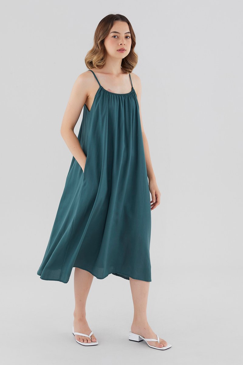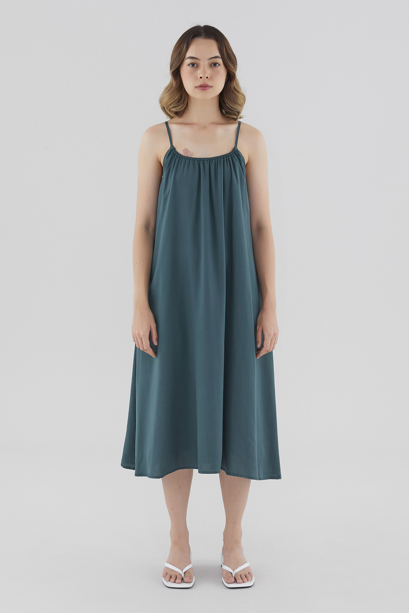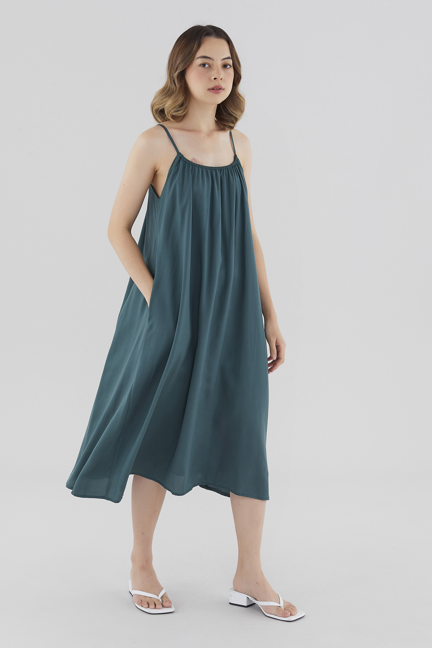 For effortless days. Made from smooth and flowy lyocell, this sleeveless midi dress features an elasticated round neckline, slim adjustable straps and a back keyhole opening with a tie-strap closure. Fits relaxed in a waistless tent silhouette.