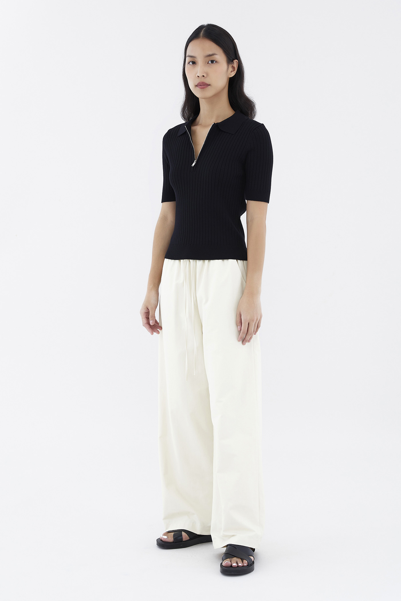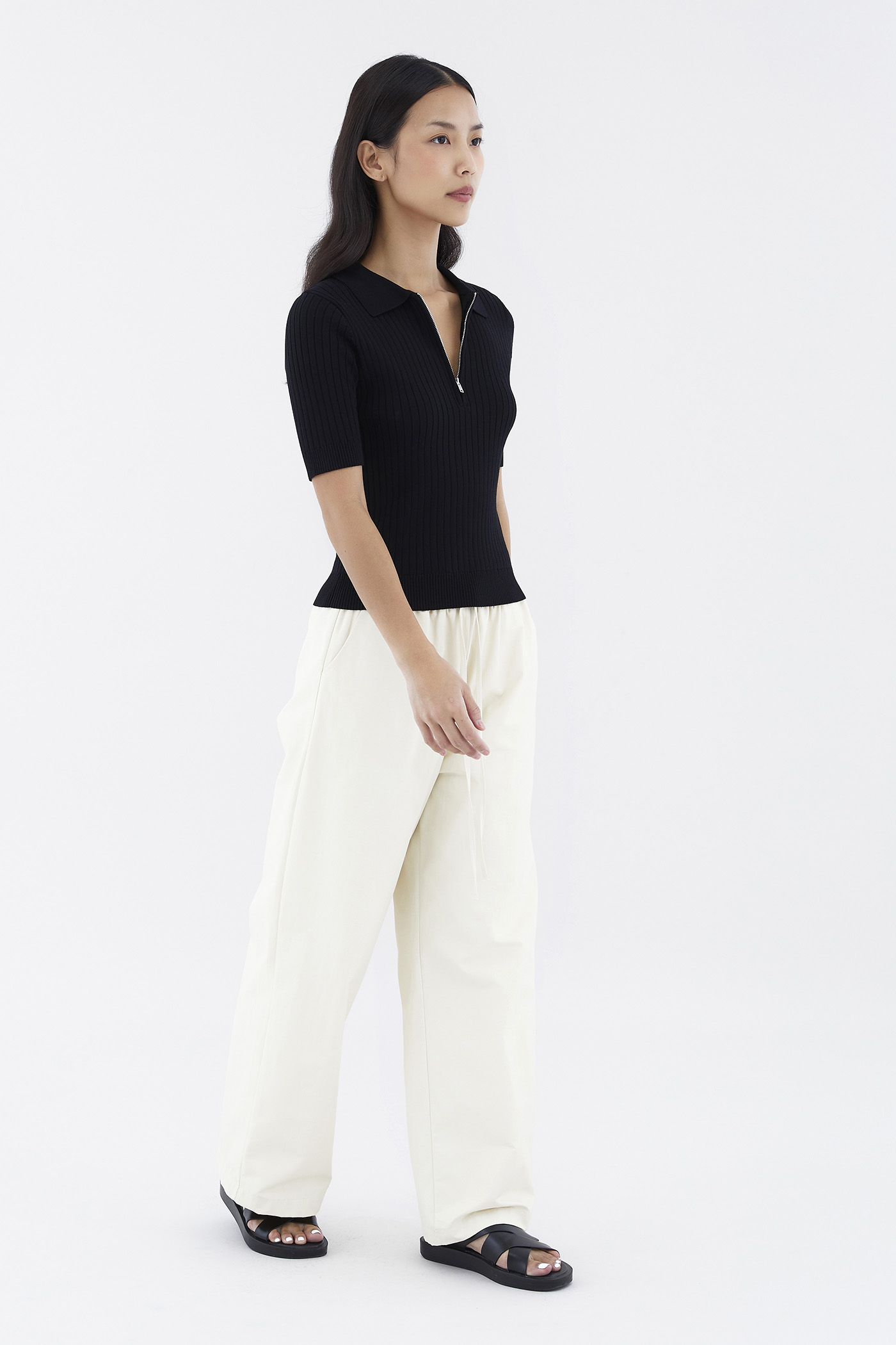 Cosy, but make it edgy. Made from stretchy knit with a chunky rib, this polo top features short fitted sleeves, a collared neckline and a front zip closure. Worn in a slim fit.