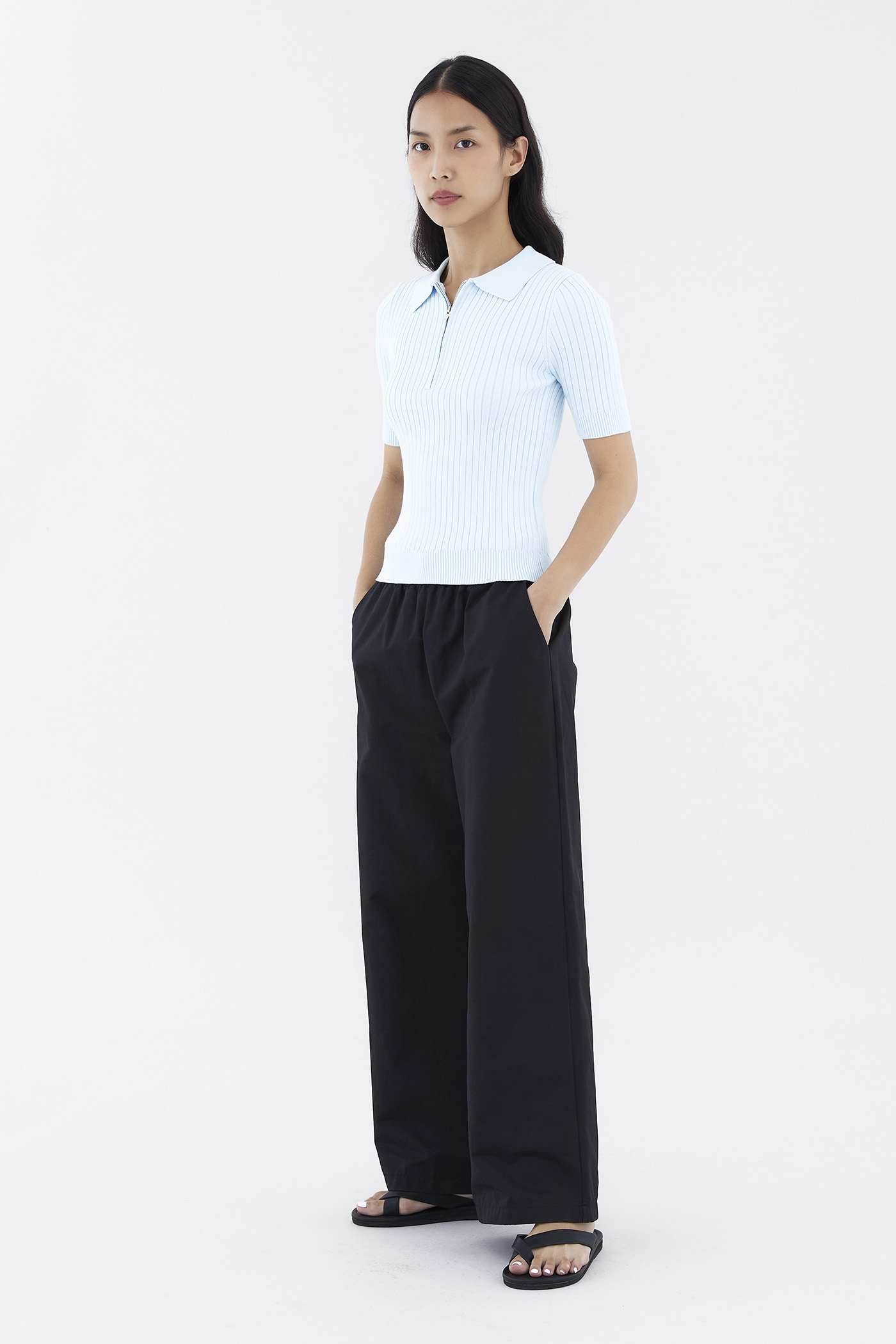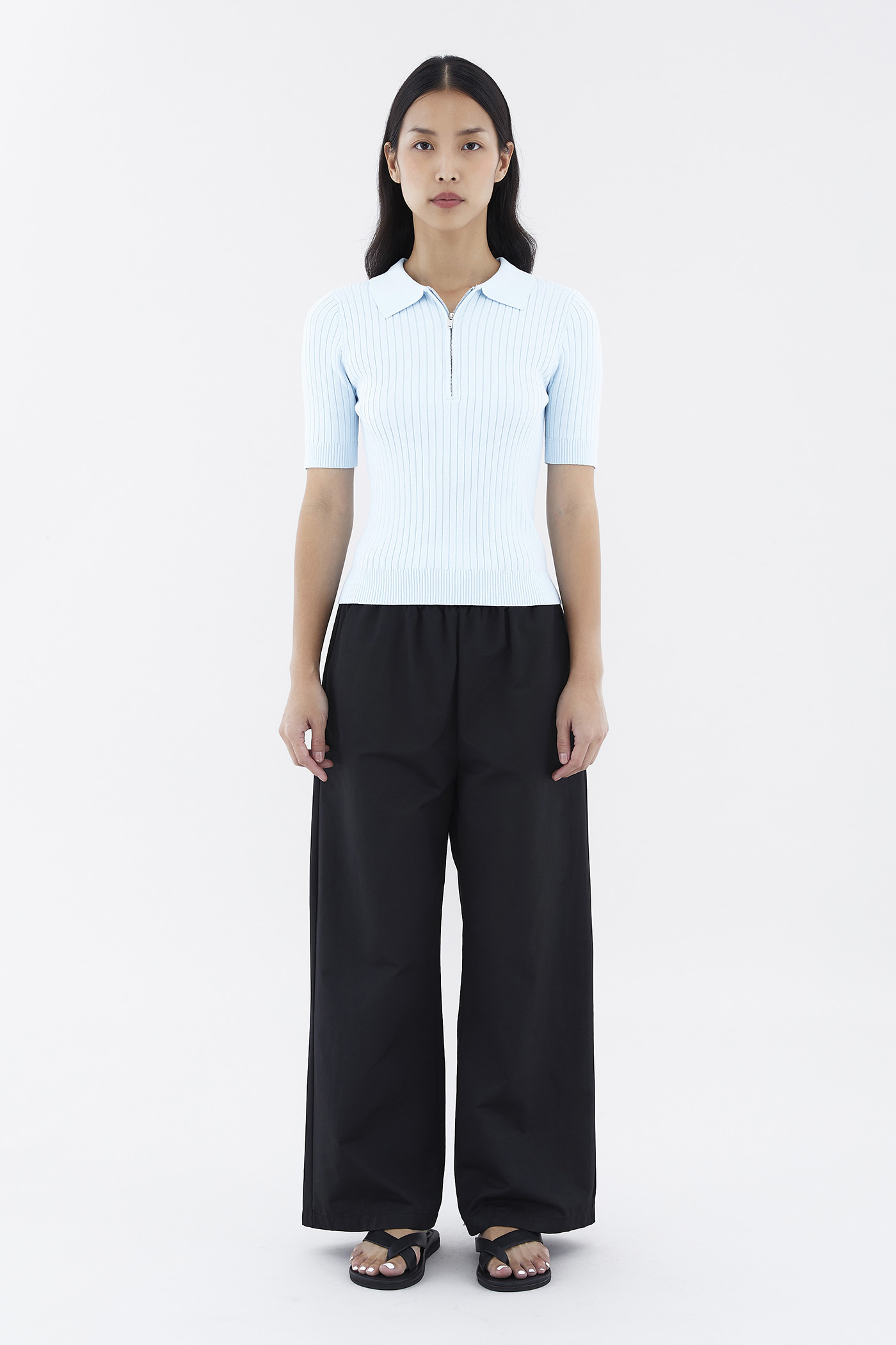 Cosy, but make it edgy. Made from stretchy knit with a chunky rib, this polo top features short fitted sleeves, a collared neckline and a front zip closure. Worn in a slim fit.