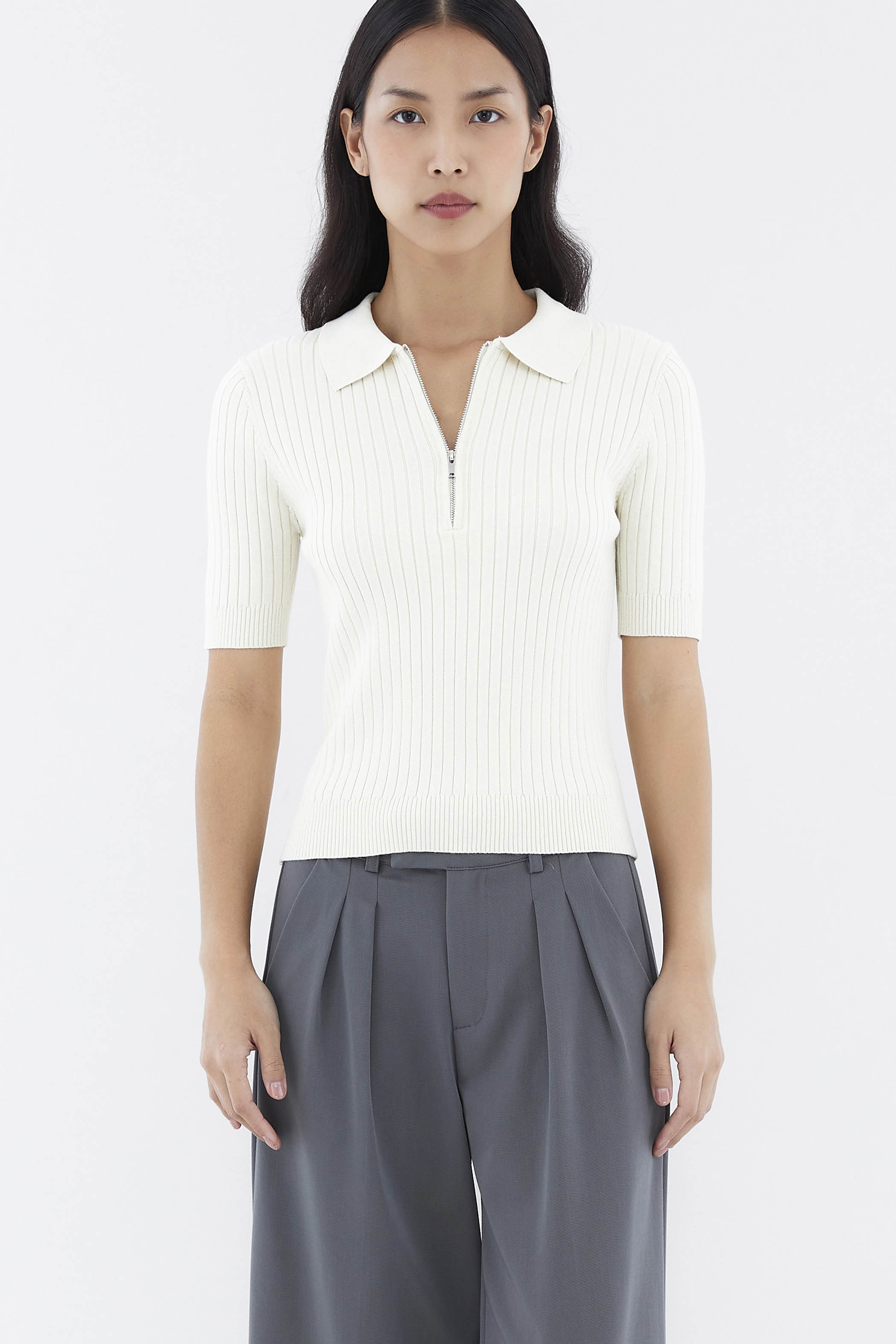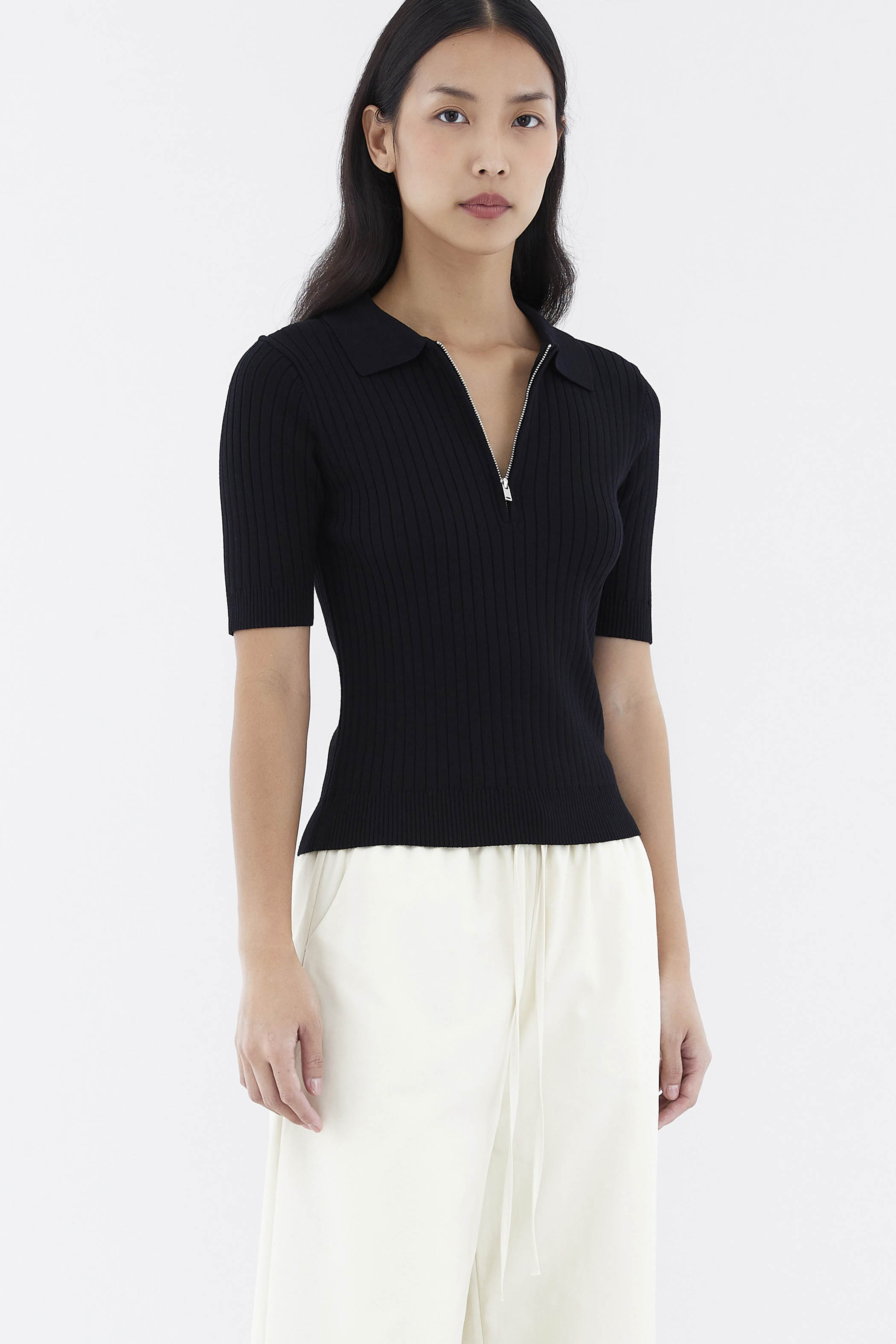 Cosy, but make it edgy. Made from stretchy knit with a chunky rib, this polo top features short fitted sleeves, a collared neckline and a front zip closure. Worn in a slim fit.