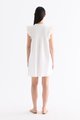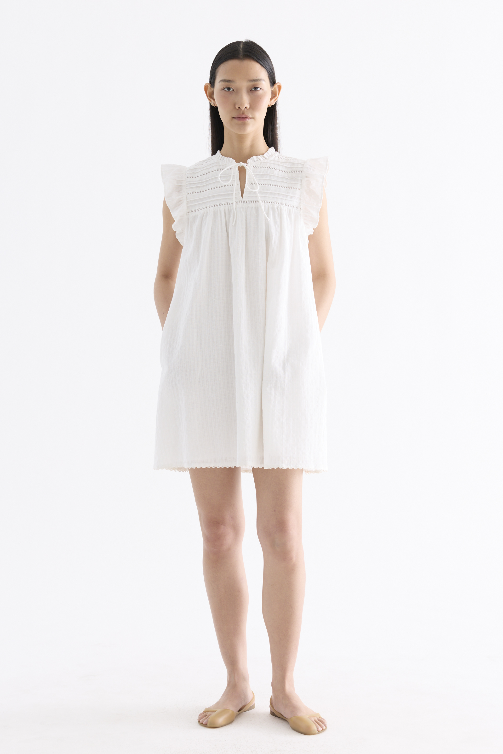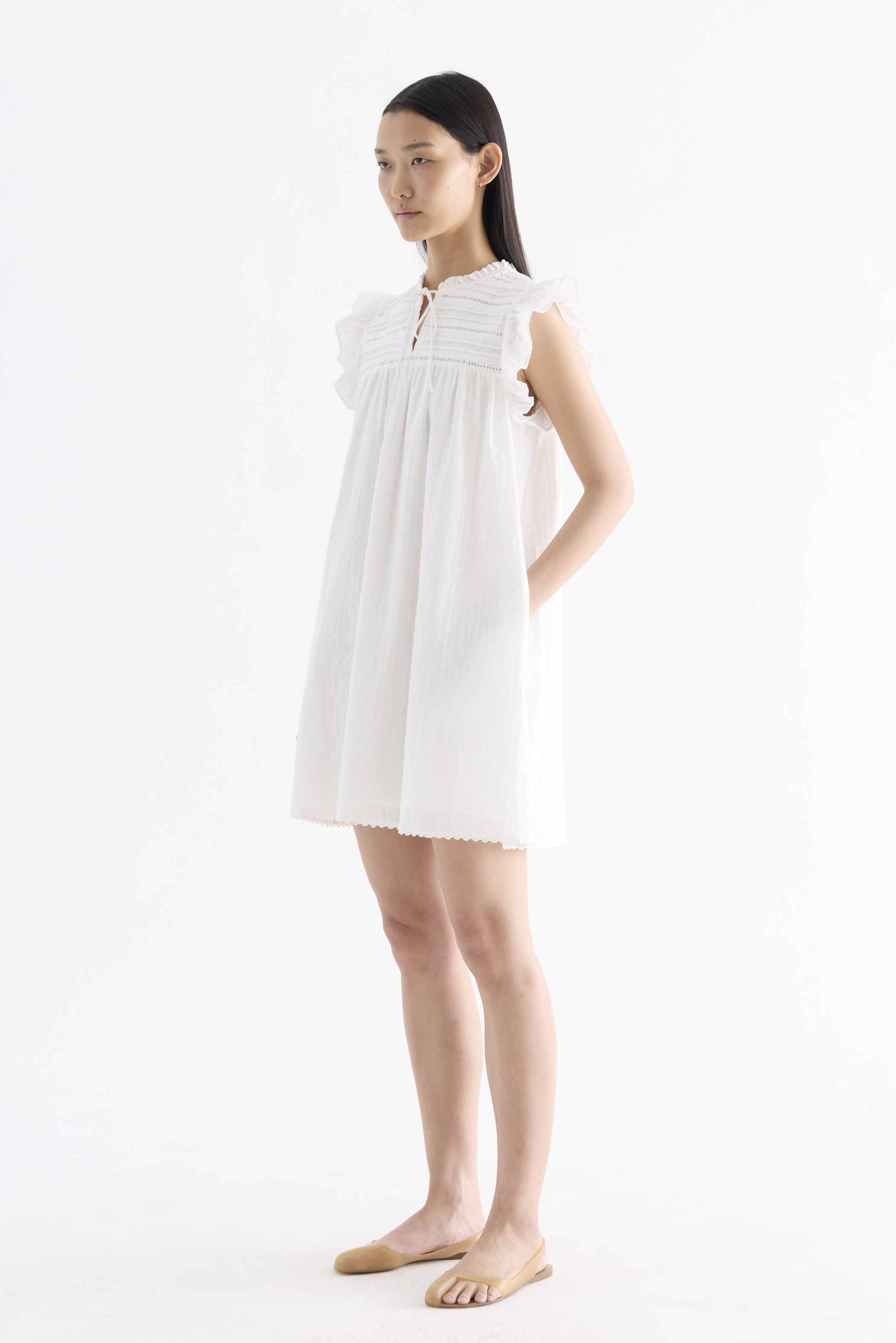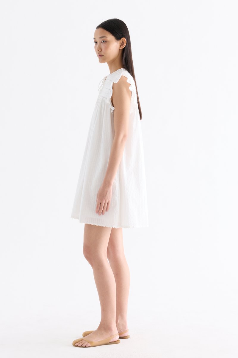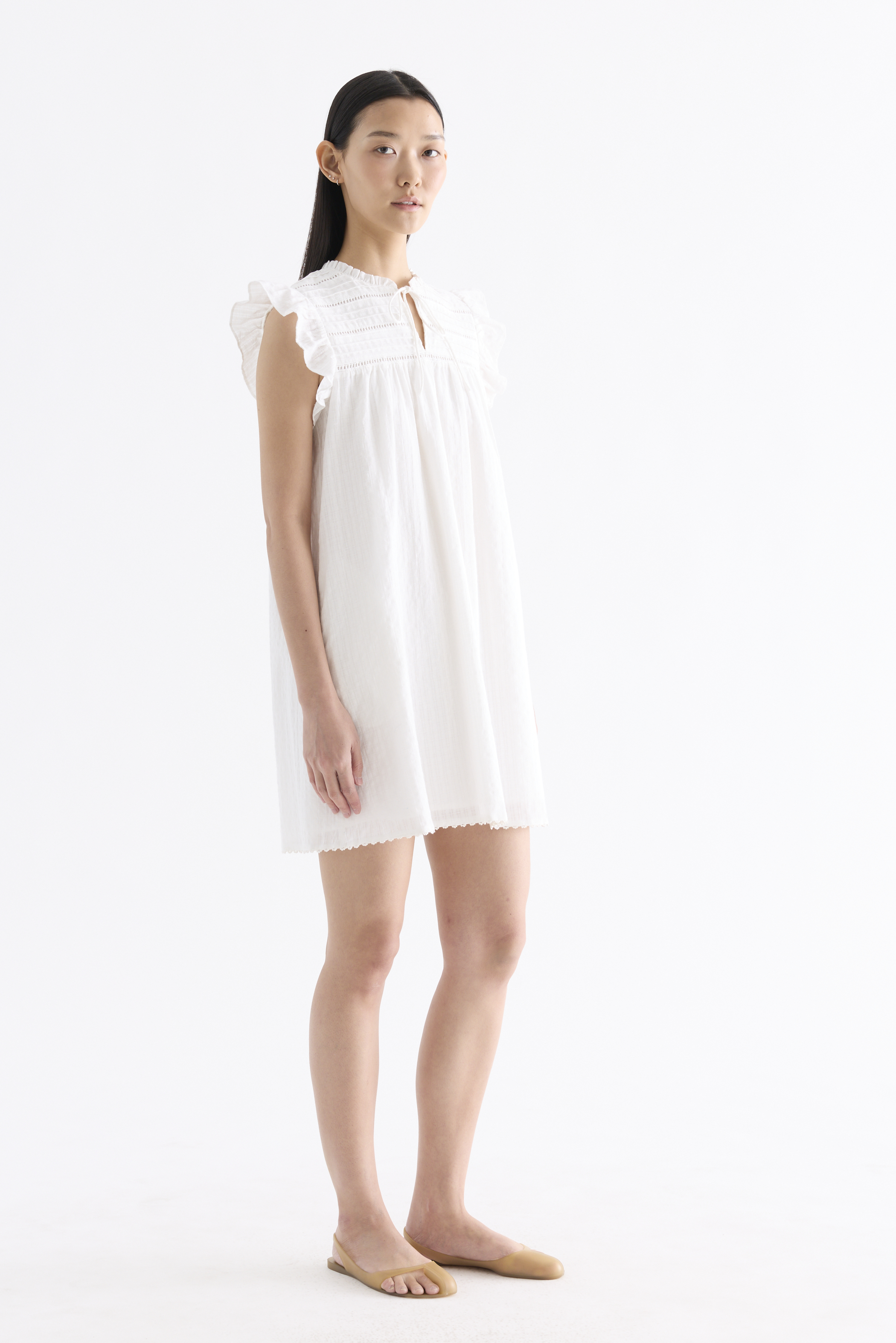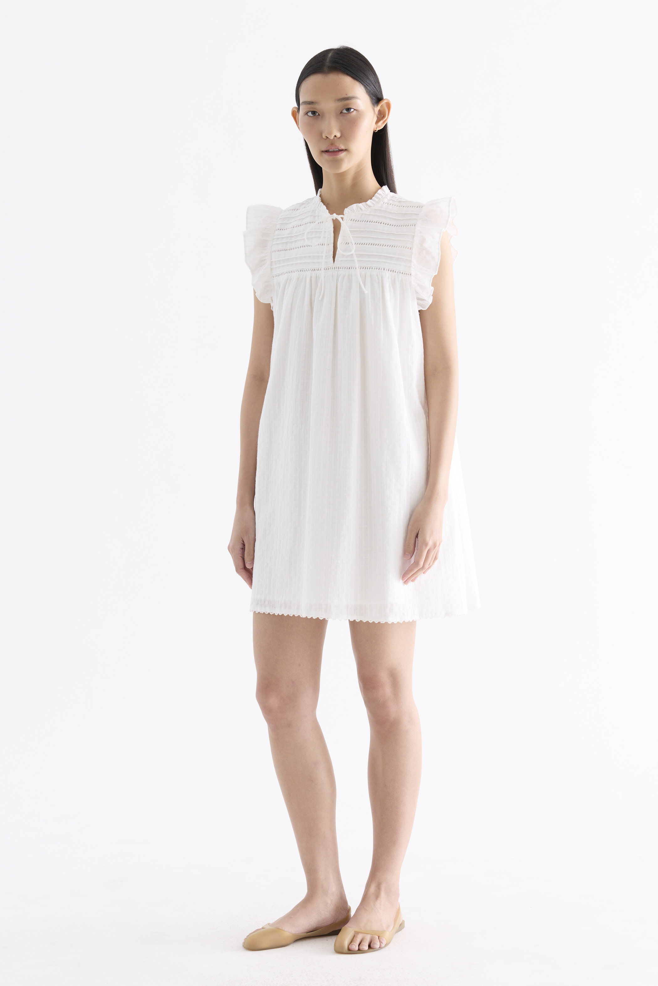 Spring ahead. Cut from airy and softly structured seersucker cotton, this dress features flutter cap sleeves, a round frill-trimmed neckline, front keyhole opening with a tie-strap, as well as pleat and lace details. Fits slim and above the knee.