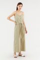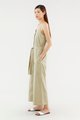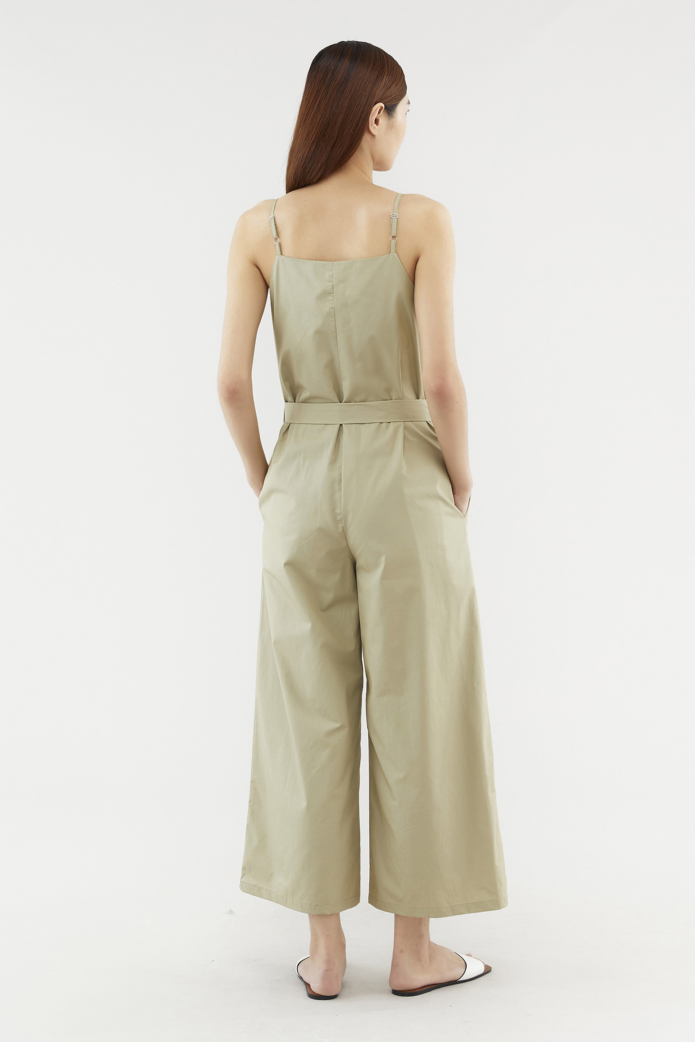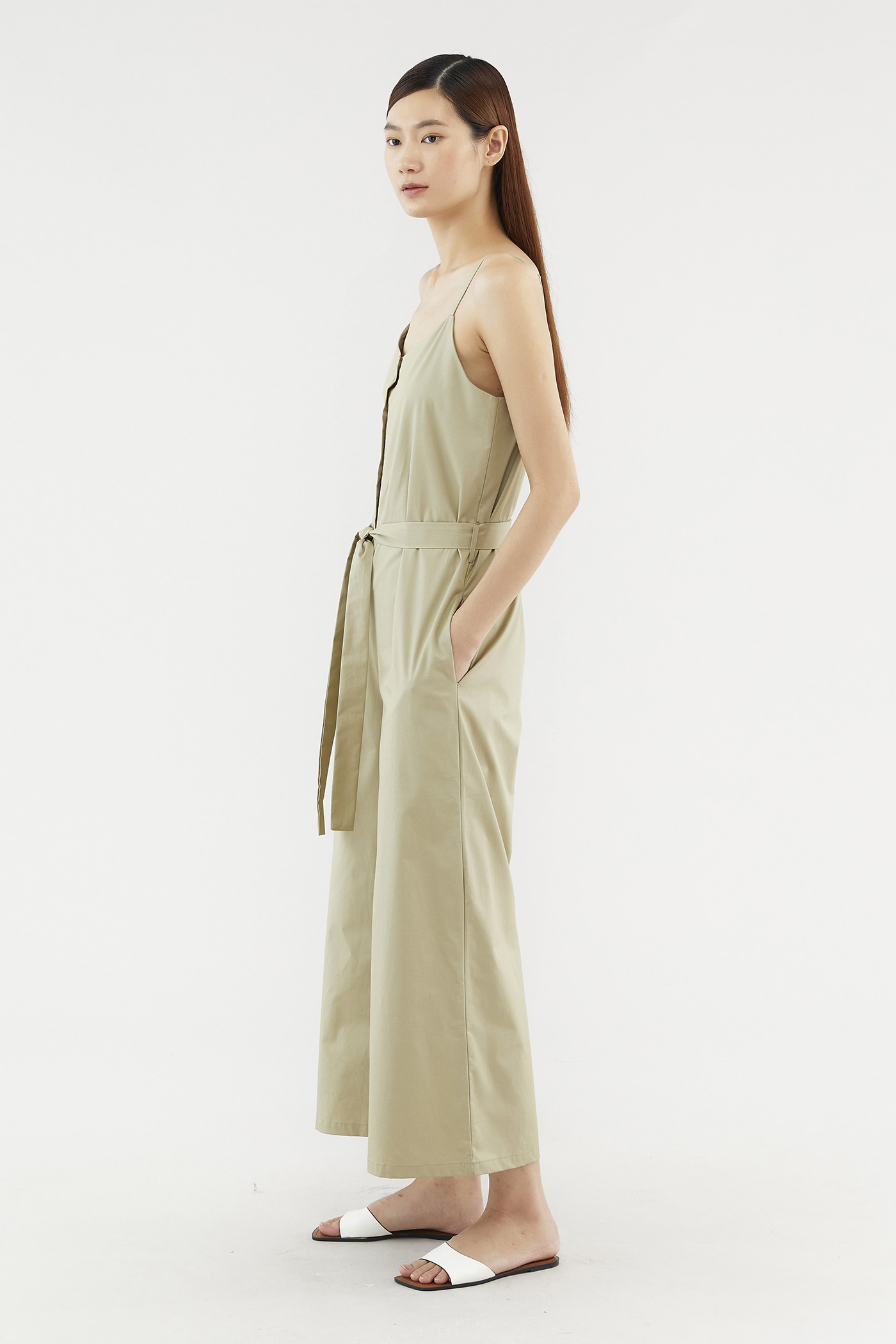 This sleeveless jumpsuit is made from a fully lined smooth cotton with no stretch. It has a wide neckline with adjustable slim shoulder straps featuring button through detail on the front. Worn in an oversized fit in a full length with wide-legged bottoms.